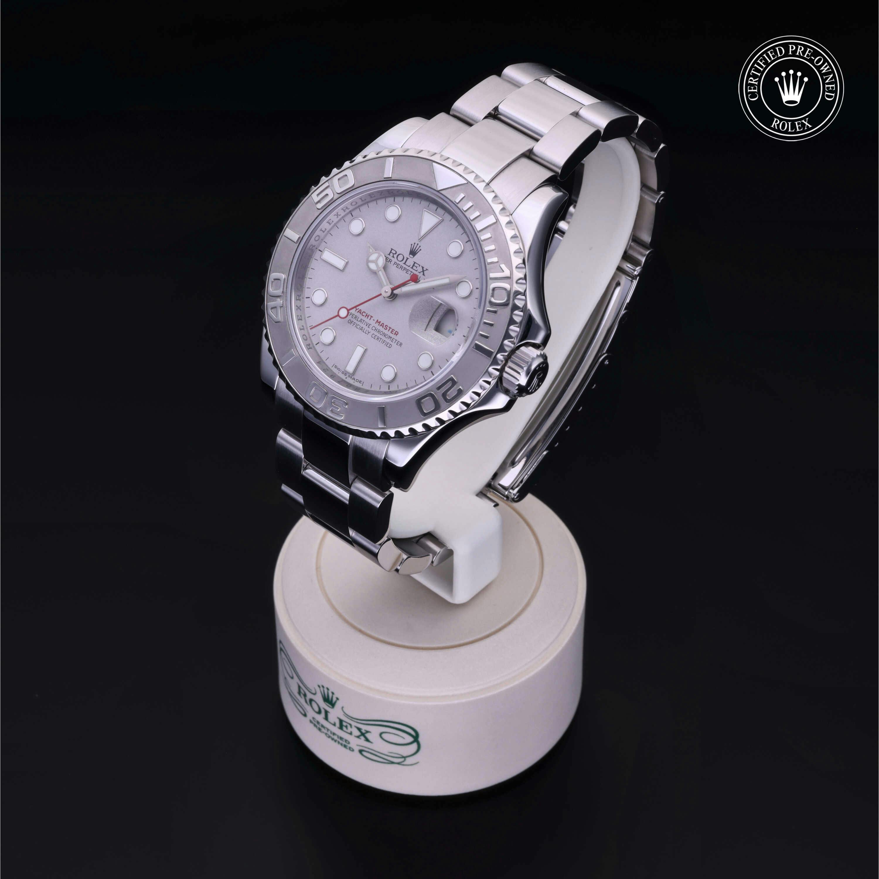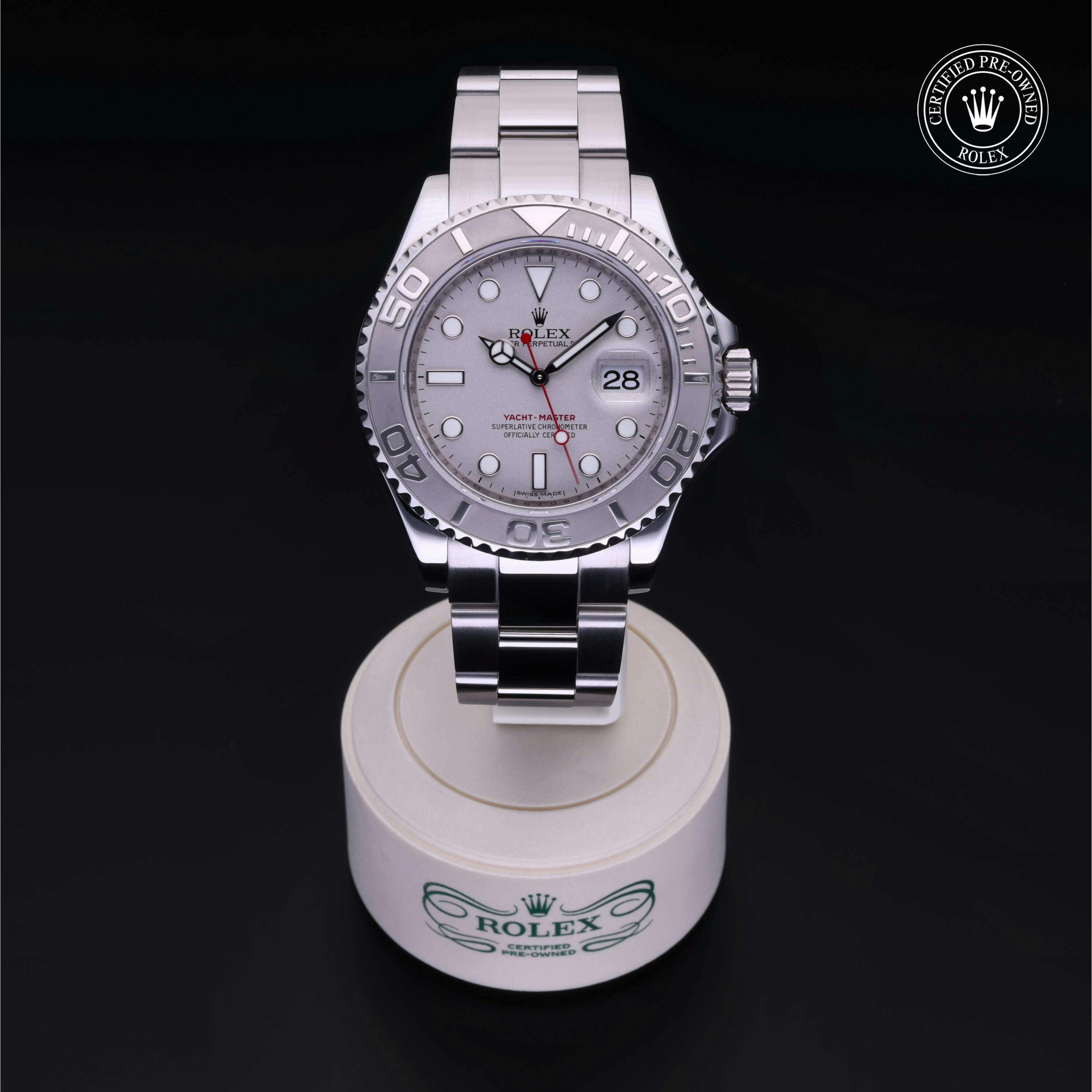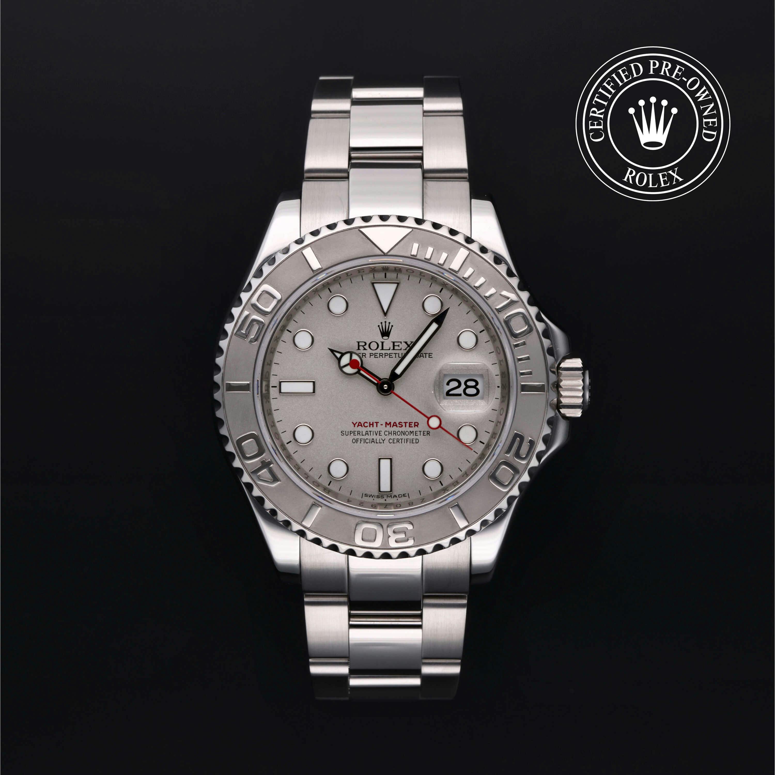 Rolex Certified Pre-Owned Yacht-Master (16622) self - winding automatic watch, features a 40mm stainless steel case with a platinum bidirectional rotating bezel surrounding a platinum dial on a stainless steel oyster bracelet. Functions include hours, minutes, seconds and date. This watch has received Rolex-authorized service and certification. It does not come with the original box or papers, but includes a custom Rolex Certified Pre-Owned hang tag, travel pouch and RCPO international warranty card.