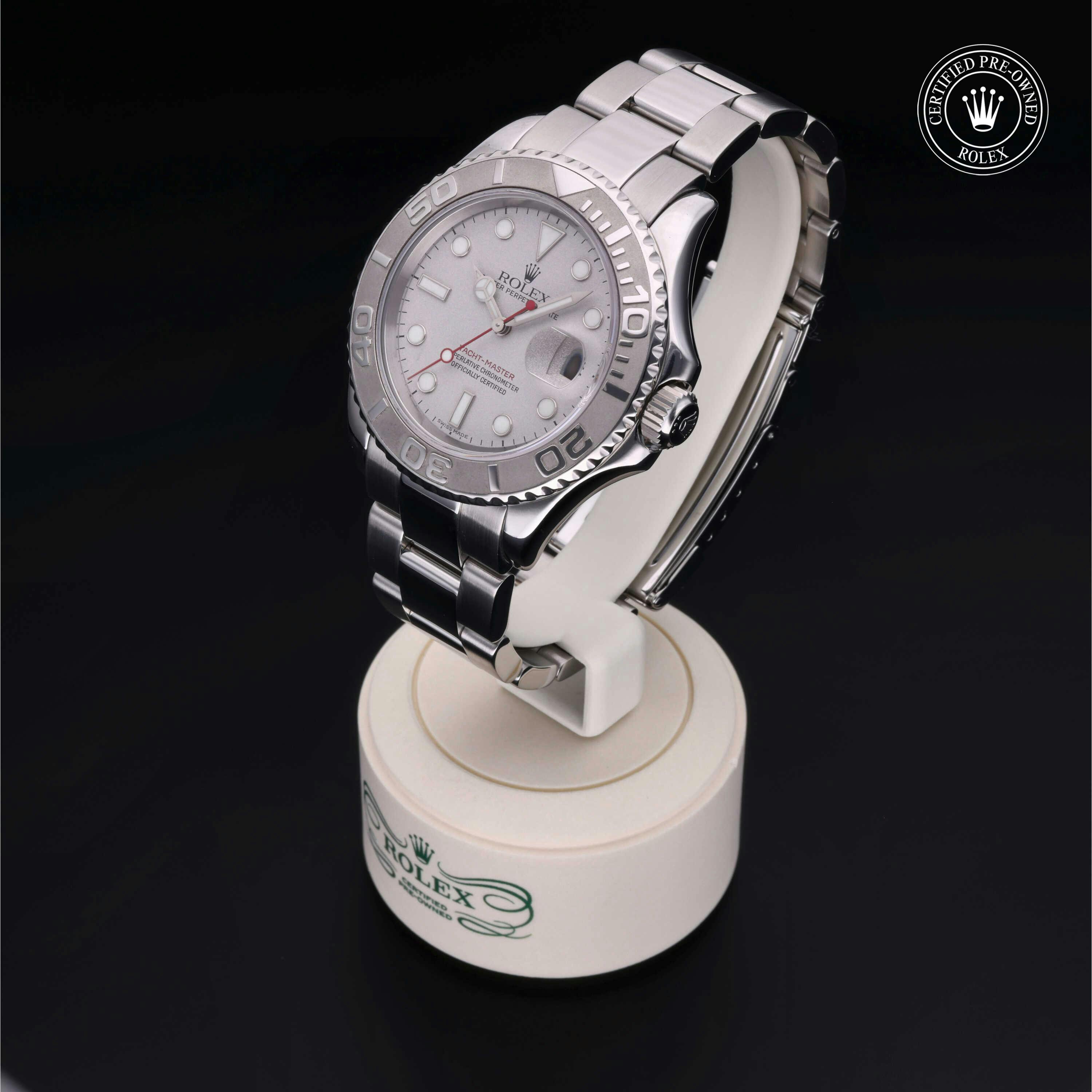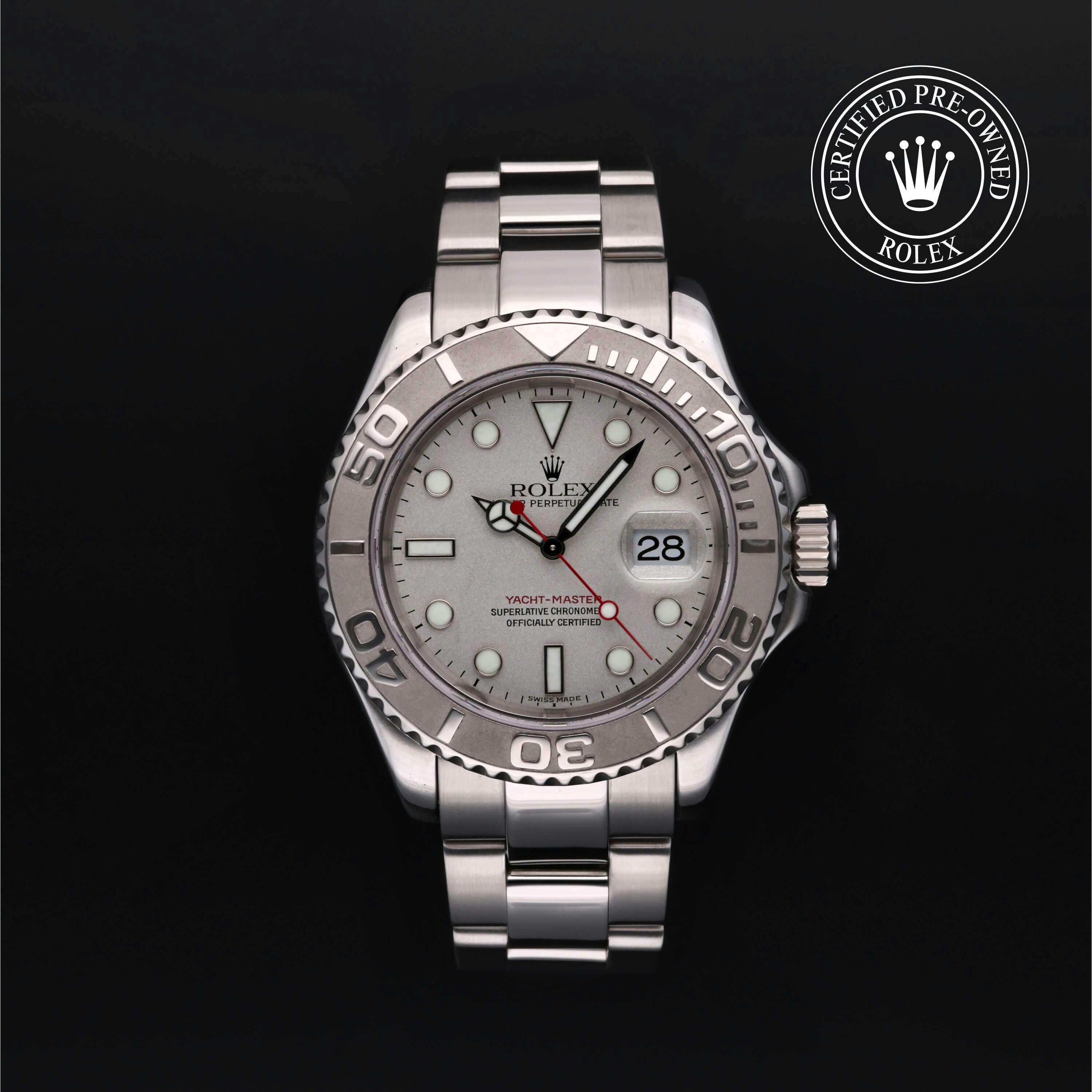 Rolex Certified Pre-Owned Yacht-Master (16622) self - winding automatic watch, features a 40mm stainless steel case with a platinum rotating bezel surrounding a platinum dial on a stainless steel oyster bracelet. Functions include hours, minutes, seconds and date. This watch has received Rolex-authorized service and certification. It does not come with the original box or papers, but includes a custom Rolex Certified Pre-Owned hang tag, travel pouch and RCPO international warranty card.