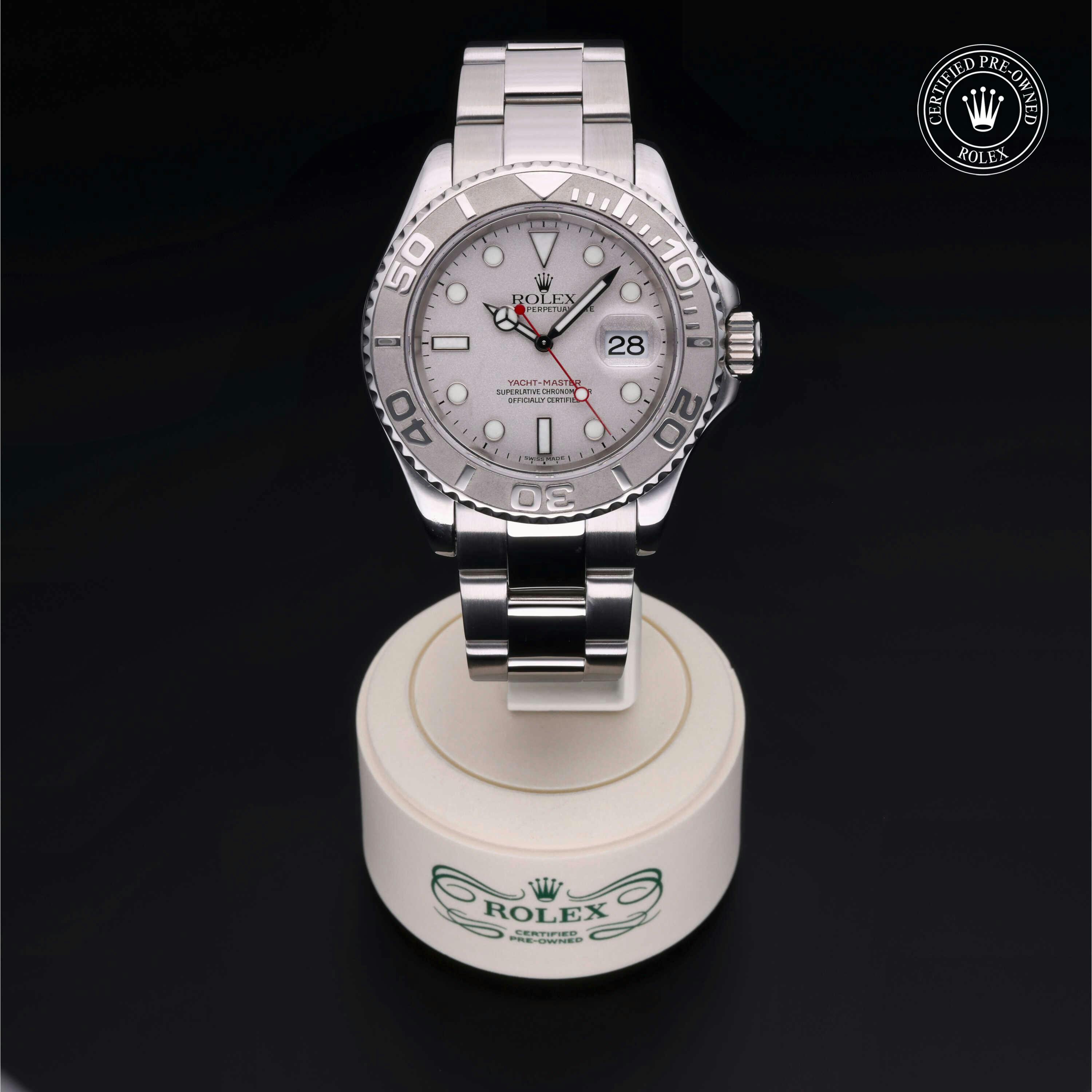 Rolex Certified Pre-Owned Yacht-Master (16622) self - winding automatic watch, features a 40mm stainless steel case with a platinum rotating bezel surrounding a platinum dial on a stainless steel oyster bracelet. Functions include hours, minutes, seconds and date. This watch has received Rolex-authorized service and certification. It does not come with the original box or papers, but includes a custom Rolex Certified Pre-Owned hang tag, travel pouch and RCPO international warranty card.