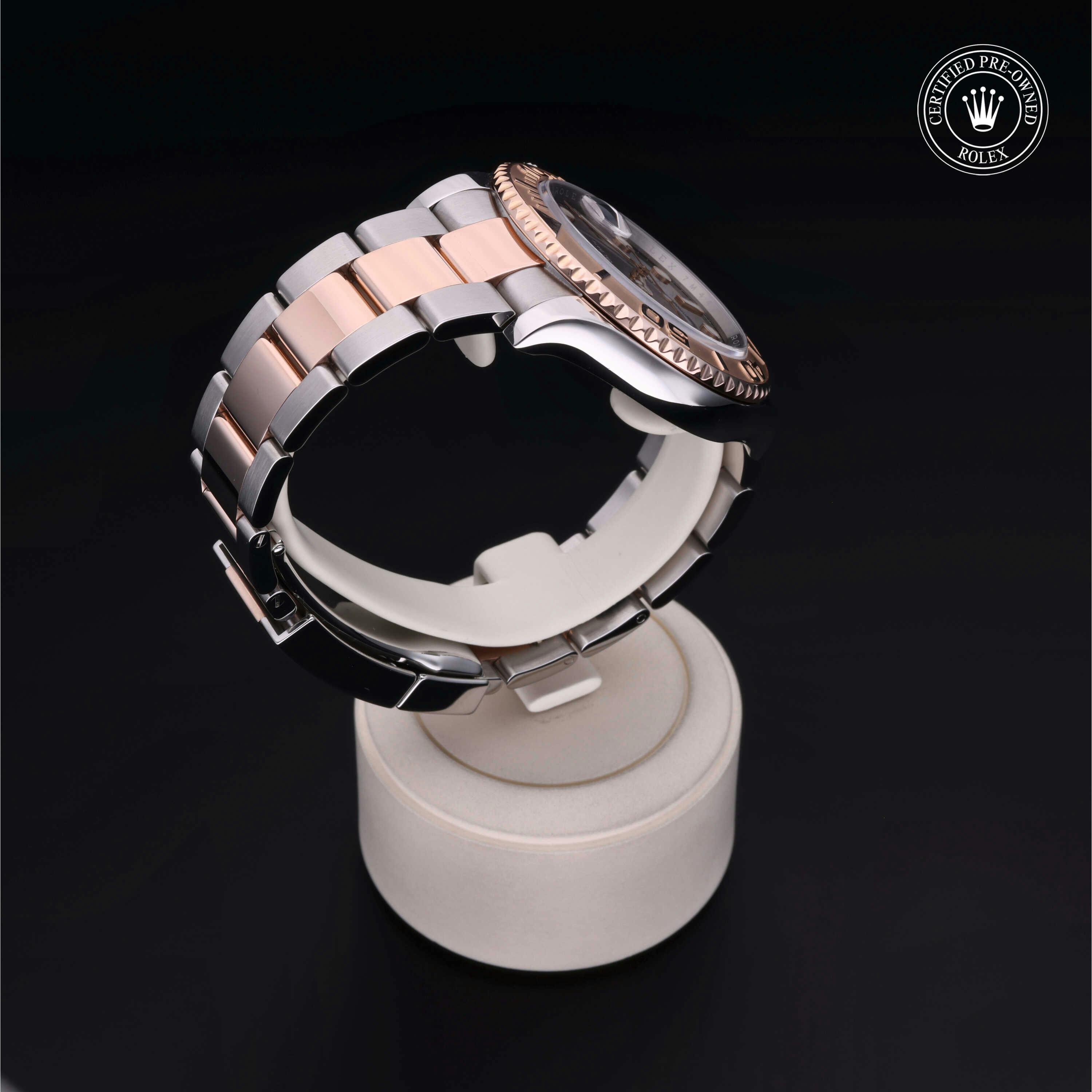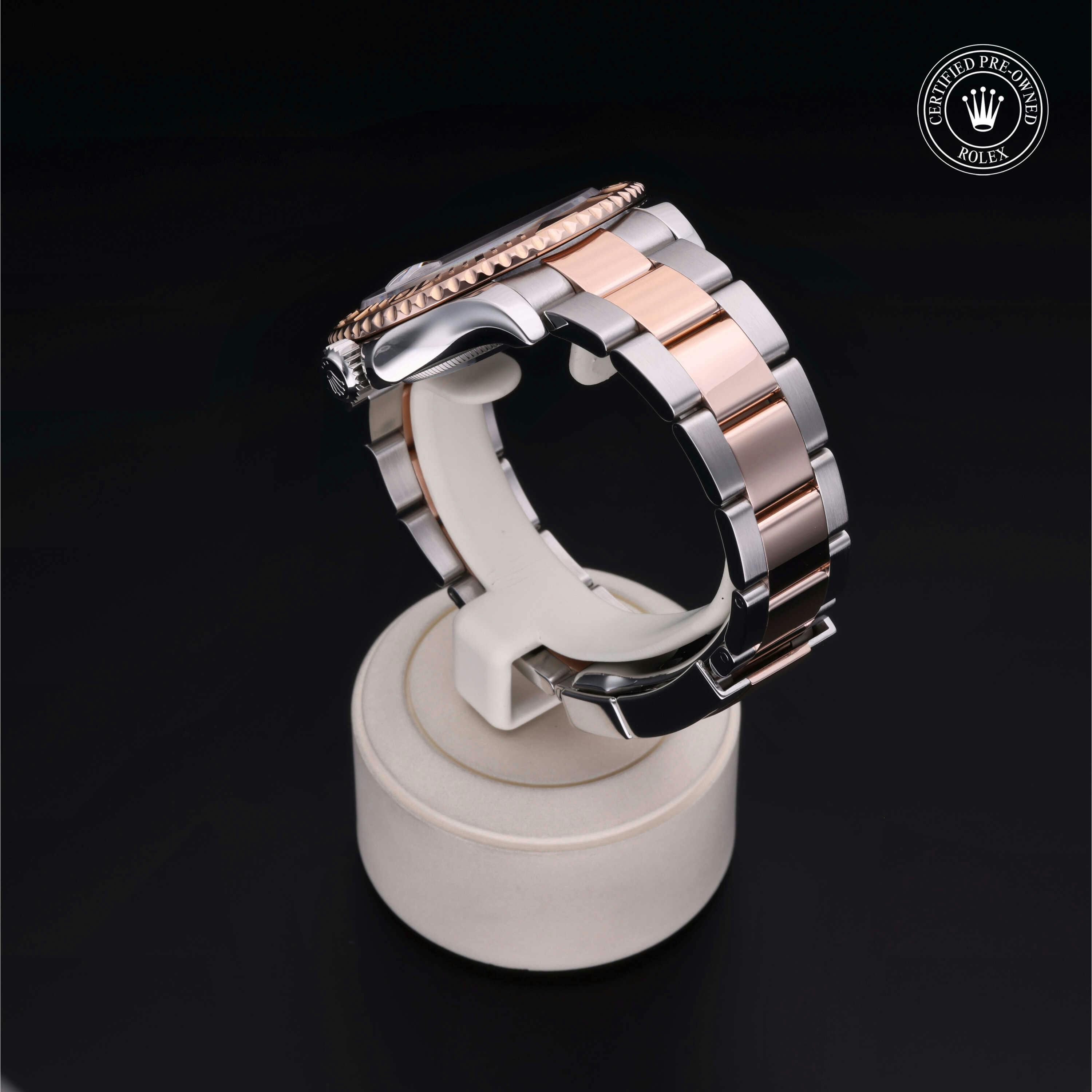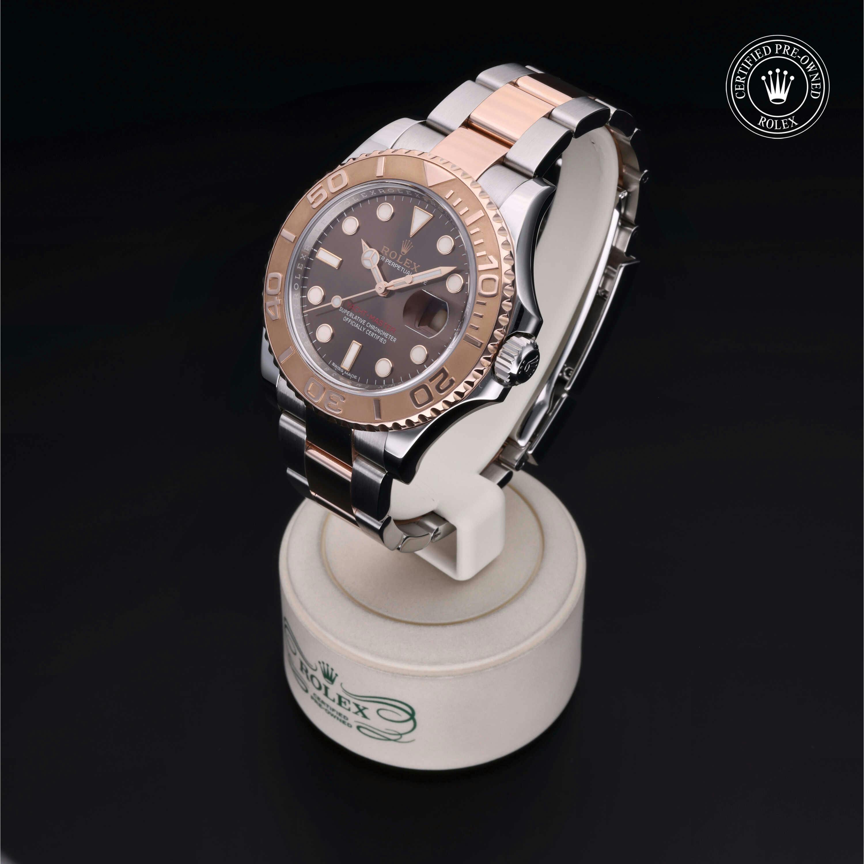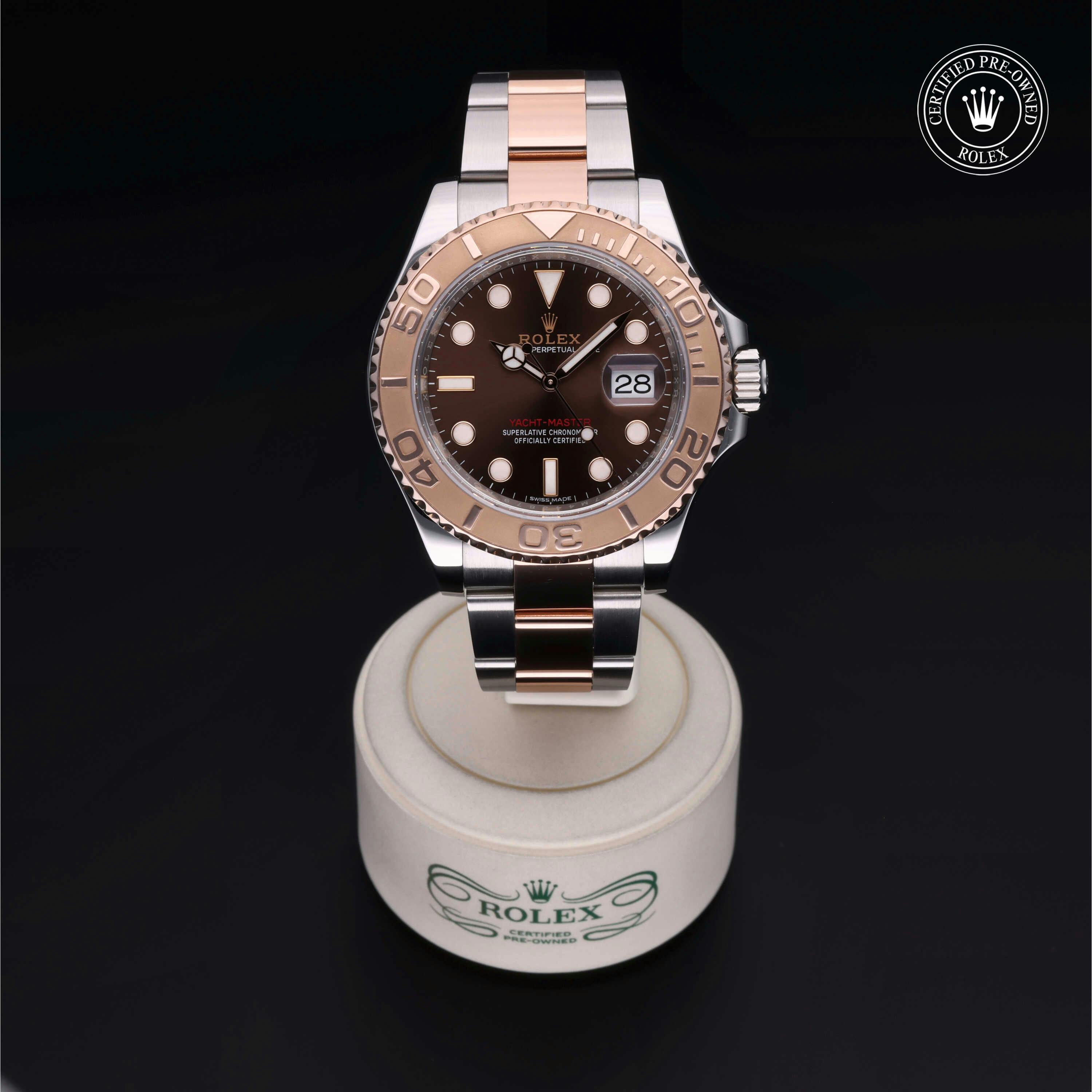 Rolex Certified Pre-Owned Yacht-Master (116621) self - winding automatic watch, features a 40mm stainless steel case with an 18k rose gold bidirectional rotating bezel surrounding a chocolate brown dial on a stainless steel and 18k rose gold oyster bracelet. Functions include hours, minutes, seconds and date. This watch has received Rolex-authorized service and certification. It does not come with the original box or papers, but includes a custom Rolex Certified Pre-Owned hang tag, travel pouch and RCPO international warranty card.