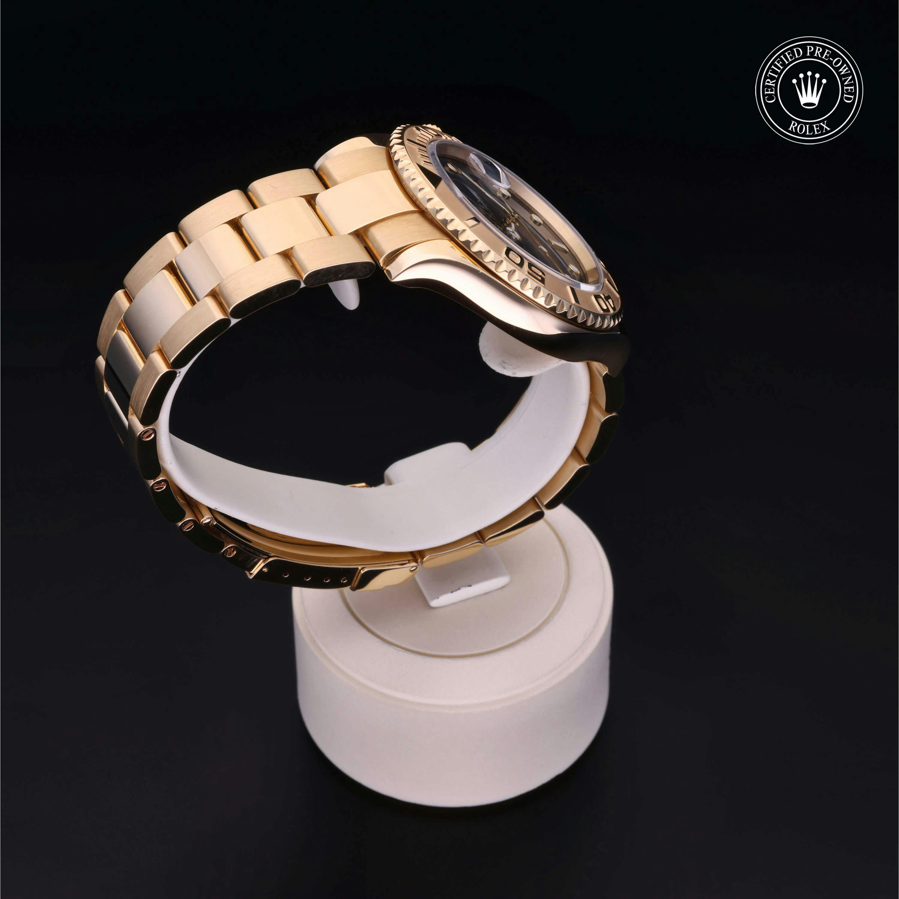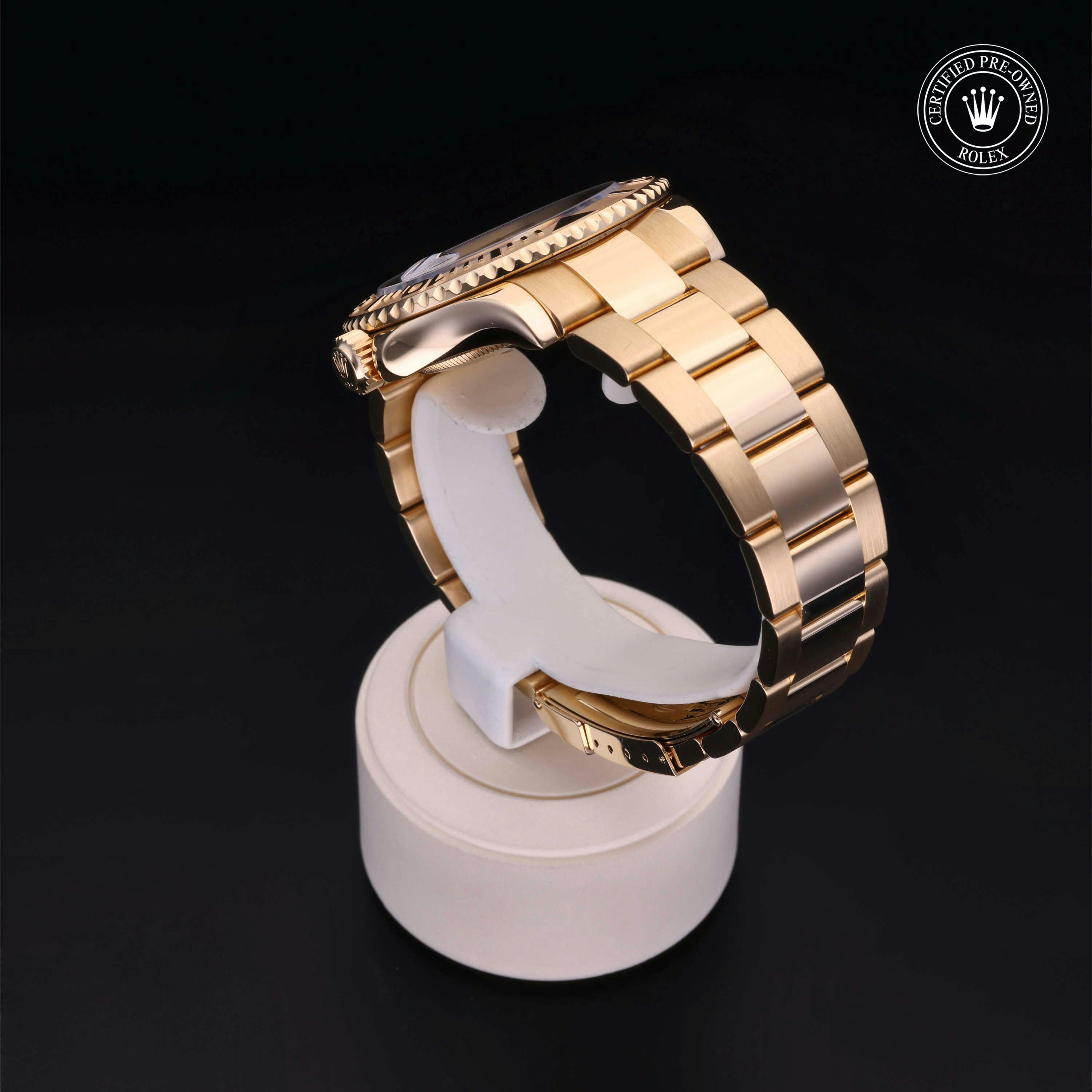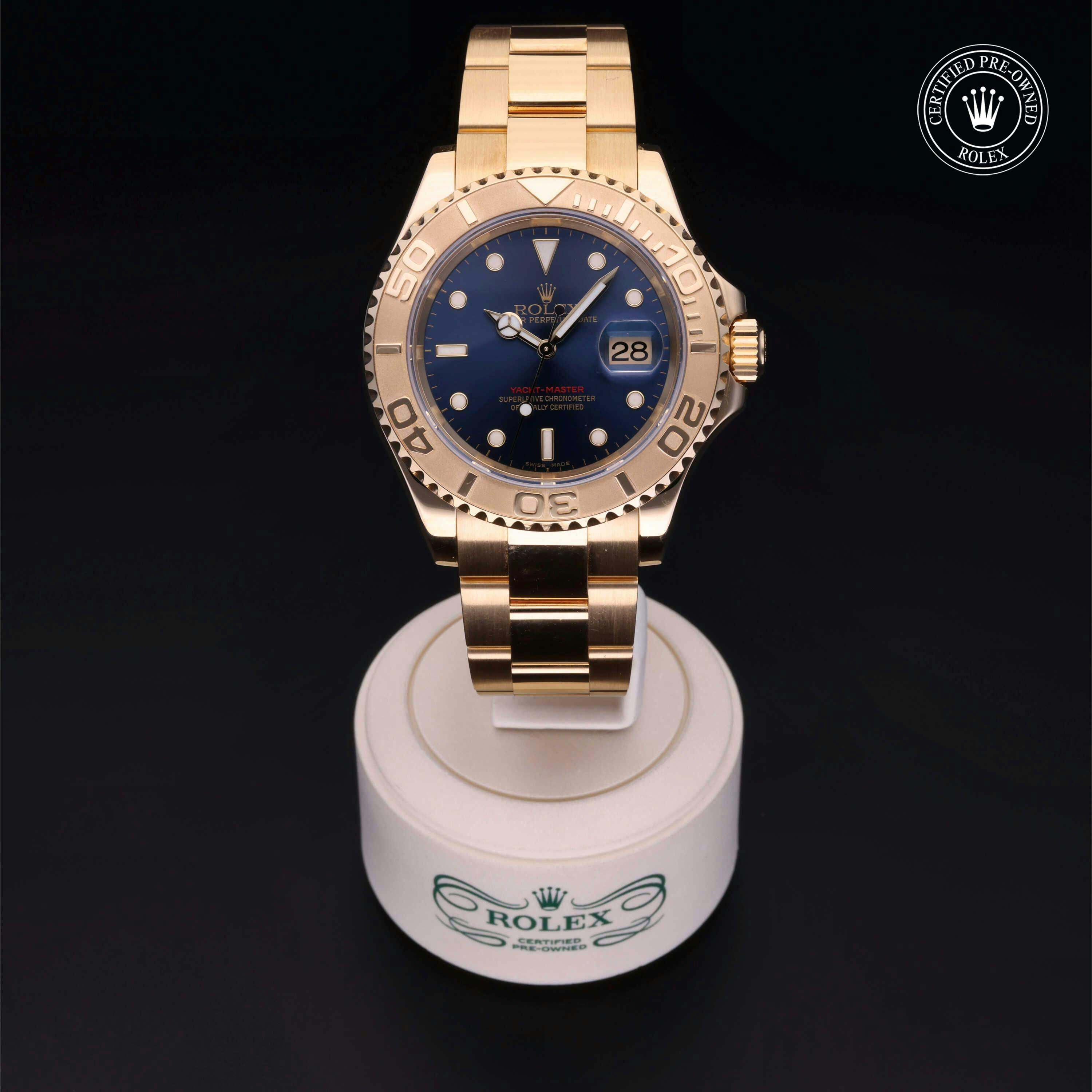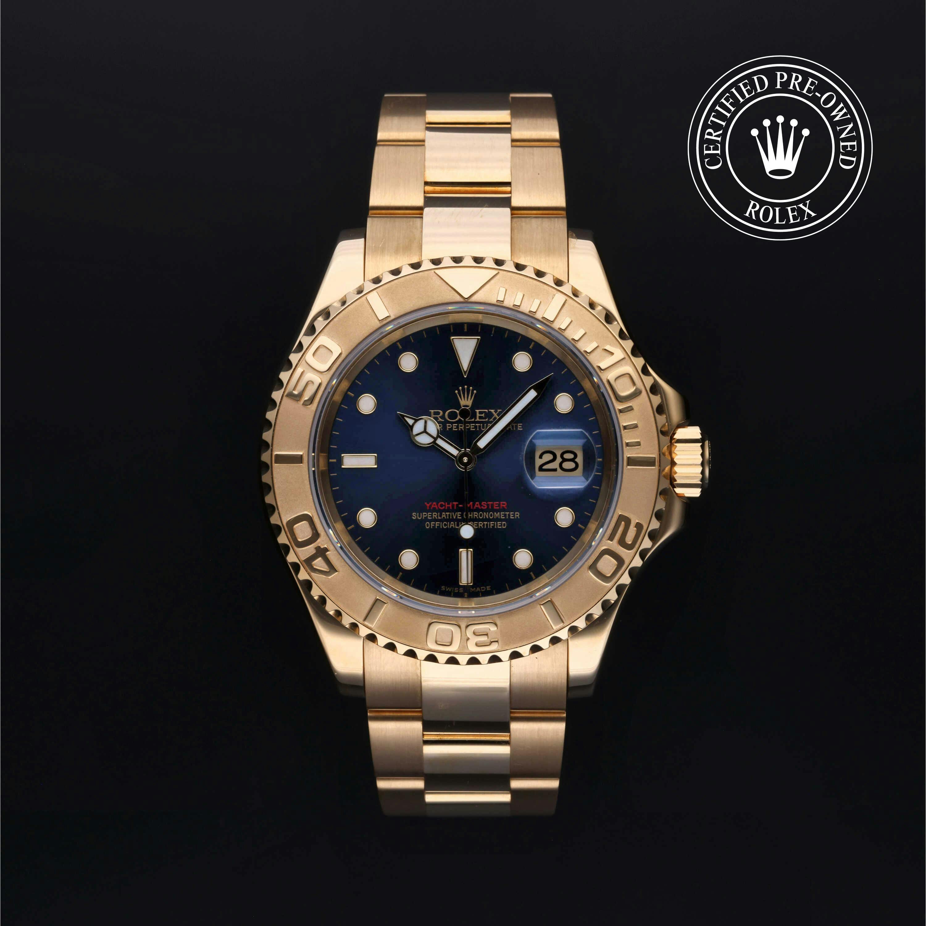 Rolex Certified Pre-Owned Yacht-Master (16628) self - winding automatic watch, features a 40mm 18k yellow gold case and rotating bezel surrounding a blue dial on an 18k yellow gold oyster bracelet. Functions include hours, minutes, seconds and date. This watch has received Rolex-authorized service and certification. It does not come with the original box or papers, but includes a custom Rolex Certified Pre-Owned hang tag, travel pouch and RCPO international warranty card.