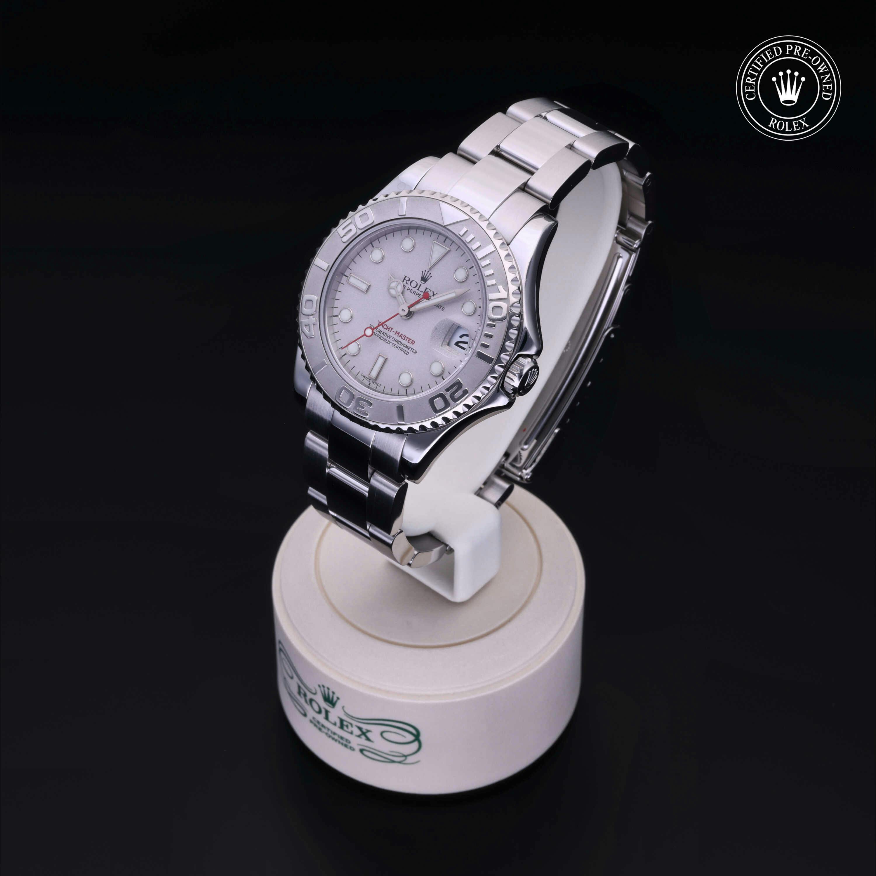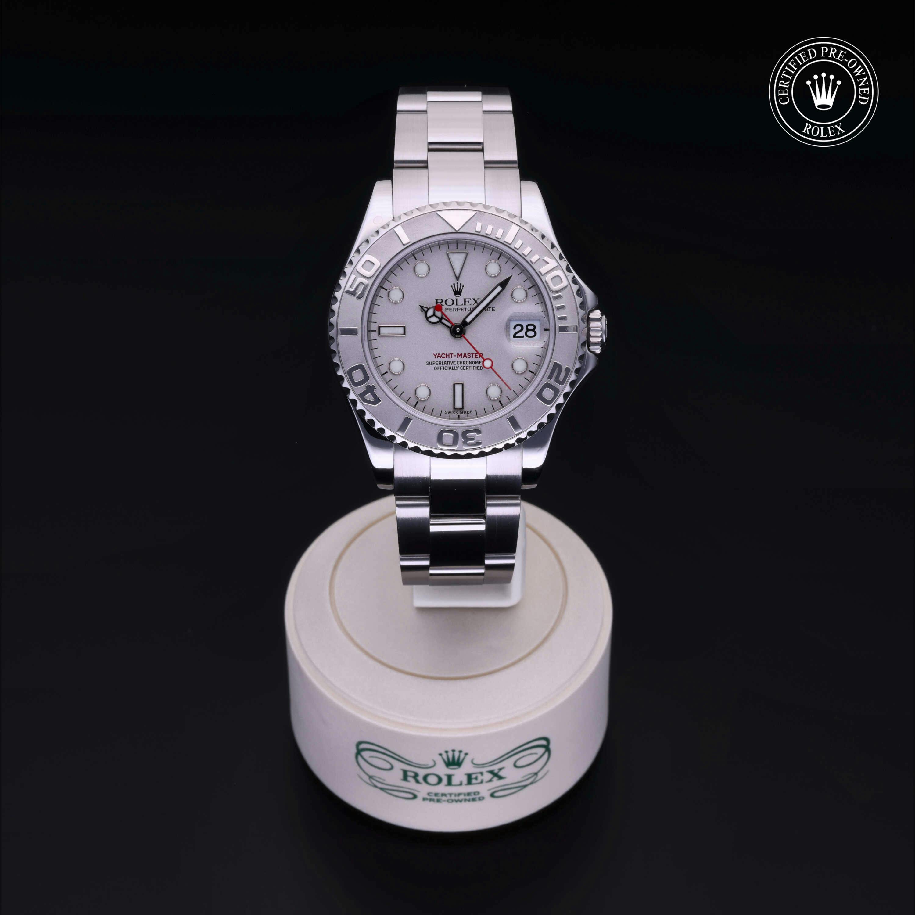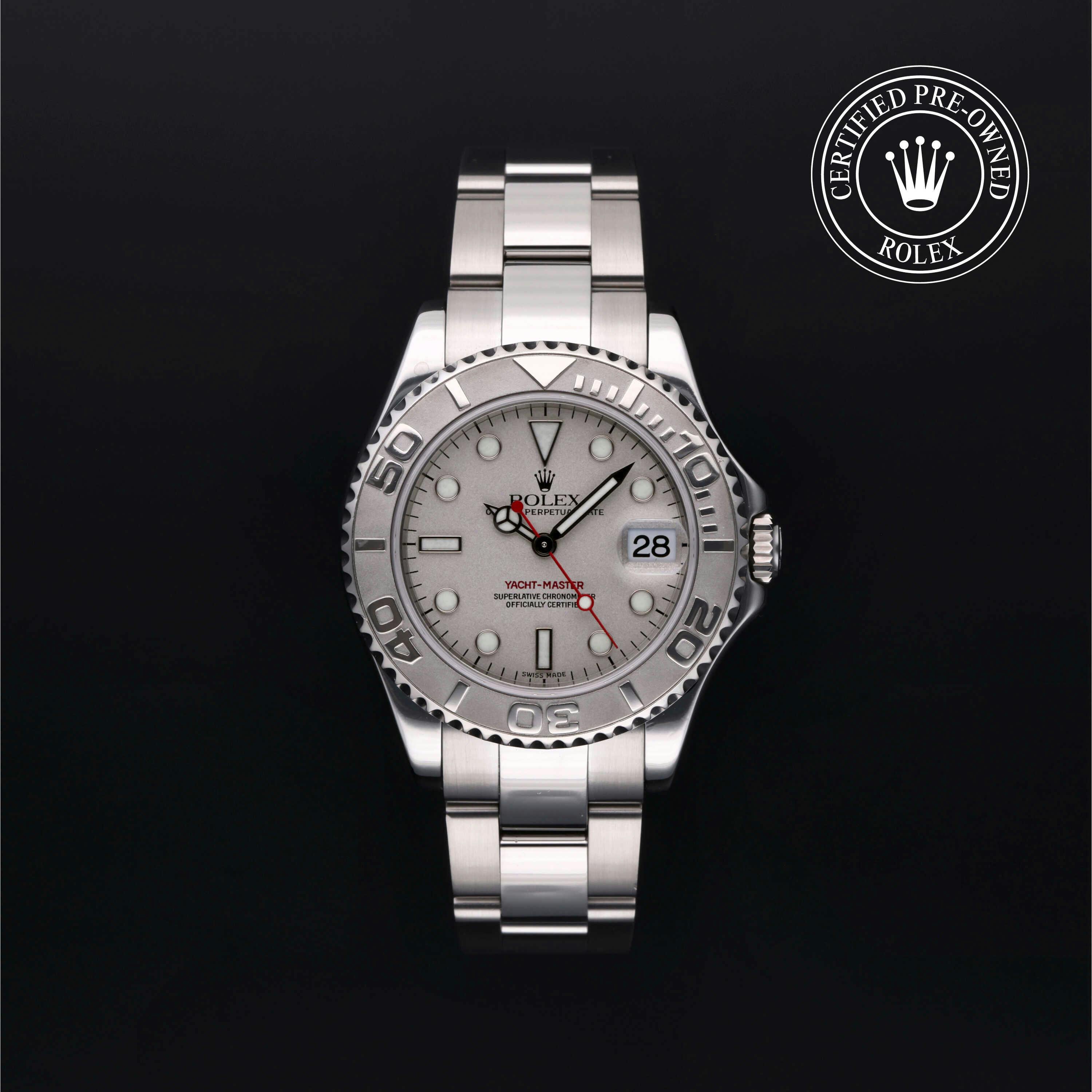 Rolex Certified Pre-Owned Yacht-Master (168622) self - winding automatic watch, features a 35mm stainless steel case with a platinum rotating bezel surrounding a platinum dial on a stainless steel oyster bracelet. Functions include hours, minutes, seconds and date. This watch has received Rolex-authorized service and certification. It does not come with the original box or papers, but includes a custom Rolex Certified Pre-Owned hang tag, travel pouch and and RCPO international warranty card.