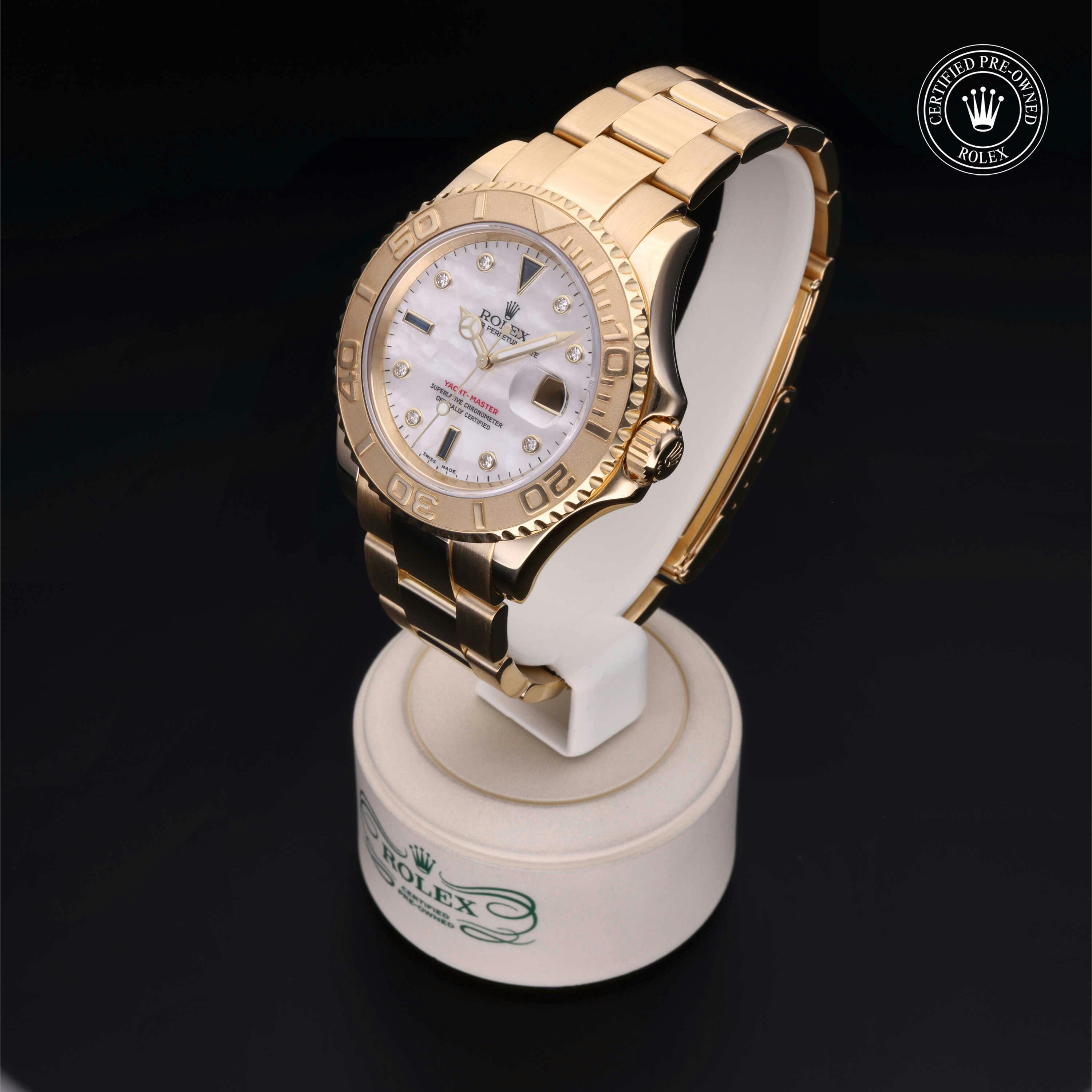 Rolex Certified Pre-Owned Yacht-Master (16628) self - winding automatic watch, features a 40mm 18k yellow gold case and rotating bezel surrounding a white, mother of pearl diamond and sapphire set dial on an 18k yellow gold oyster bracelet. Functions include hours, minutes, seconds and date. This watch has received Rolex-authorized service and certification. It does not come with the original box or papers, but includes a custom Rolex Certified Pre-Owned hang tag, travel pouch and RCPO international warranty card.