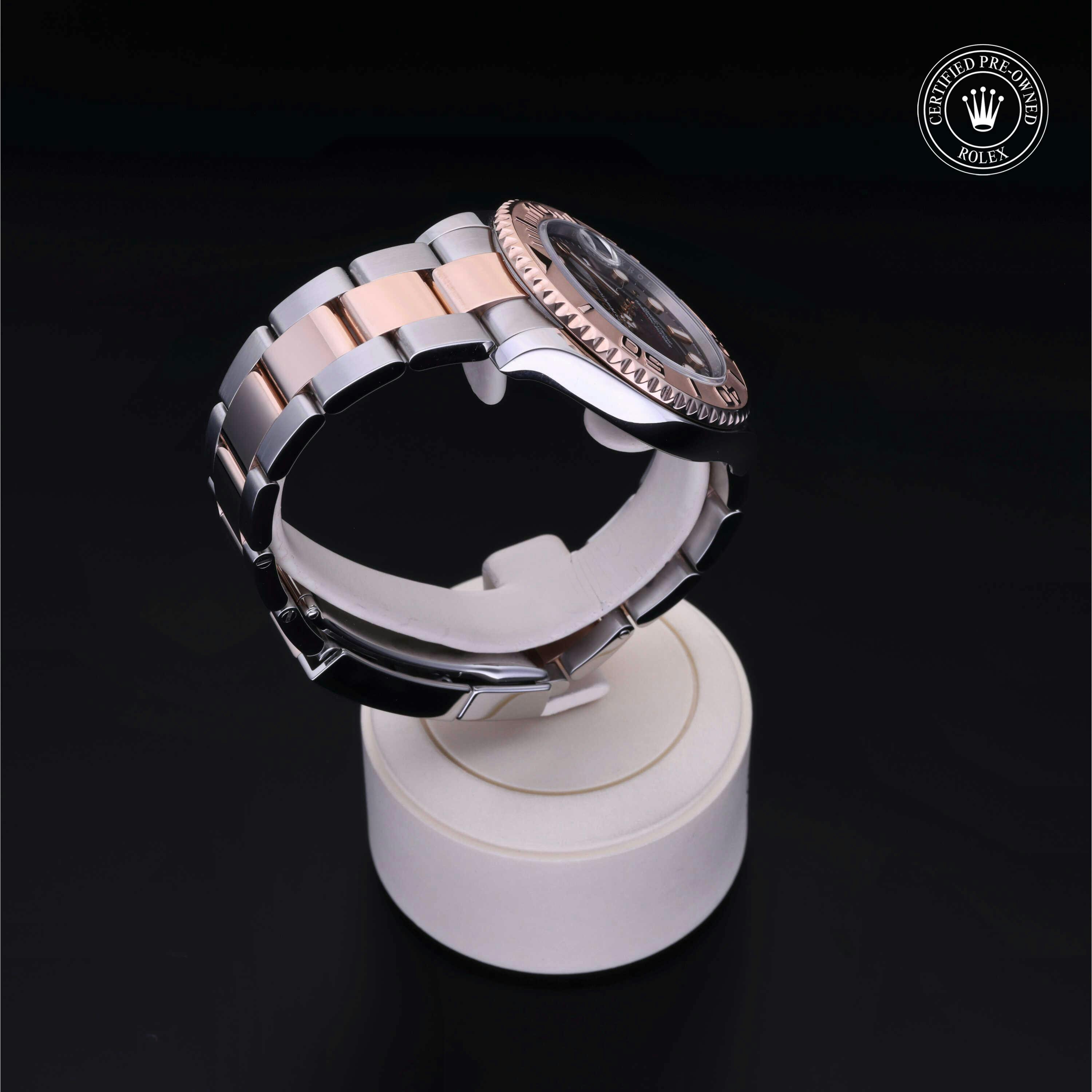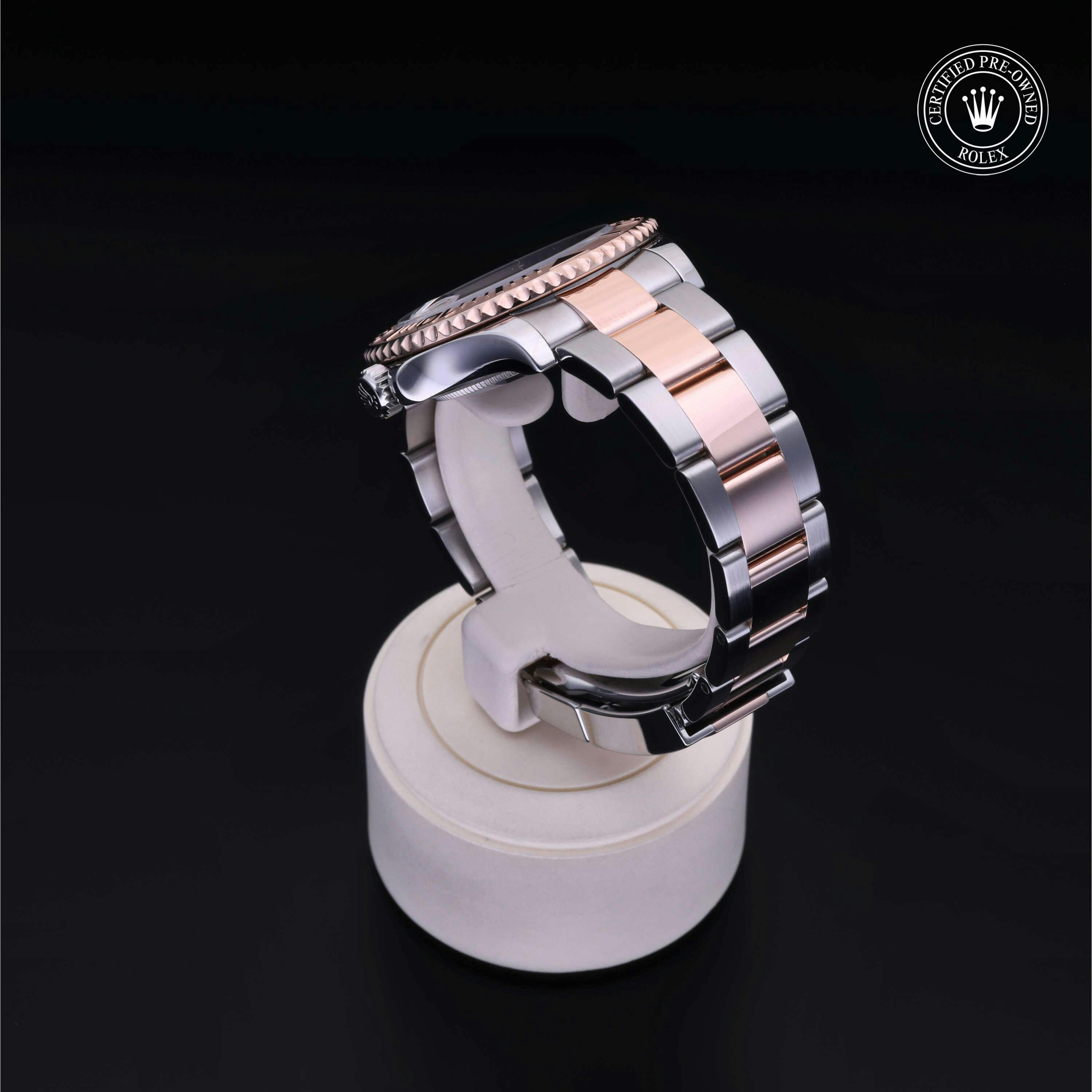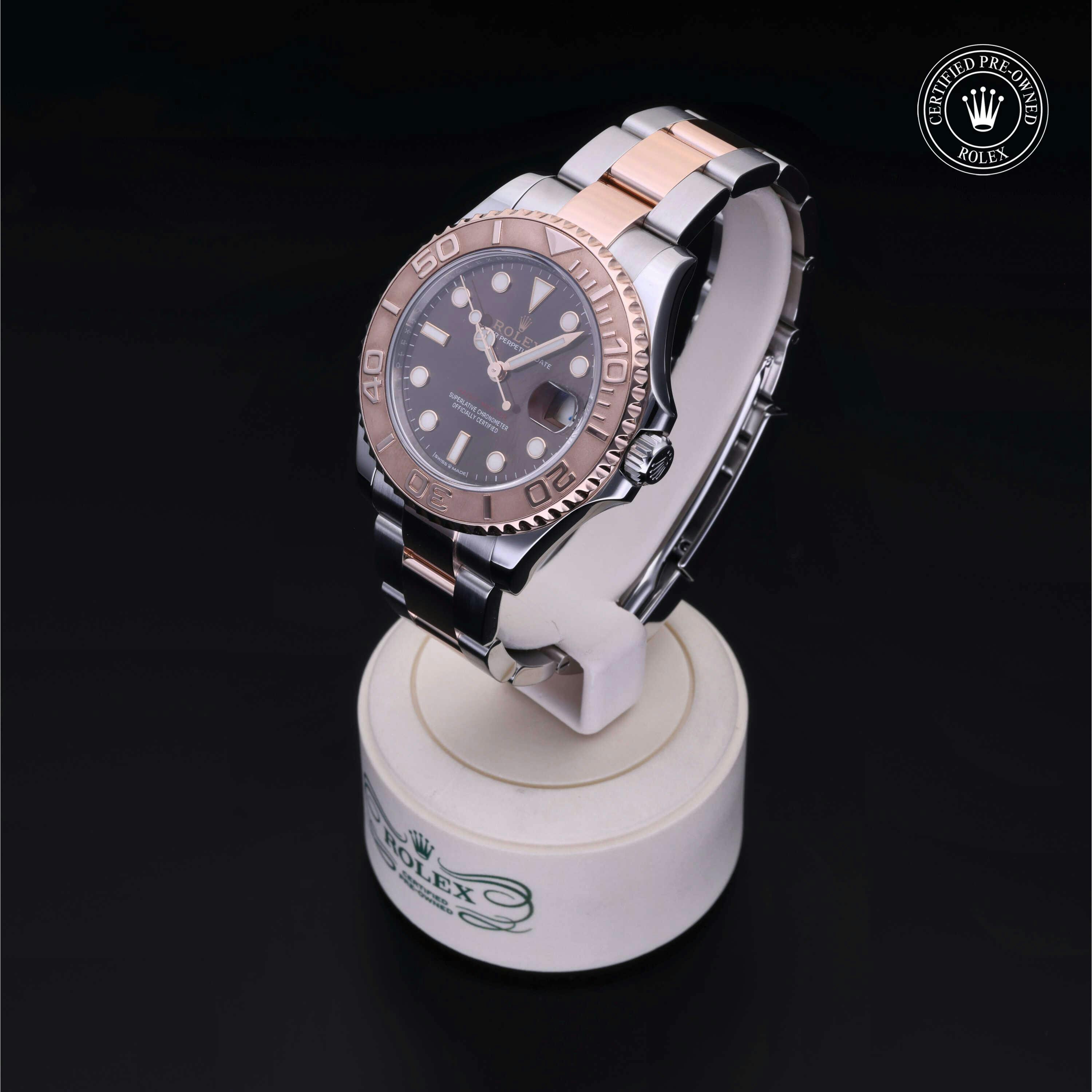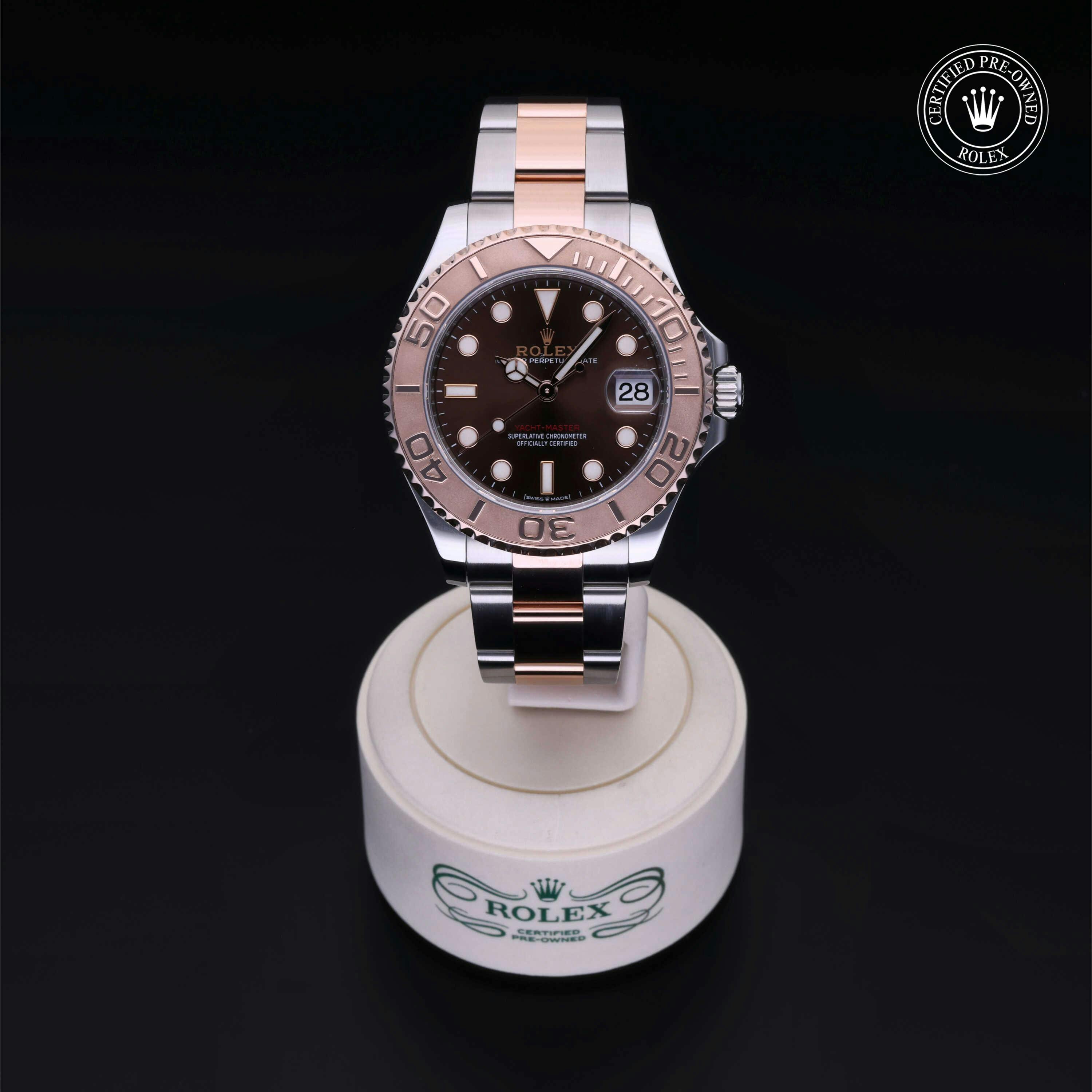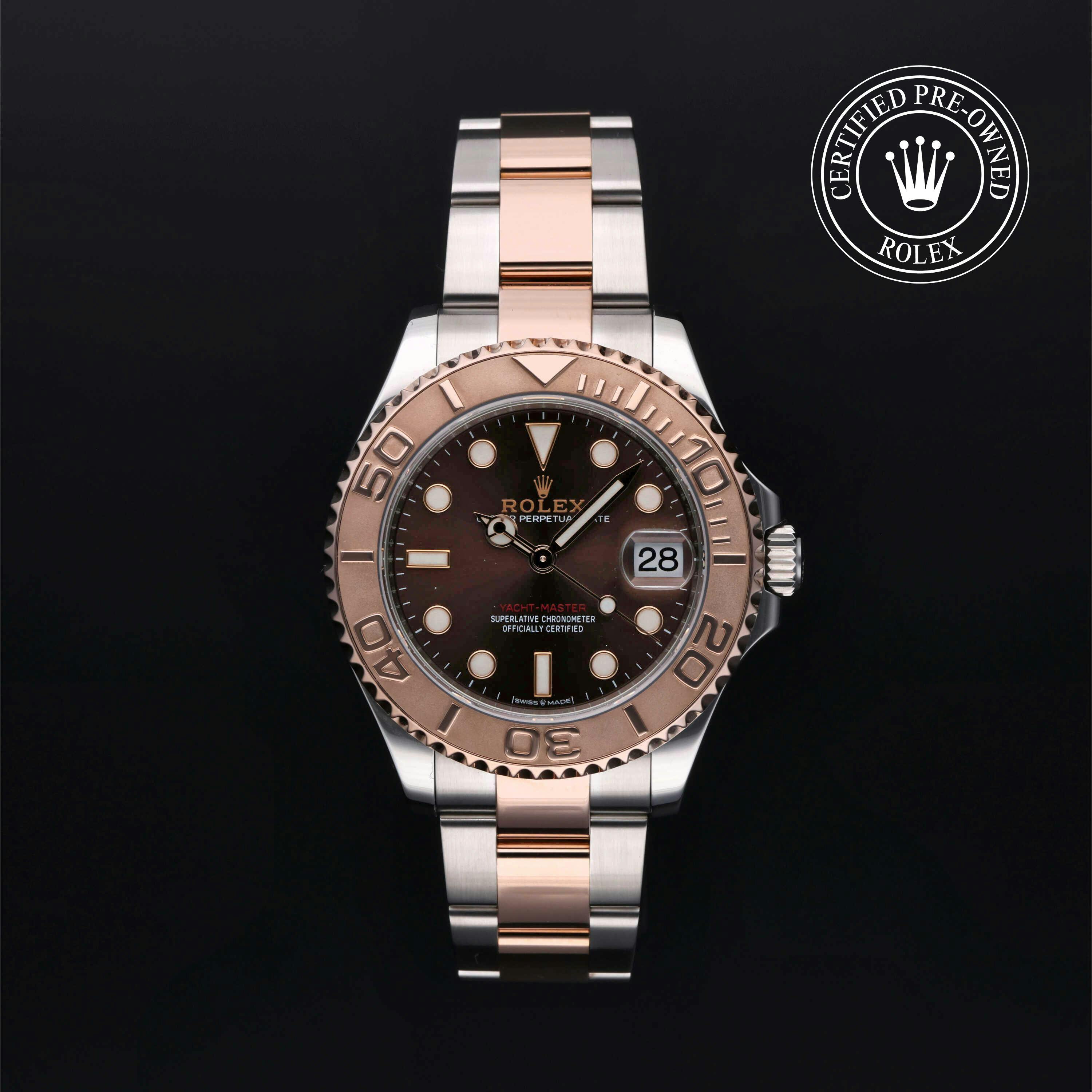 Rolex Certified Pre-Owned Yacht-Master (268621) self - winding automatic watch, features a 37mm stainless steel case with an 18k rose gold rotating bezel surrounding a chocolate dial on a stainless steel and 18k rose gold oyster bracelet. Functions include hours, minutes, seconds and date. This watch has received Rolex-authorized service and certification. It comes with the original papers, and includes a custom Rolex Certified Pre-Owned hang tag, travel pouch and RCPO international warranty card.