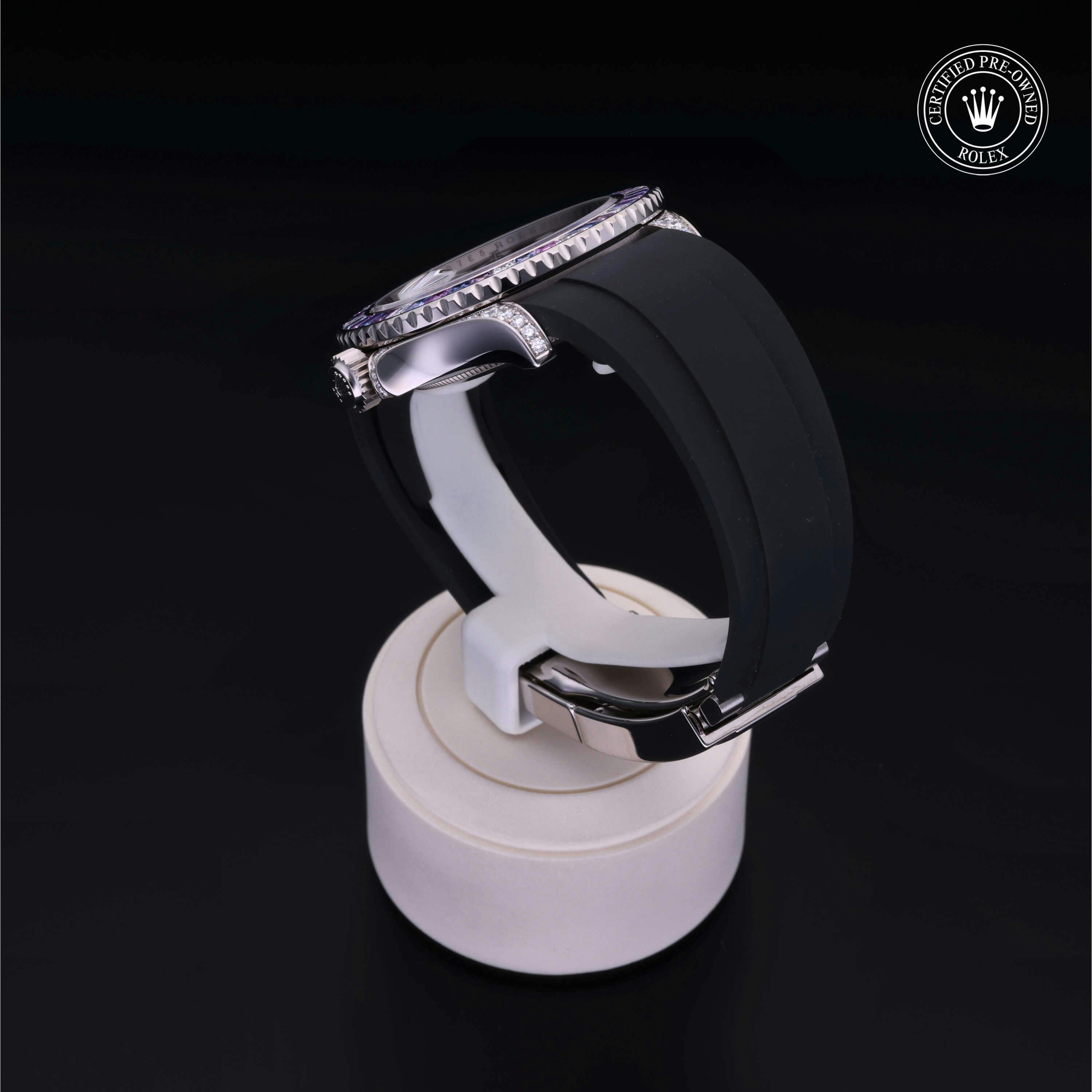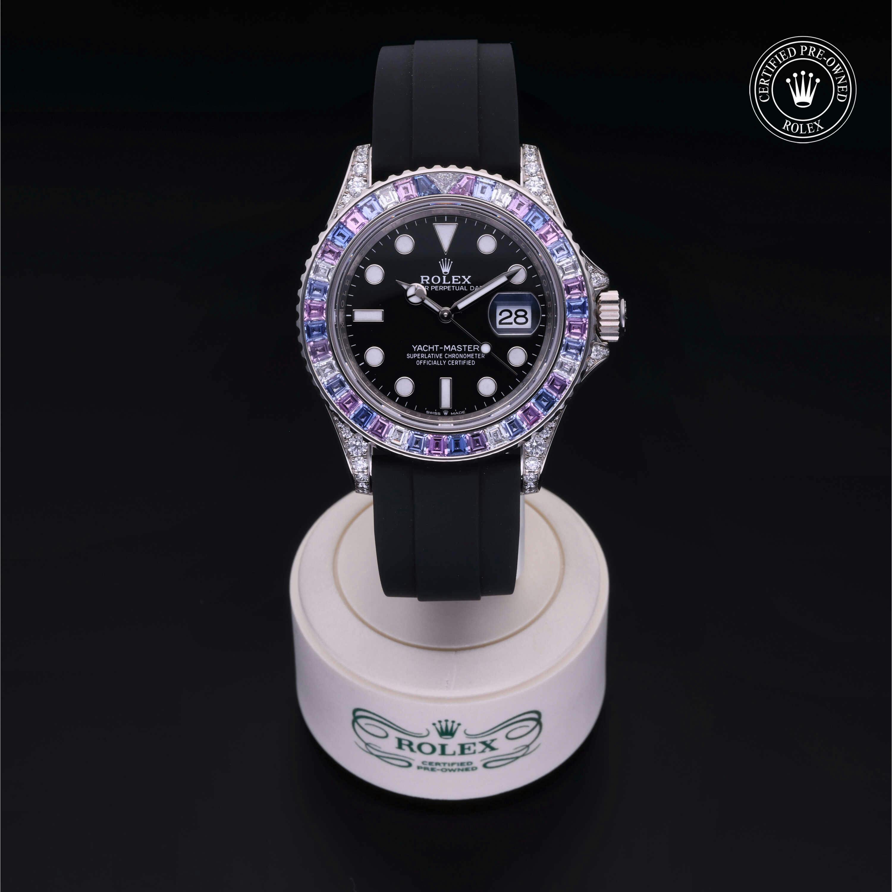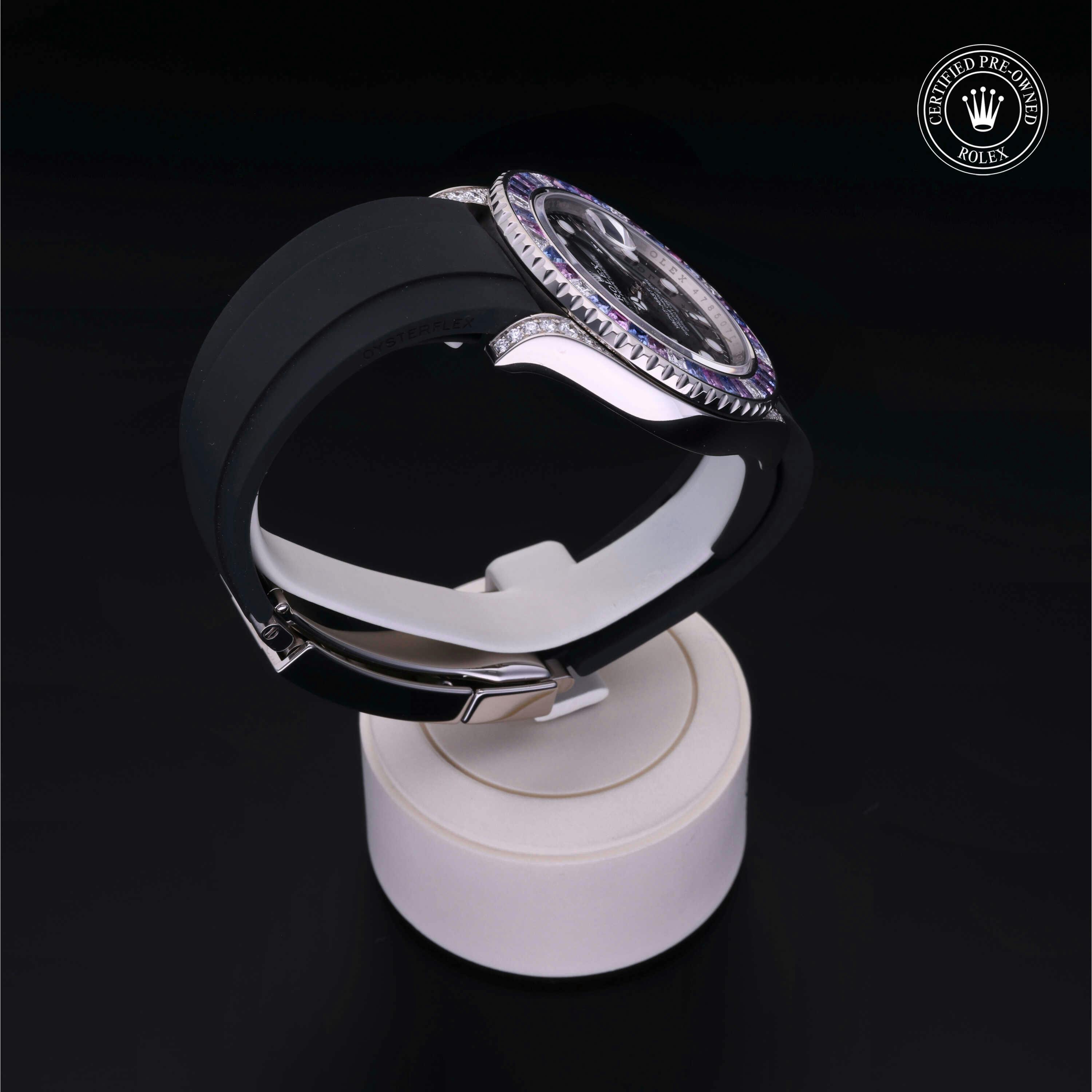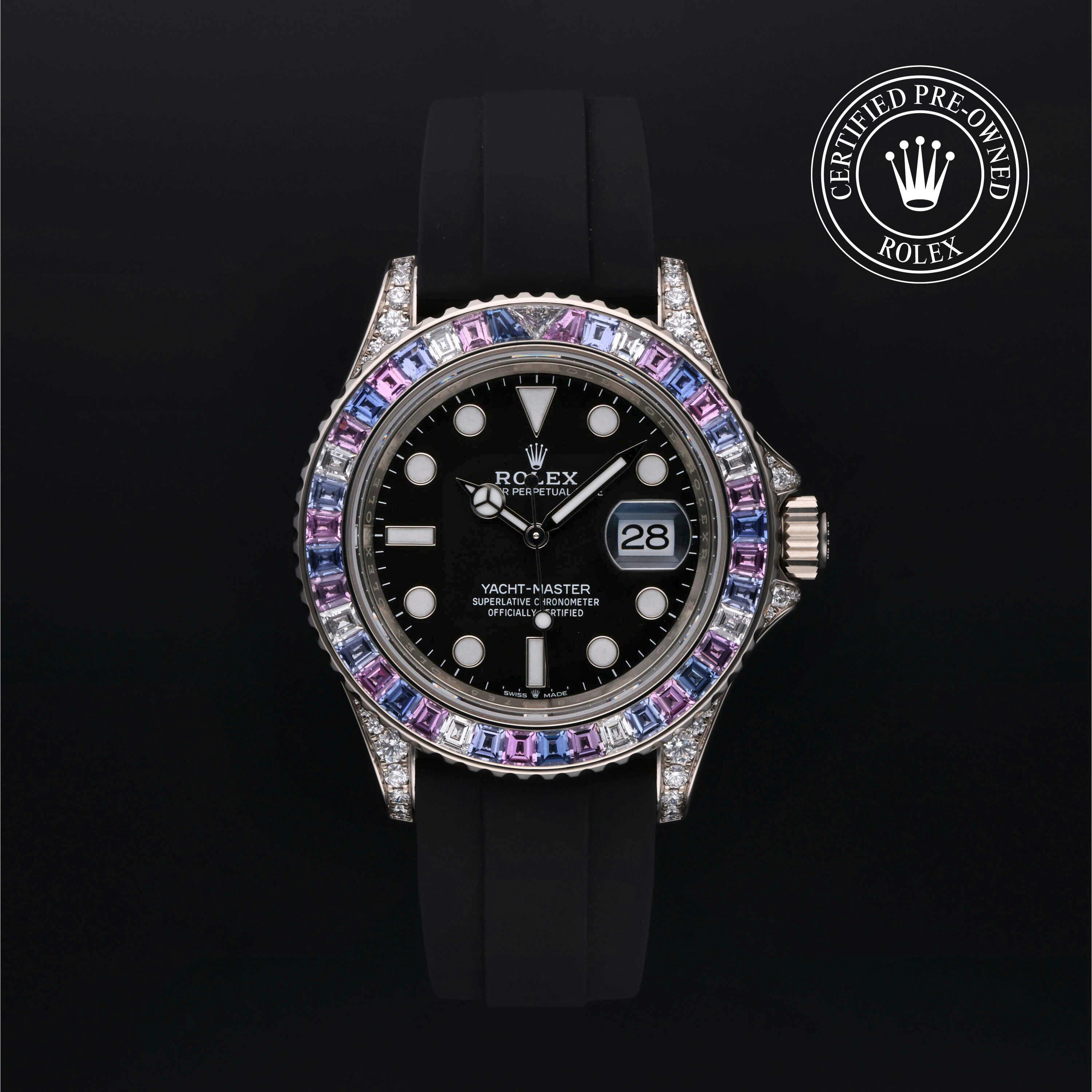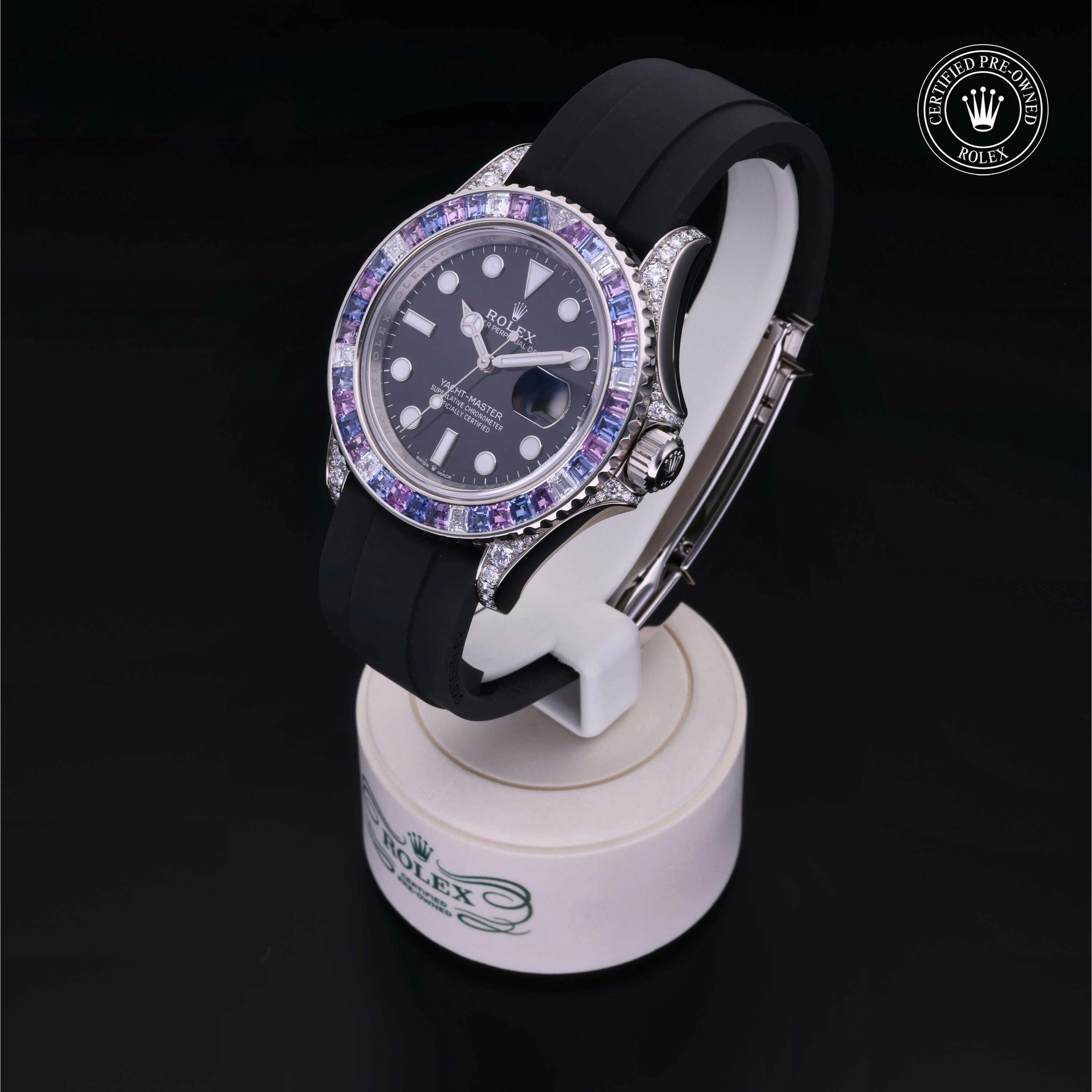 Rolex Certified Pre-Owned Yacht-Master (126679SABR) self - winding automatic watch, features a 40mm 18k white gold diamond set case with a diamond and sapphire set bezel surrounding a black dial on a black oysterflex strap with an 18k white gold deployant buckle. Functions include hours, minutes, seconds and date. This watch has received Rolex-authorized service and certification. It does not come with the original box or papers, but includes a custom Rolex Certified Pre-Owned hang tag, travel pouch and RCPO international warranty card.