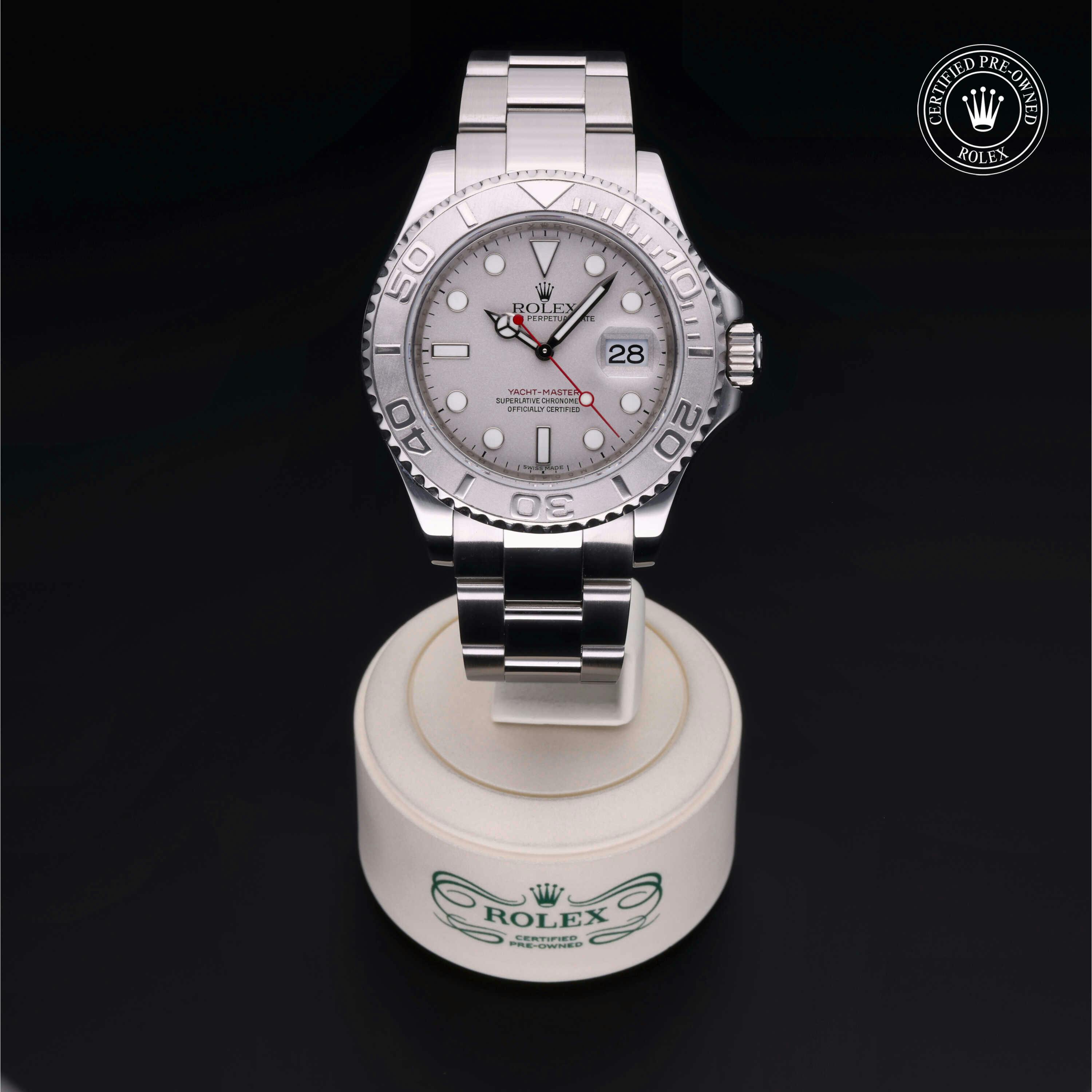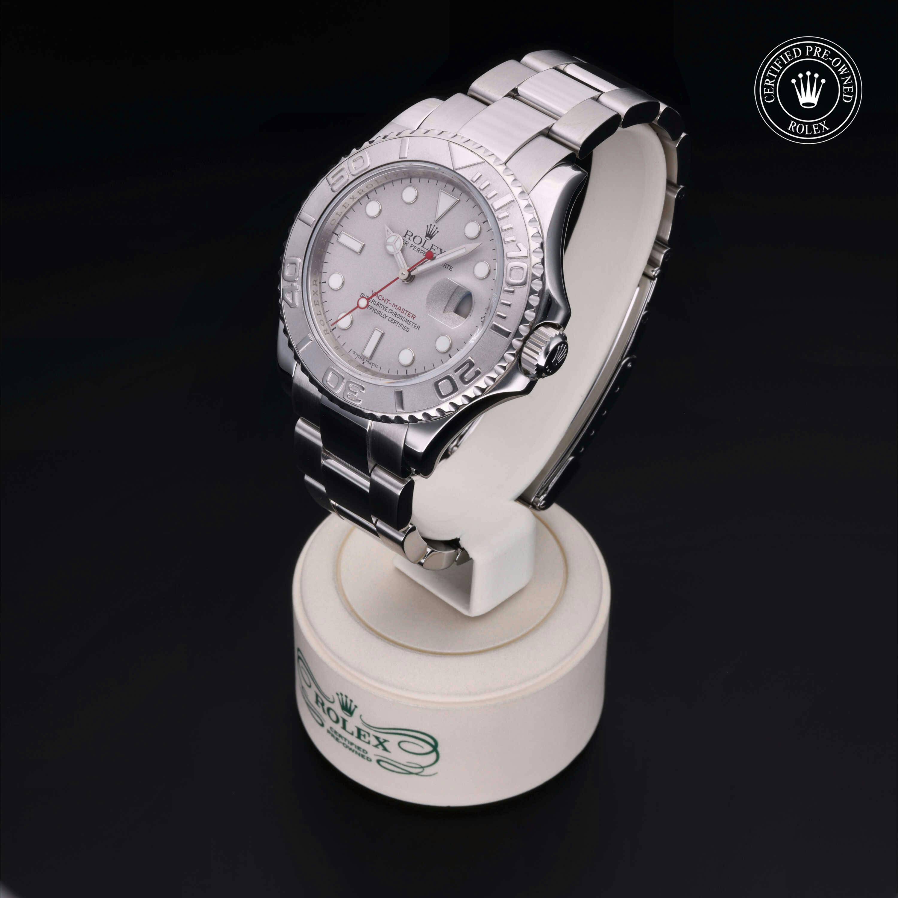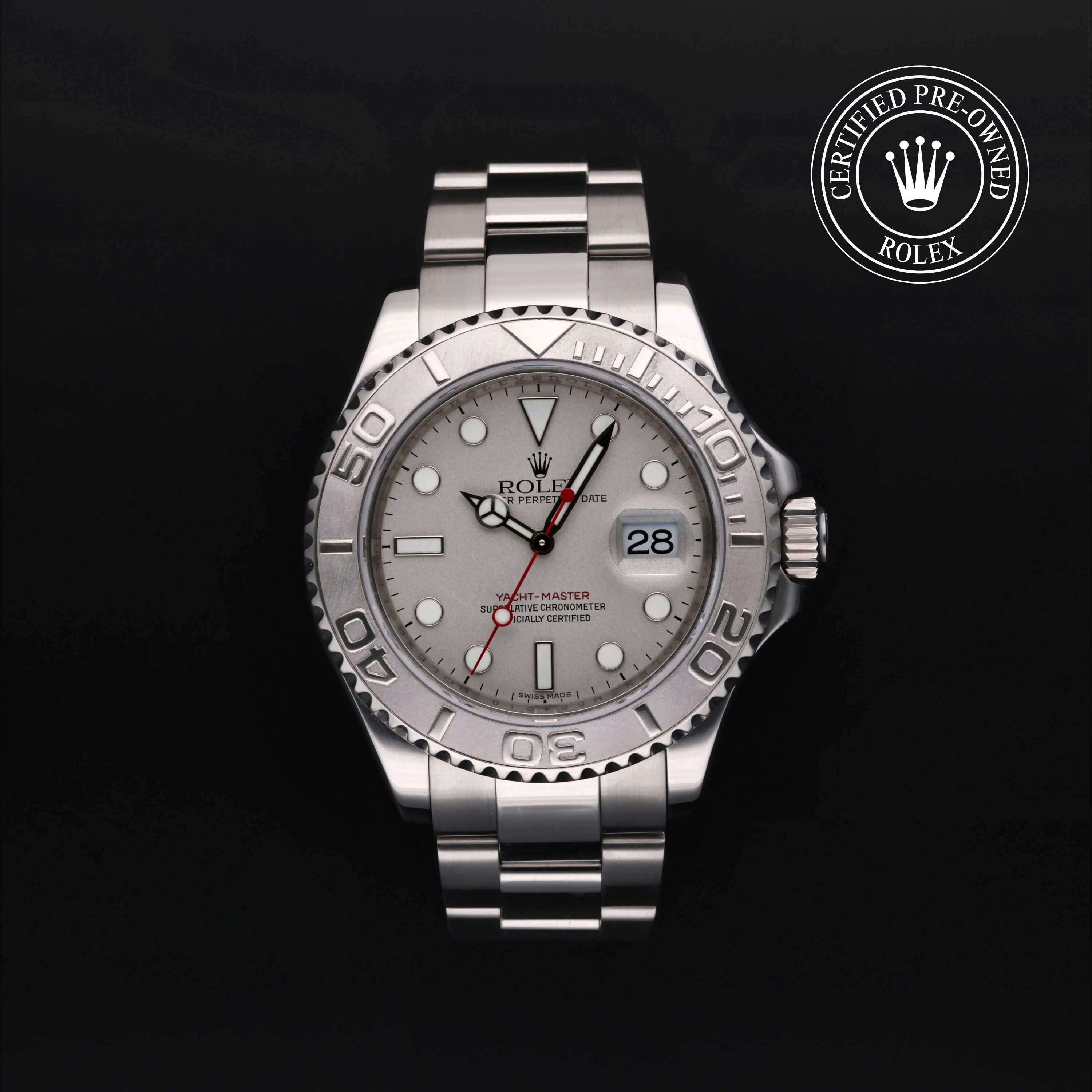 Rolex Certified Pre-Owned Yacht-Master (16622) self - winding automatic watch, features a 40mm stainless steel case with a platinum rotating bezel surrounding a platinum dial on a stainless steel oyster bracelet. Functions include hours, minutes, seconds and date. This watch has received Rolex-authorized service and certification. It does not come with the original box or papers, but includes a custom Rolex Certified Pre-Owned hang tag, travel pouch and RCPO international warranty card.