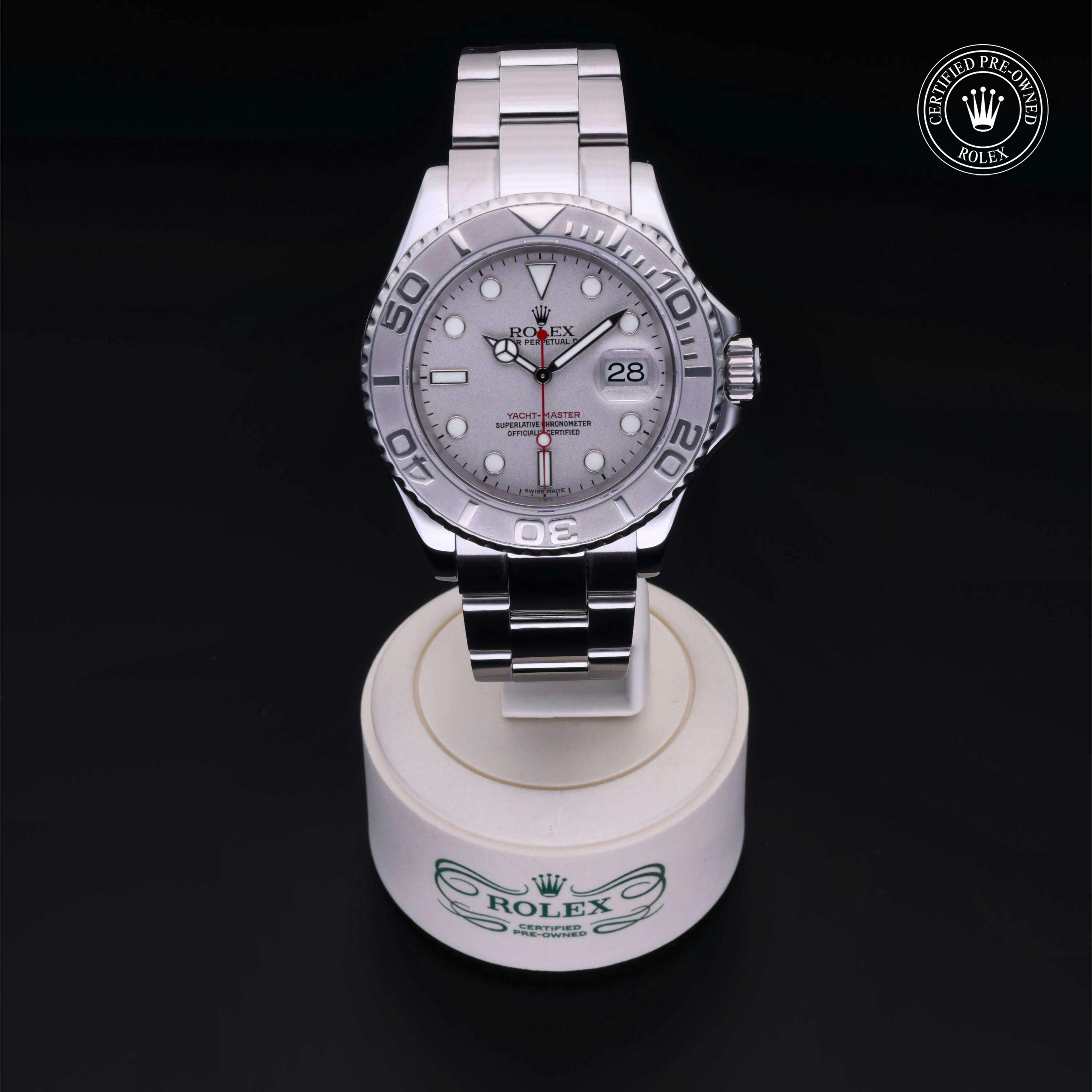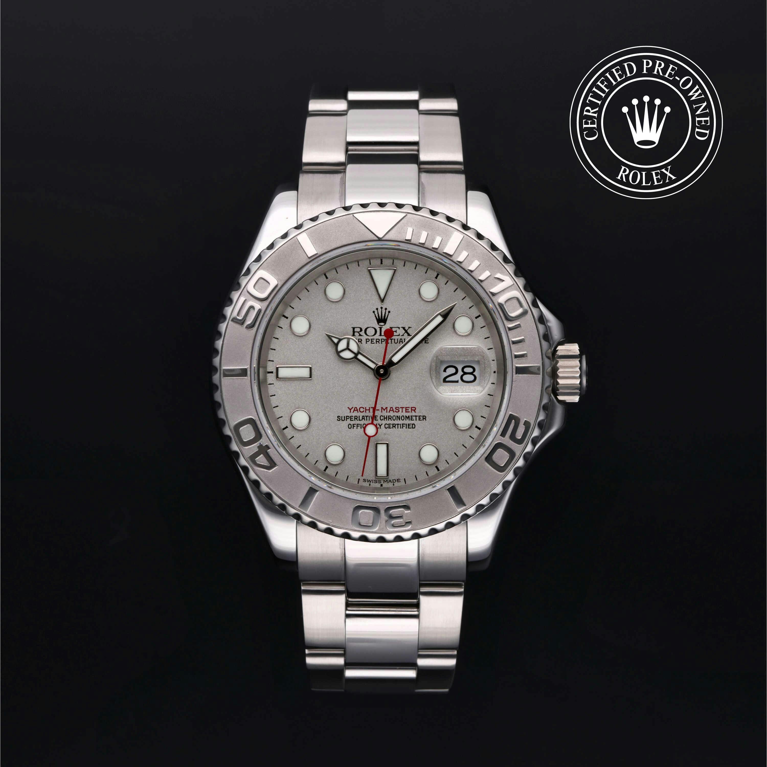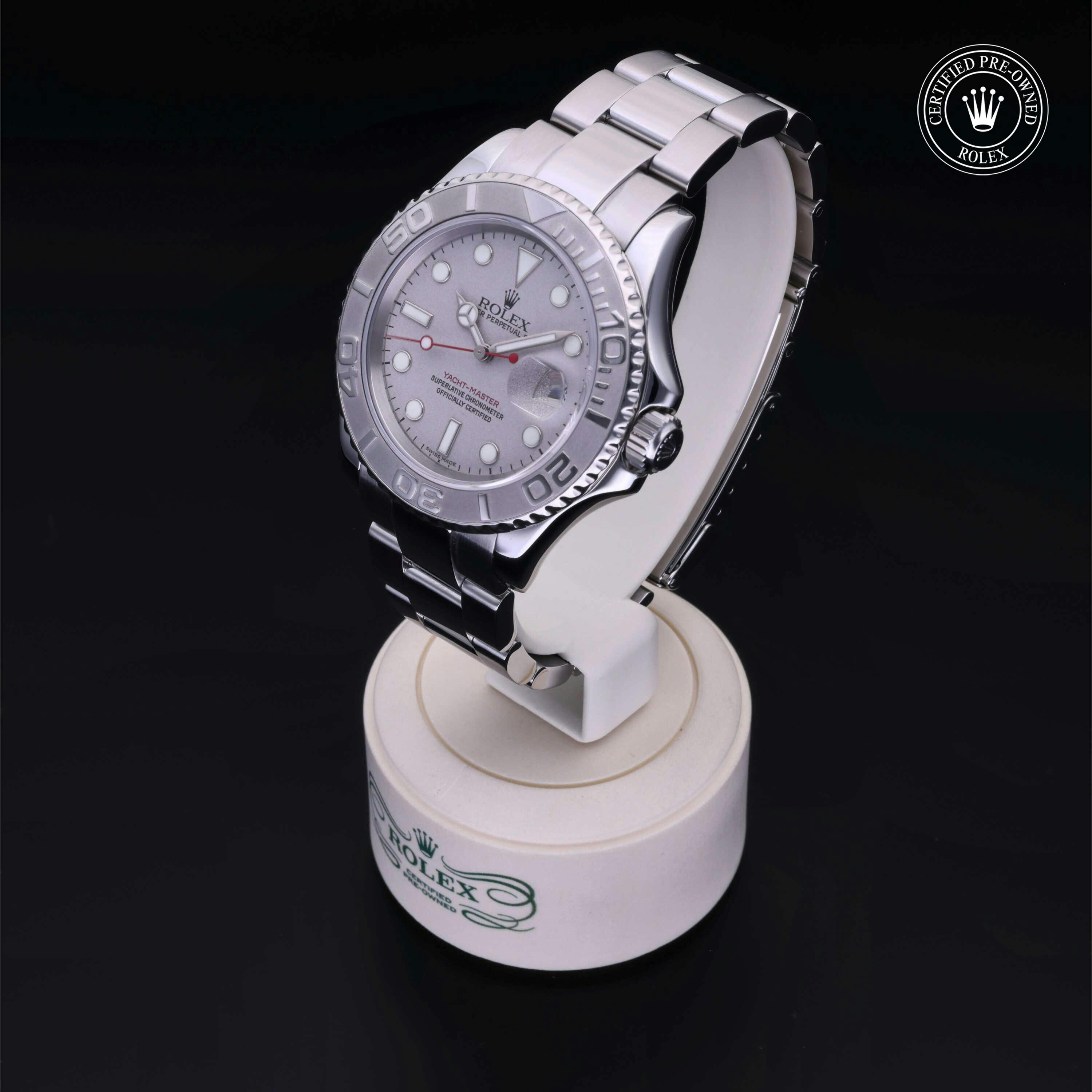 Rolex Certified Pre-Owned Yacht-Master (16622) self - winding automatic watch, features a 40mm stainless steel case with a platinum rotating bezel surrounding a platinum dial on a stainless steel oyster bracelet. Functions include hours, minutes, seconds and date. This watch has received Rolex-authorized service and certification. It does not come with the original box or papers, but includes a custom Rolex Certified Pre-Owned hang tag, travel pouch and RCPO international warranty card.