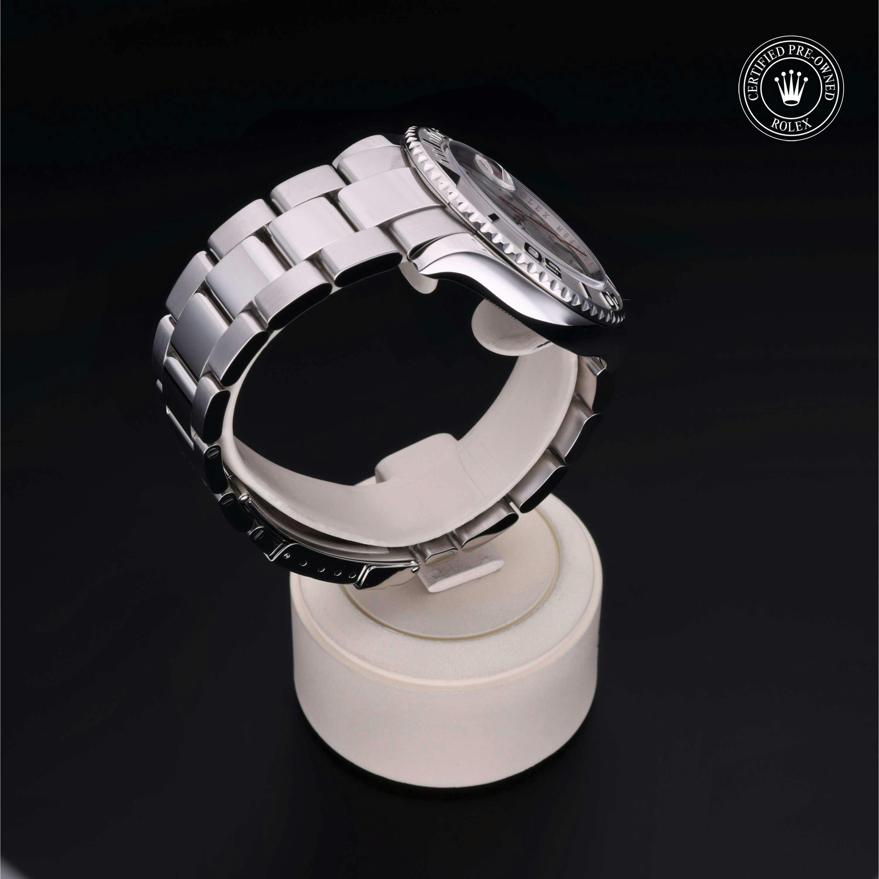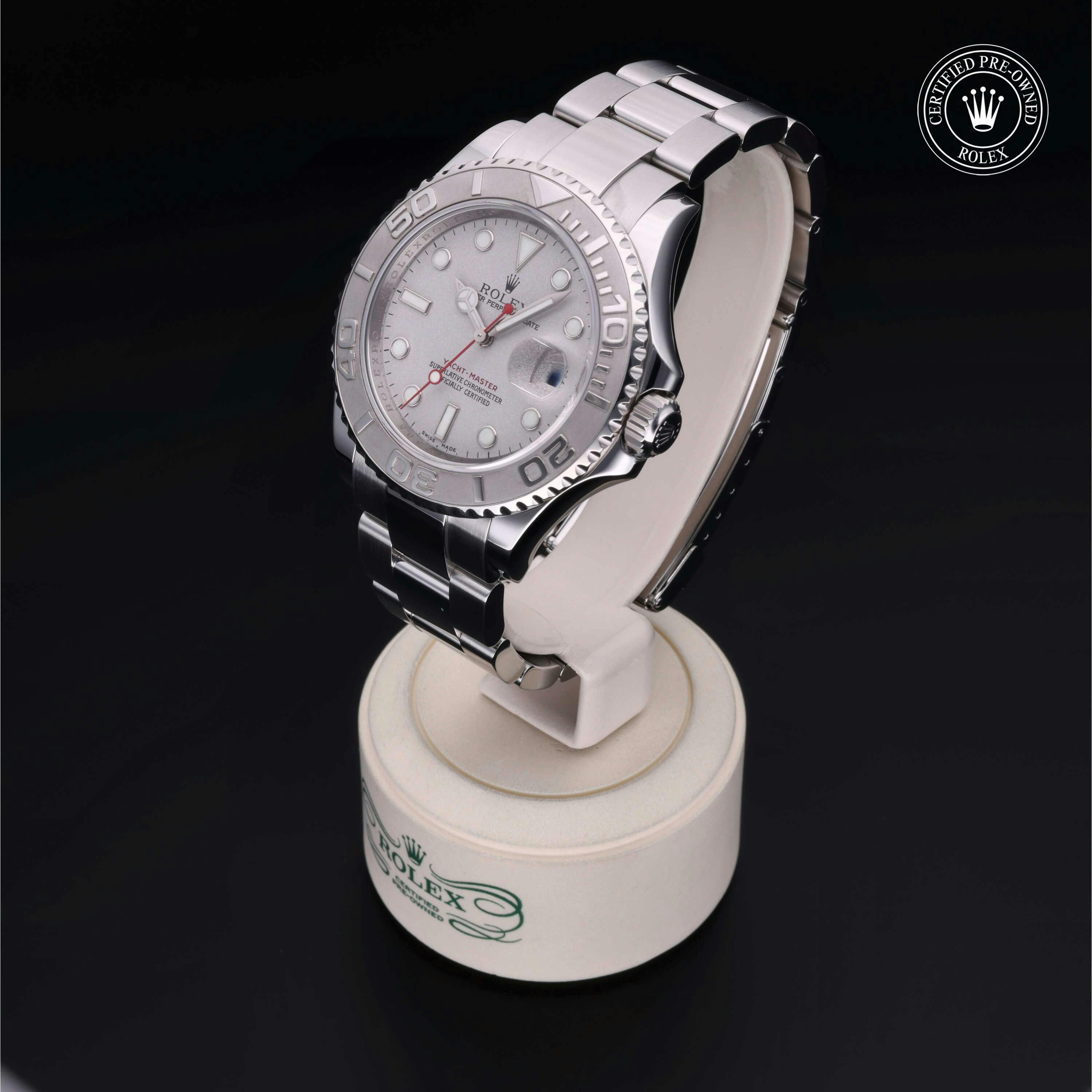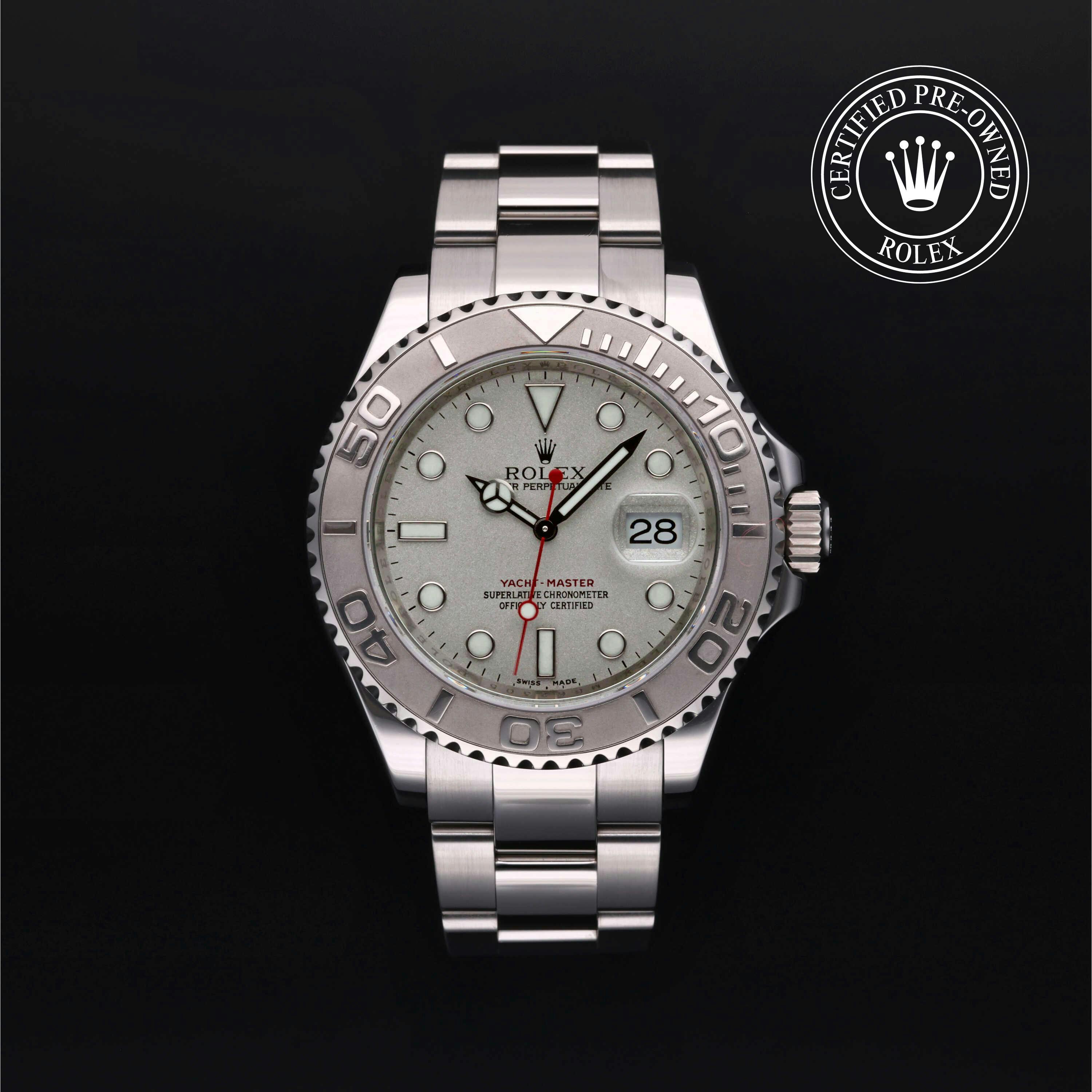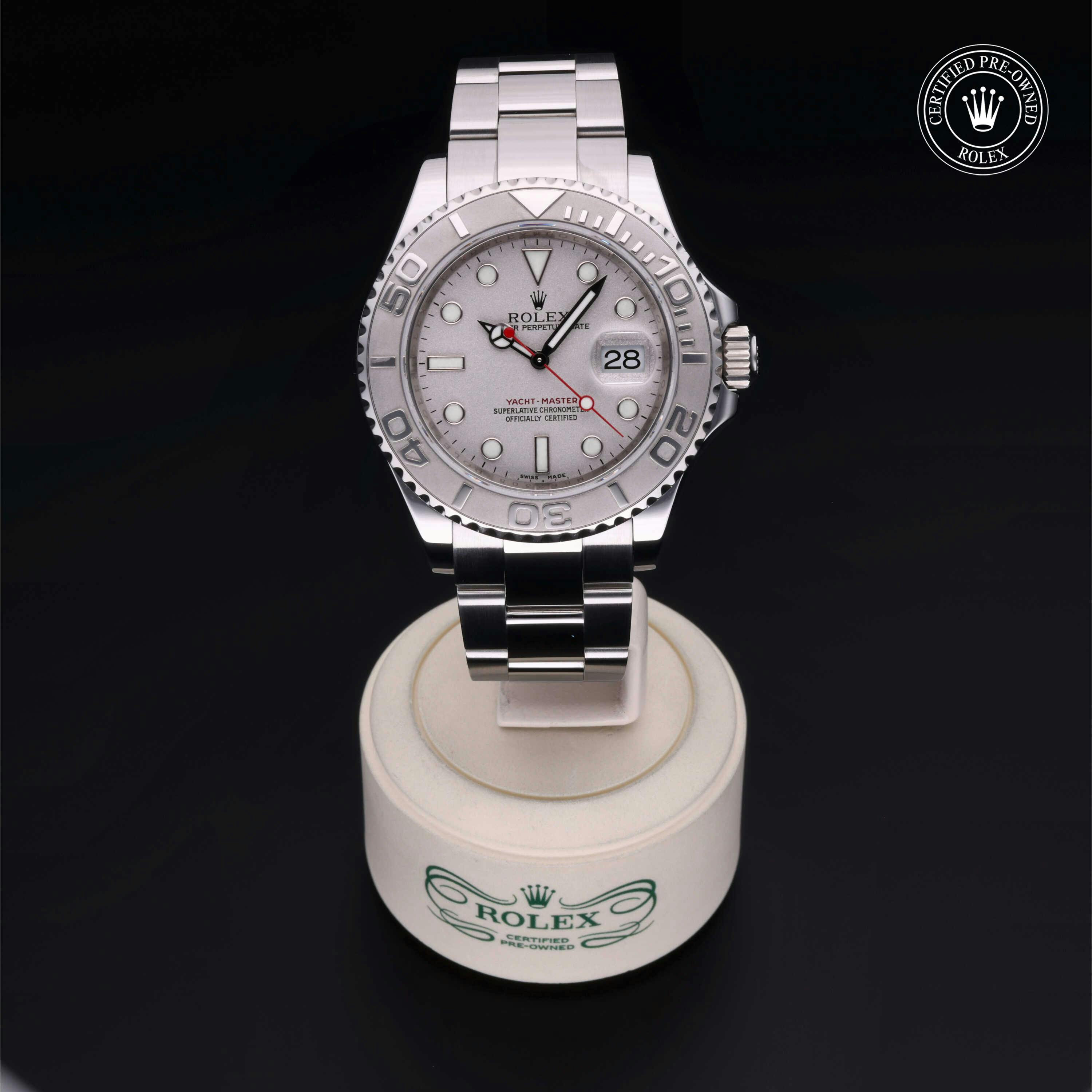 Rolex Certified Pre-Owned Yacht-Master (16622) self - winding automatic watch, features a 40mm stainless steel case with a platinum rotating bezel surrounding a platinum dial on a stainless steel oyster bracelet. Functions include hours, minutes, seconds and date. This watch has received Rolex-authorized service and certification. It does not come with the original box or papers, but includes a custom Rolex Certified Pre-Owned hang tag, travel pouch and RCPO international warranty card.