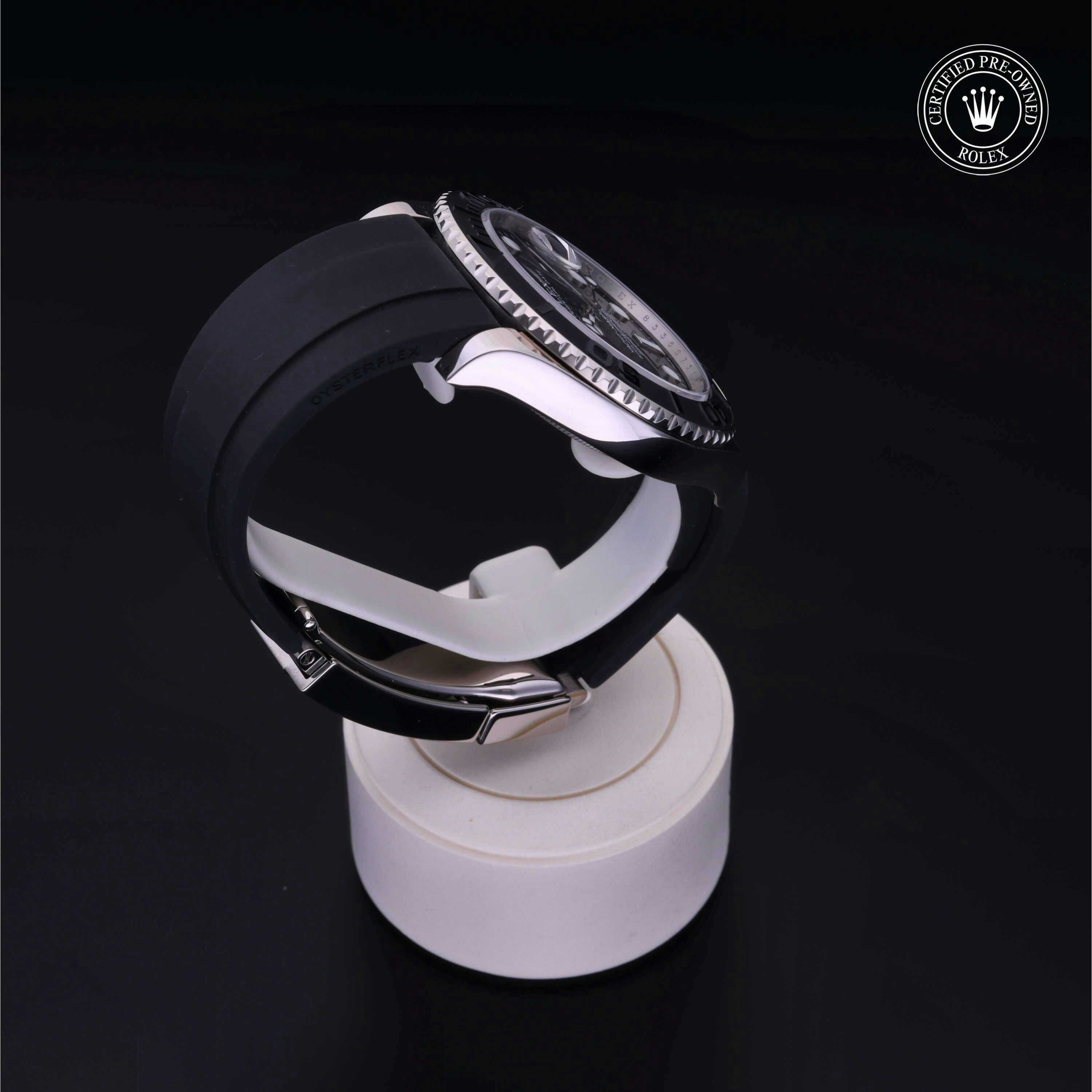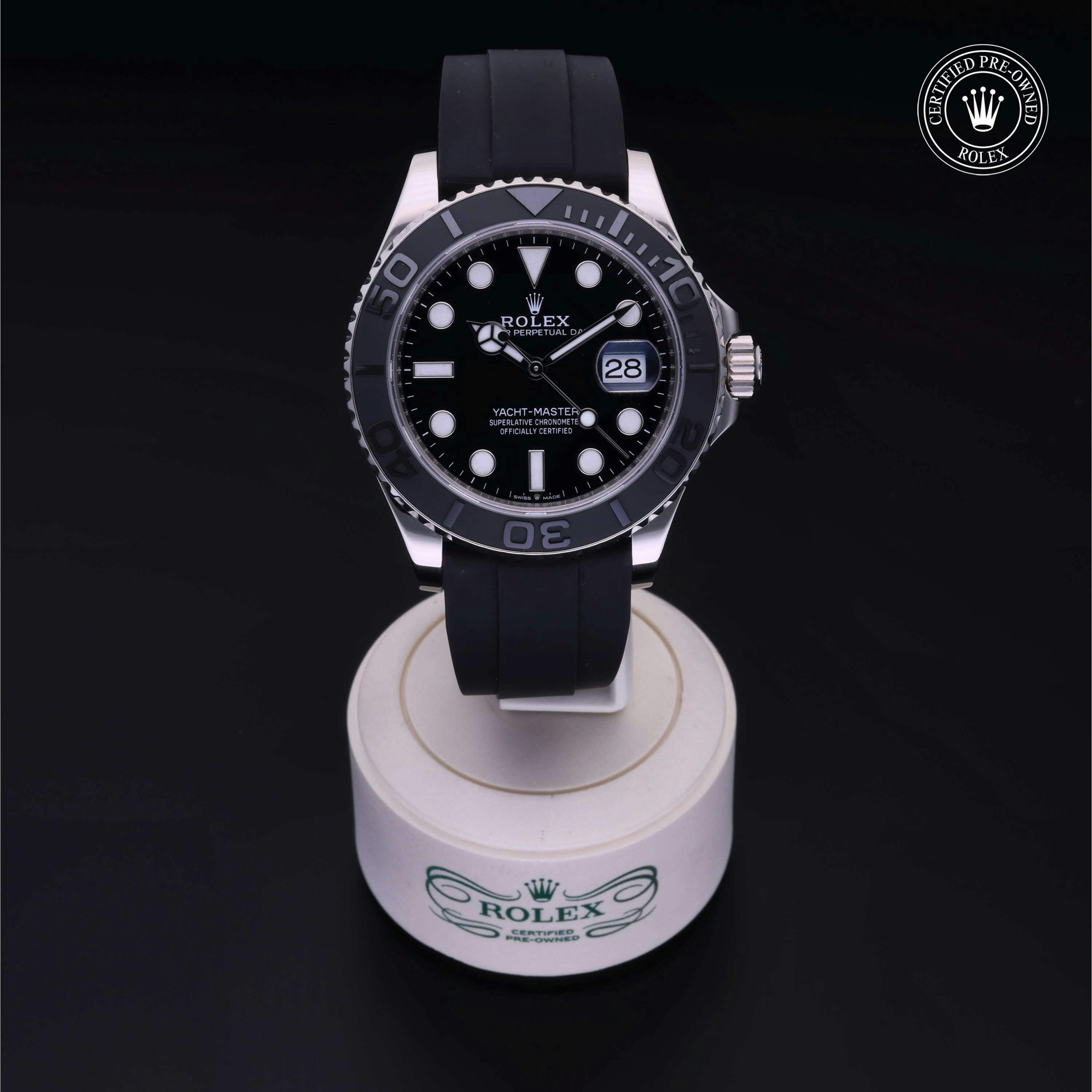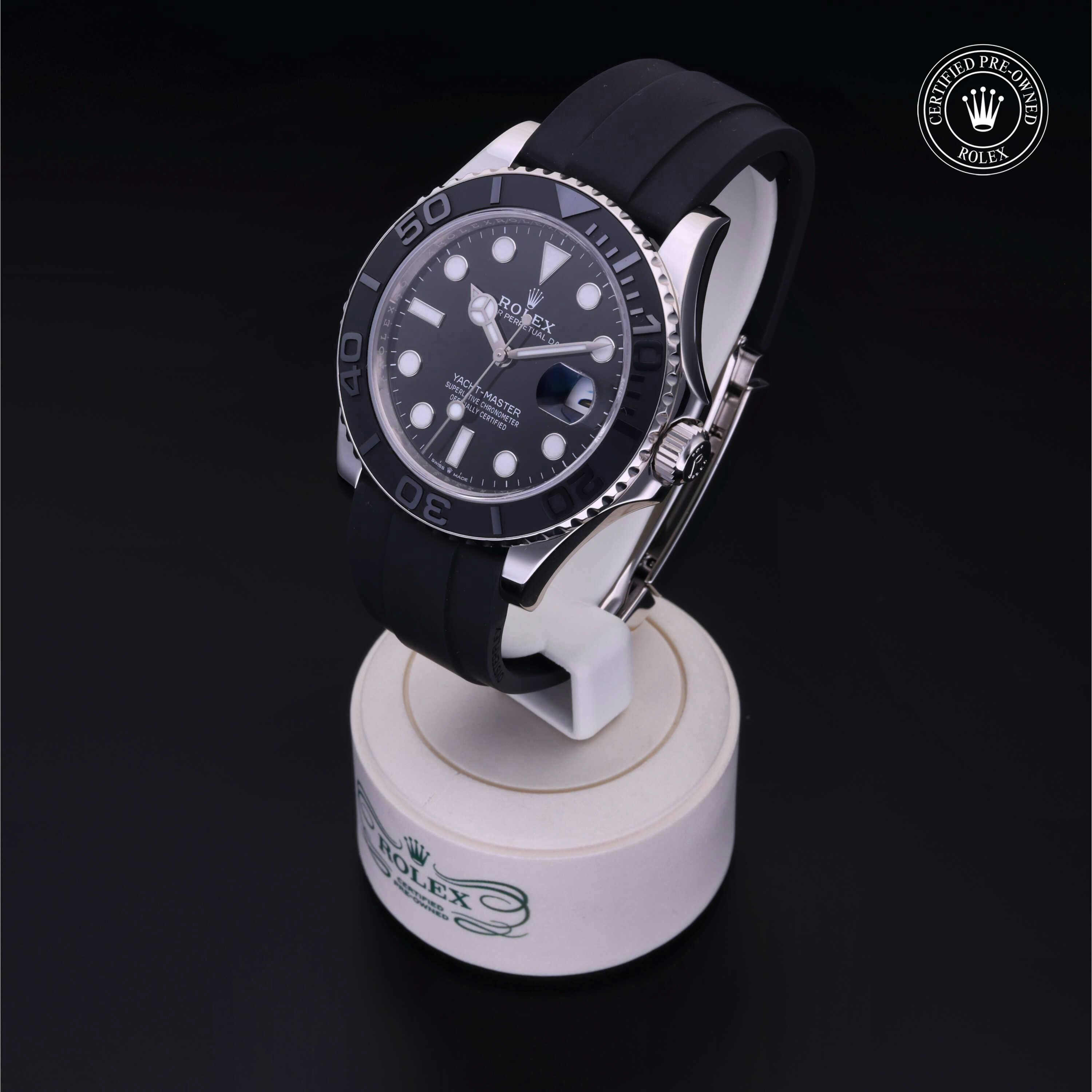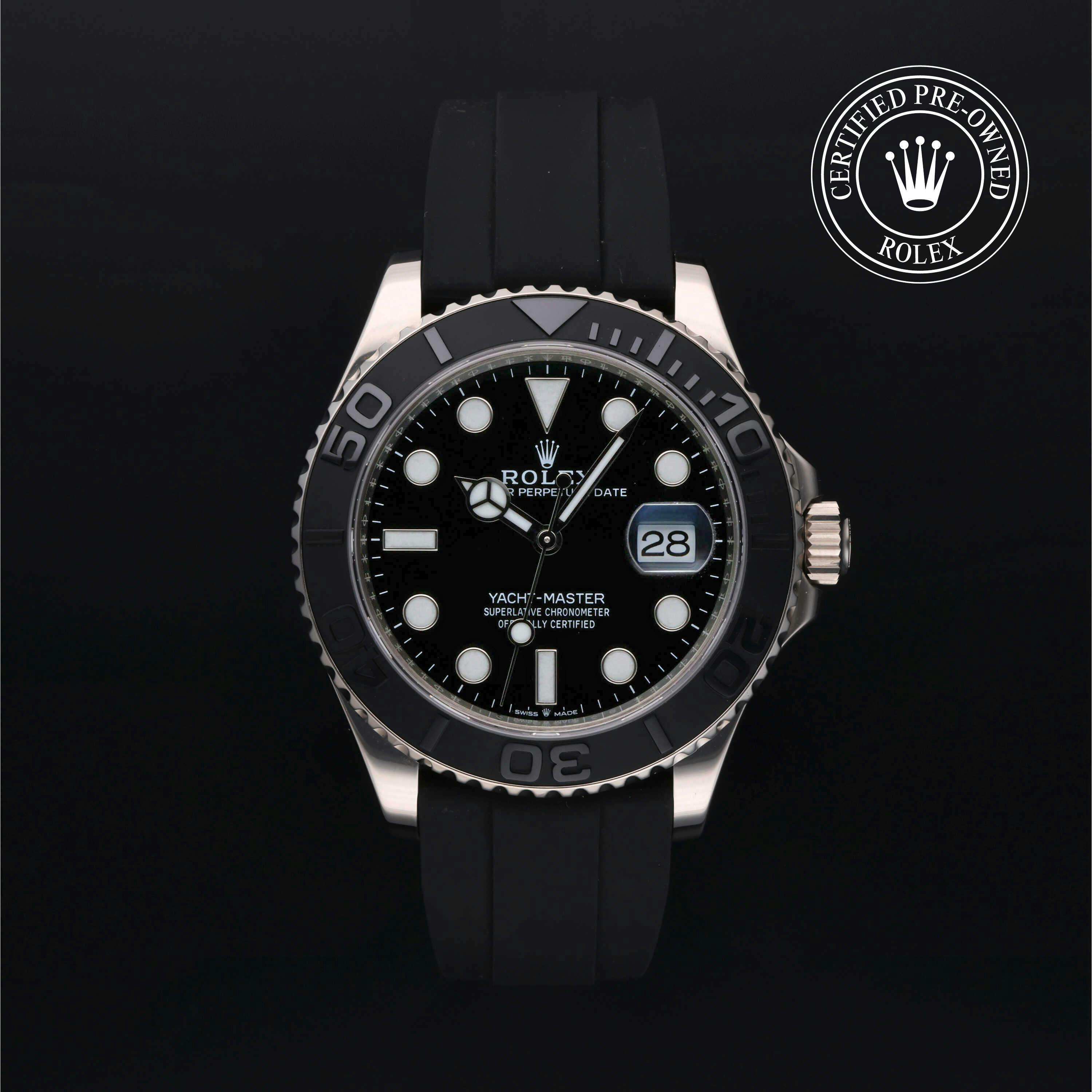 Rolex Certified Pre-Owned Yacht-Master (226659) self - winding automatic watch, features a 42mm 18k white gold case and bidirectional rotating bezel with a matte black cerachrom insert surrounding a black dial on a black oysterflex strap with an 18k yellow gold deployant buckle. Functions include hours, minutes, seconds and date. This watch has received Rolex-authorized service and certification. It does not come with the original box or papers, but includes a custom Rolex Certified Pre-Owned hang tag, travel pouch and RCPO international warranty card.