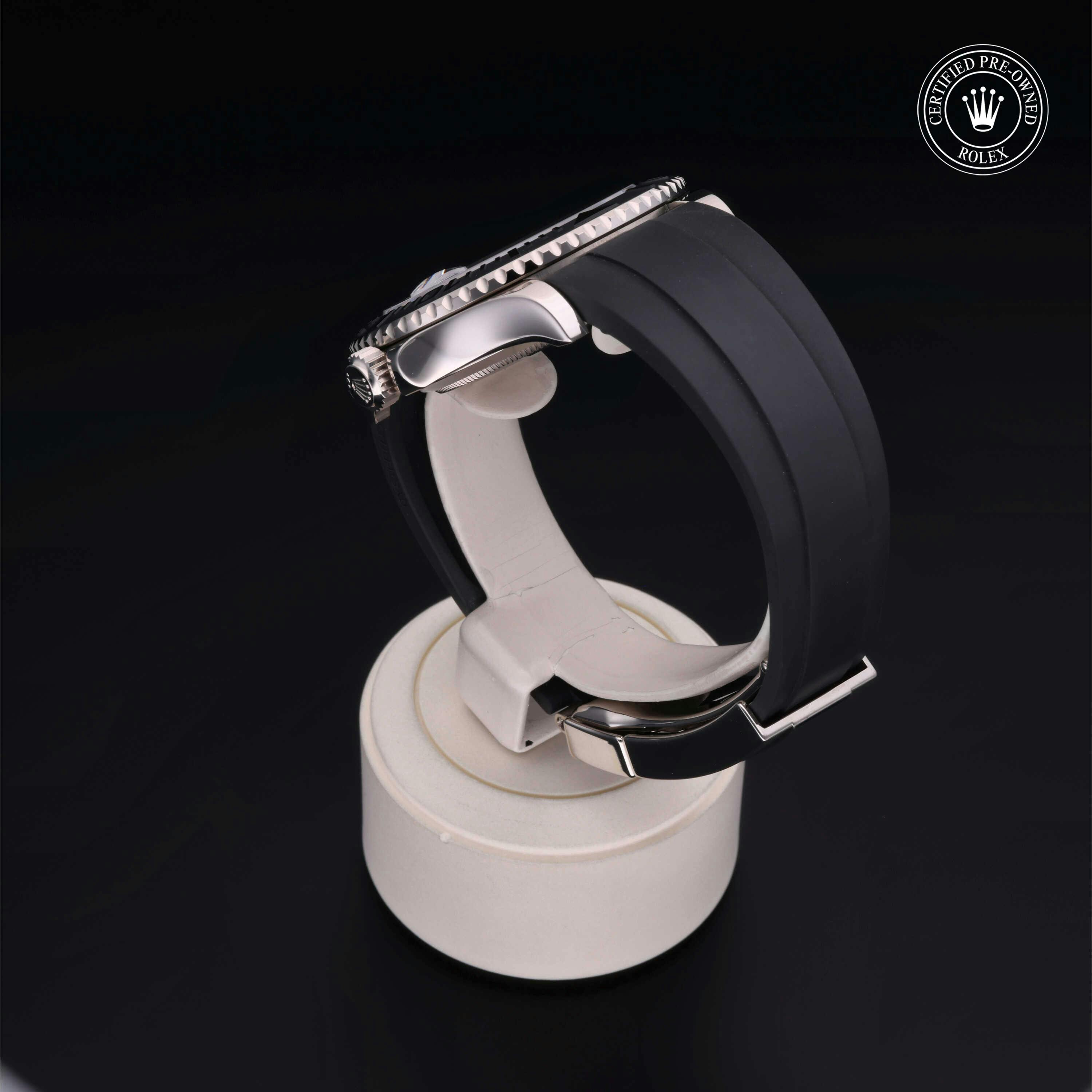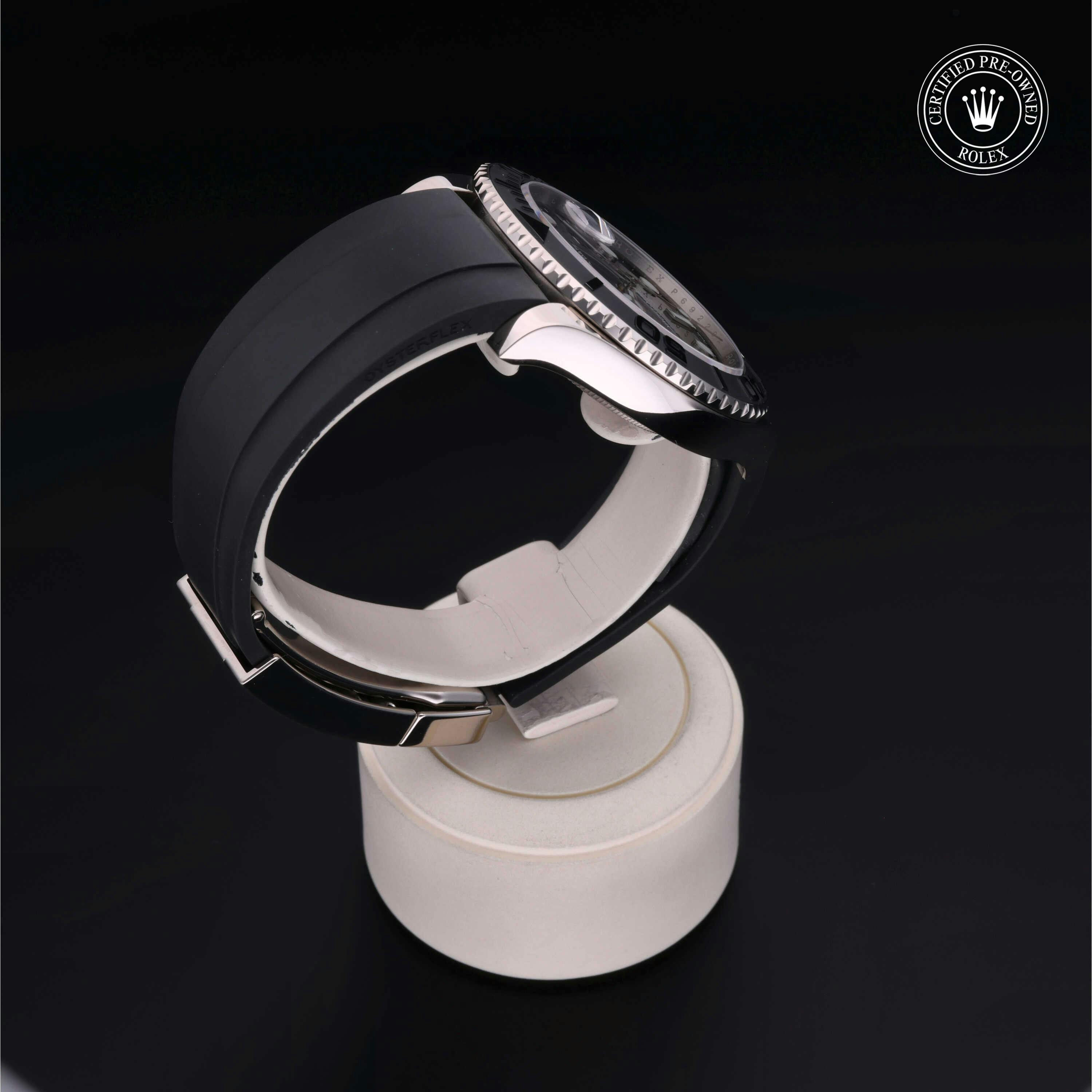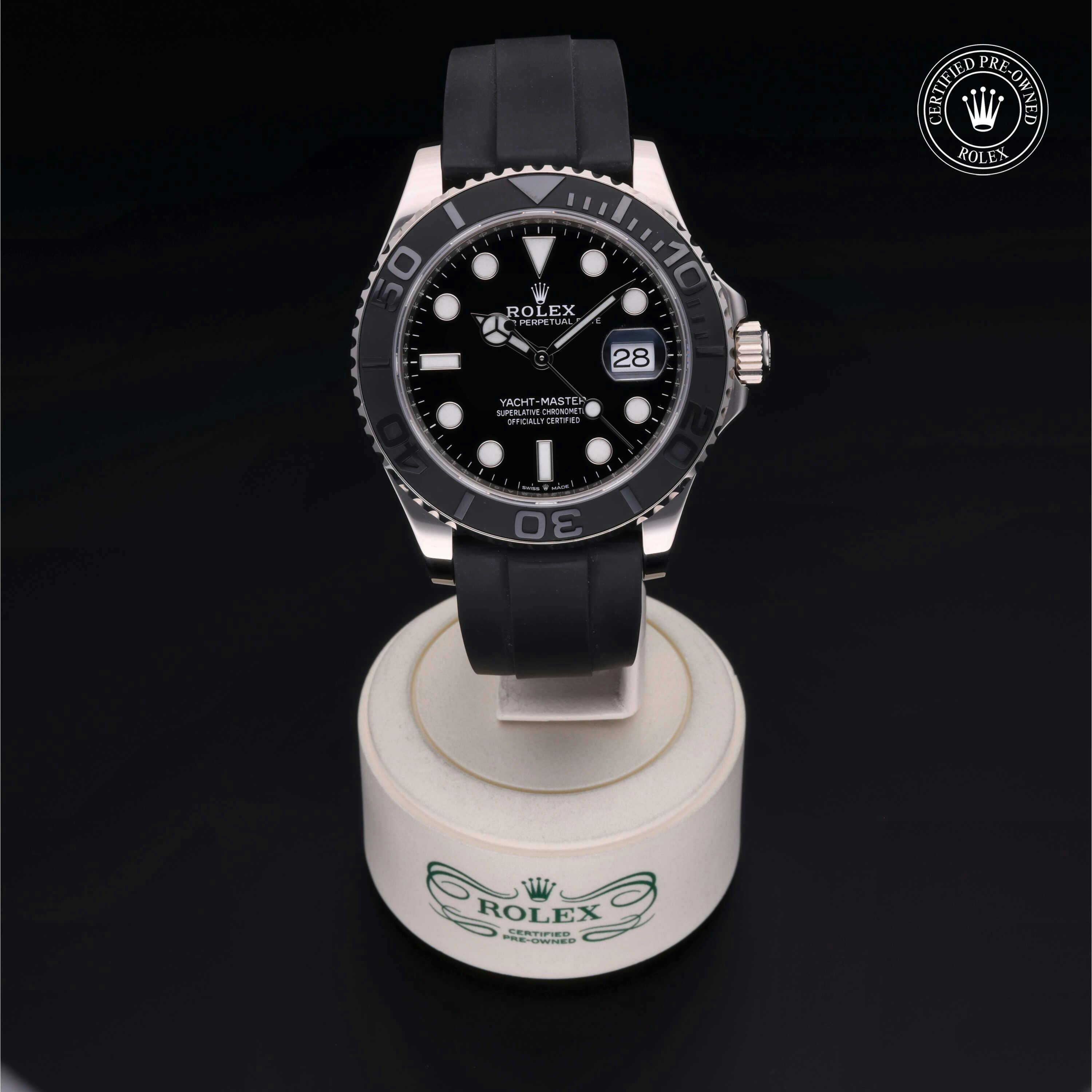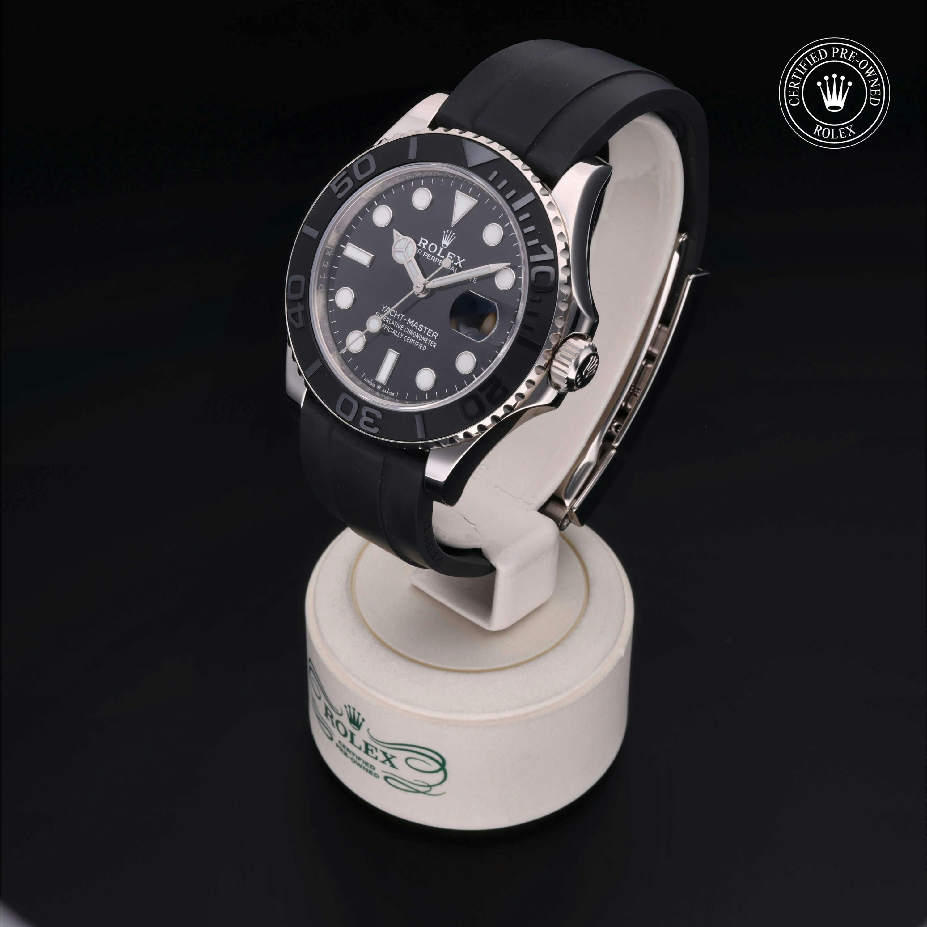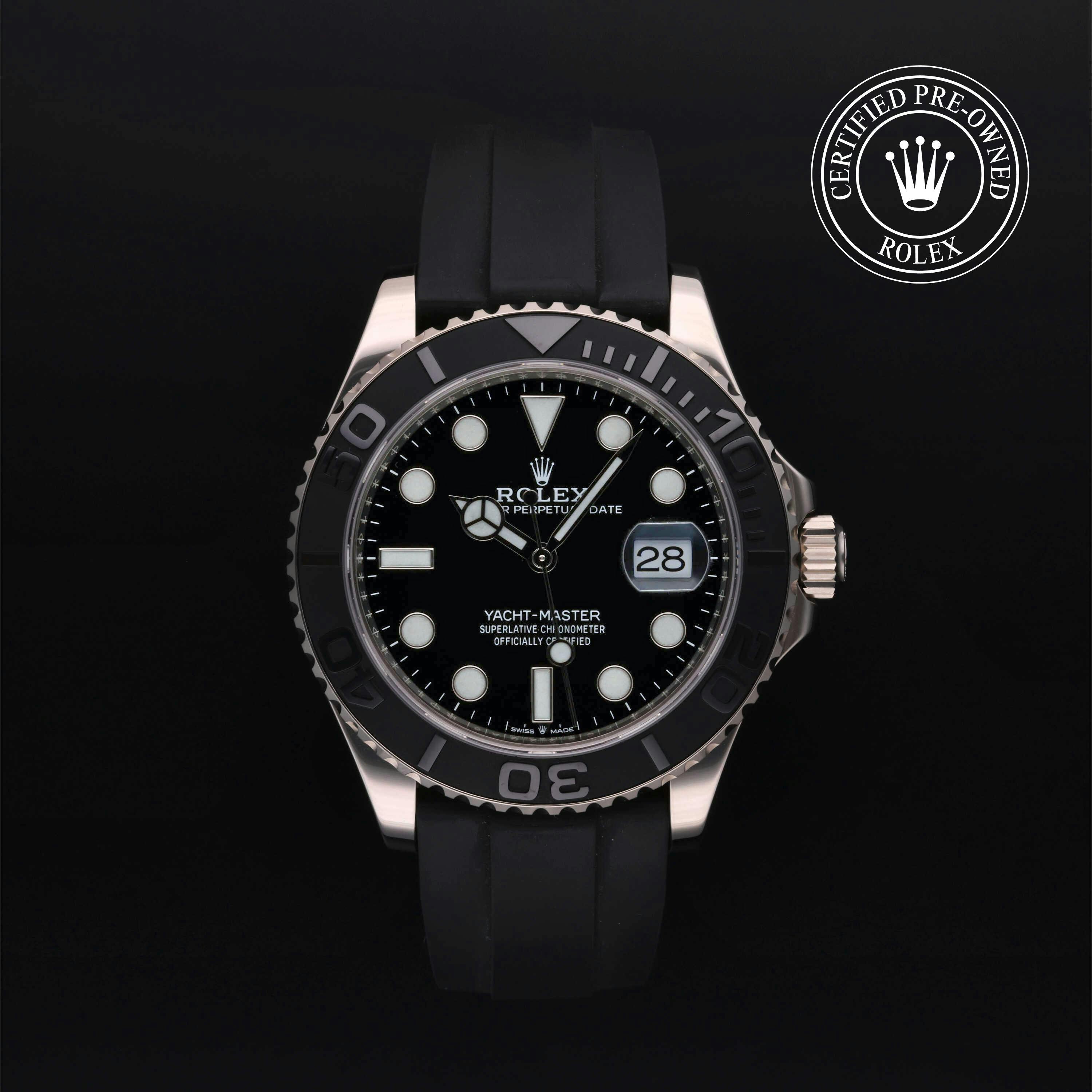 Rolex Certified Pre-Owned Yacht-Master (226659) self - winding automatic watch, features a 42mm 18k white gold case with a matte black cerachrom bezel insert surrounding a black dial on a black oysterflex strap with an 18k white gold deployant buckle. Functions include hours, minutes, seconds and date. This watch has received Rolex-authorized service and certification. It comes with the original box and papers, and includes a custom Rolex Certified Pre-Owned hang tag, travel pouch and RCPO international warranty card.