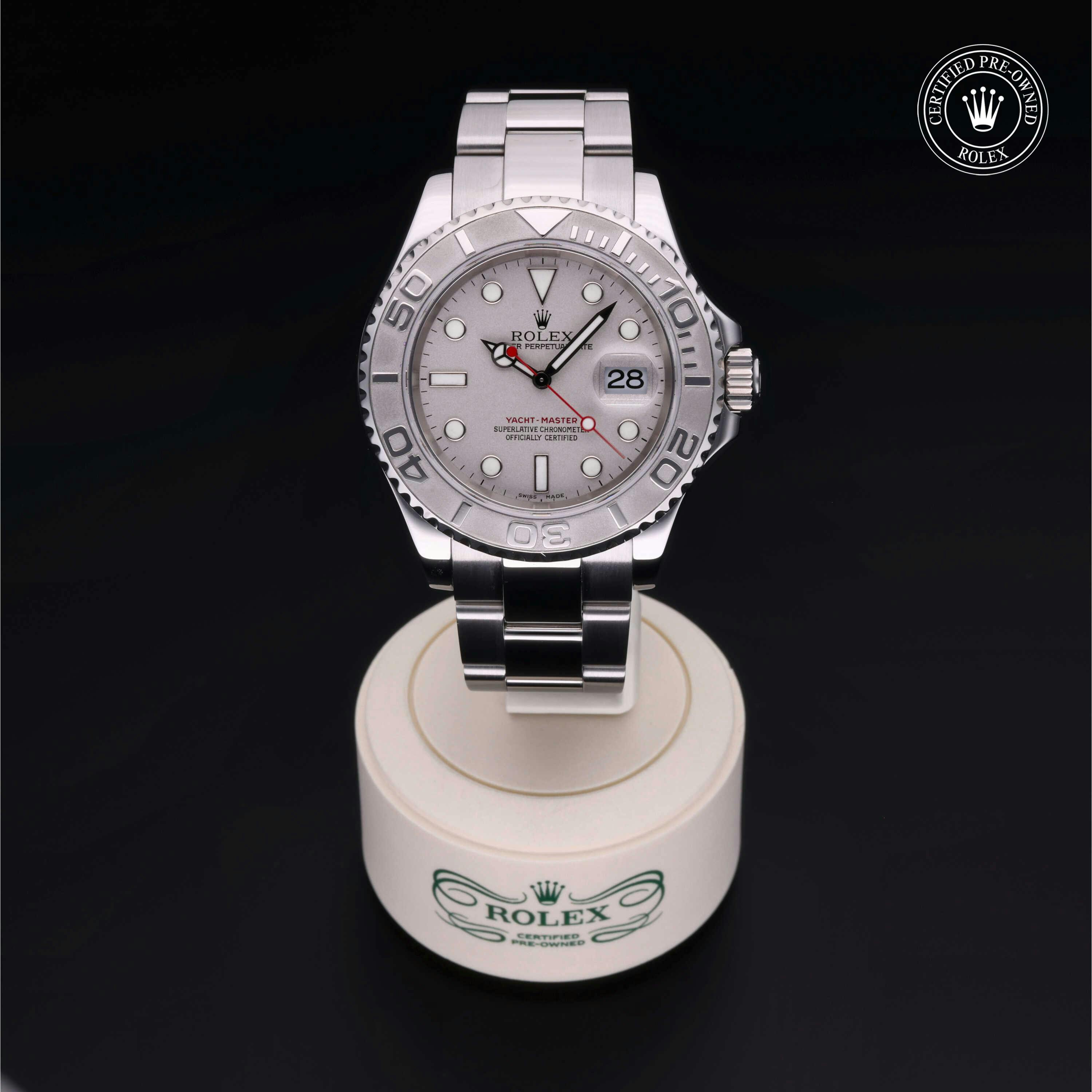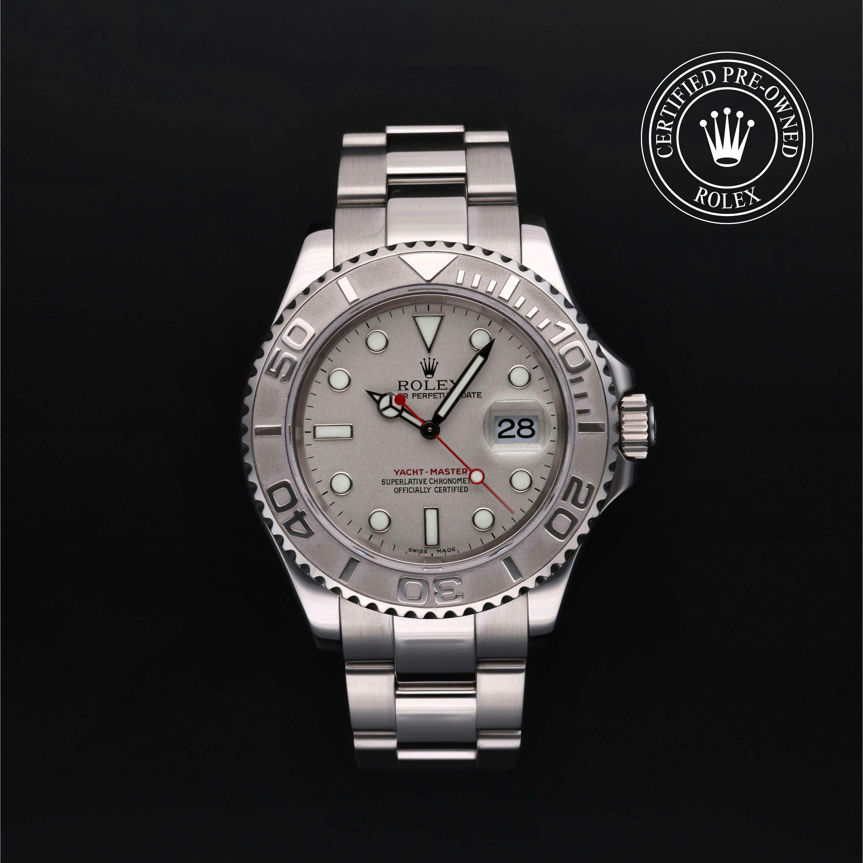 Rolex Certified Pre-Owned Yacht-Master (16622) self - winding automatic watch, features a 40mm stainless steel case with a platinum rotating bezel insert surrounding a platinum dial on a stainless steel oyster bracelet. Functions include hours, minutes, seconds and date. This watch has received Rolex-authorized service and certification. It comes with the original box, and includes a custom Rolex Certified Pre-Owned hang tag, travel pouch and RCPO international warranty card.