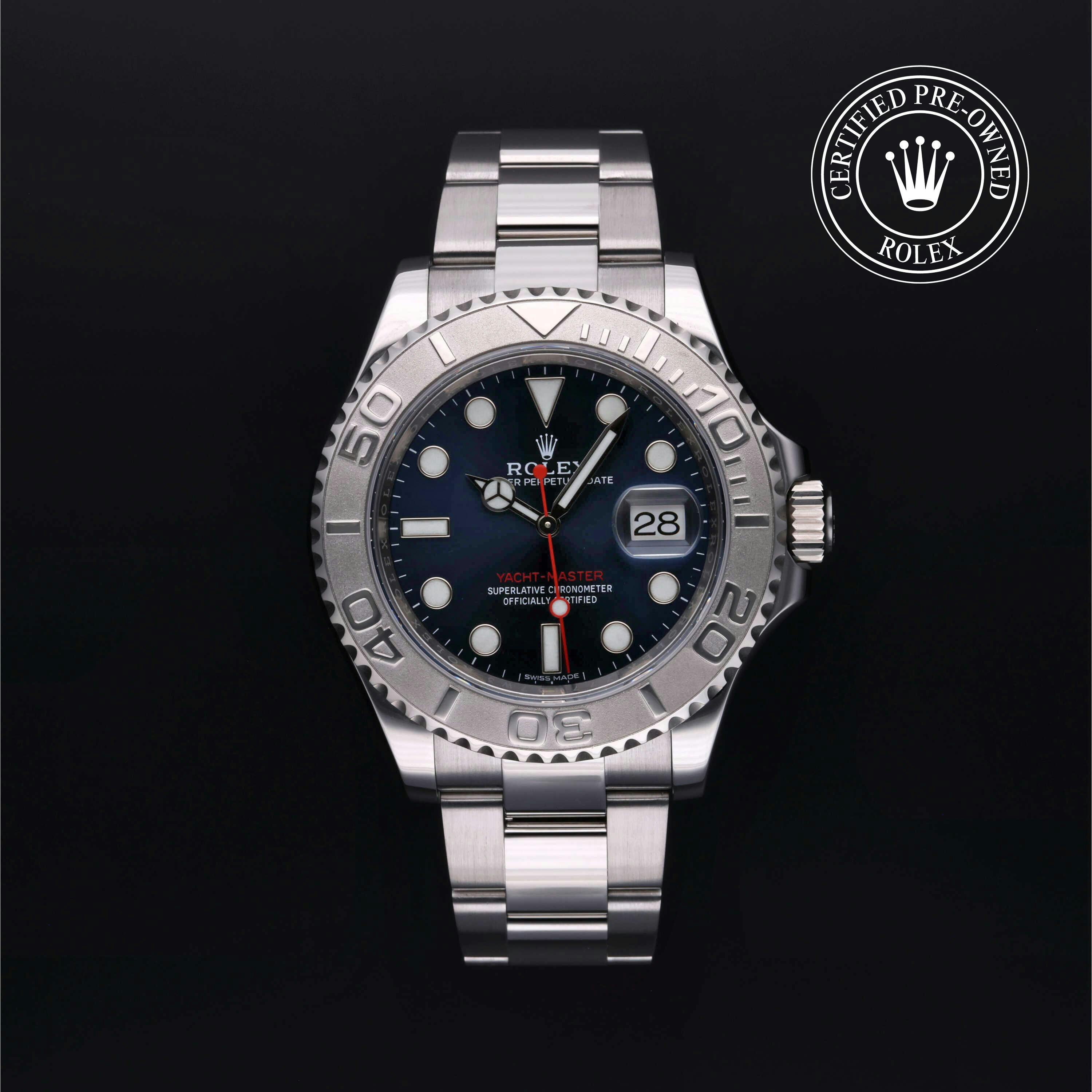 Rolex Certified Pre-Owned Yacht-Master (116622) self - winding automatic watch, features a 40mm stainless steel case and bidirectional rotating bezel with a platinum insert surrounding a blue dial on a stainless steel oyster bracelet. Functions include hours, minutes, seconds and date. This watch has received Rolex-authorized service and certification. It does not come with the original box or papers, but includes a custom Rolex Certified Pre-Owned hang tag, travel pouch and RCPO international warranty card.
