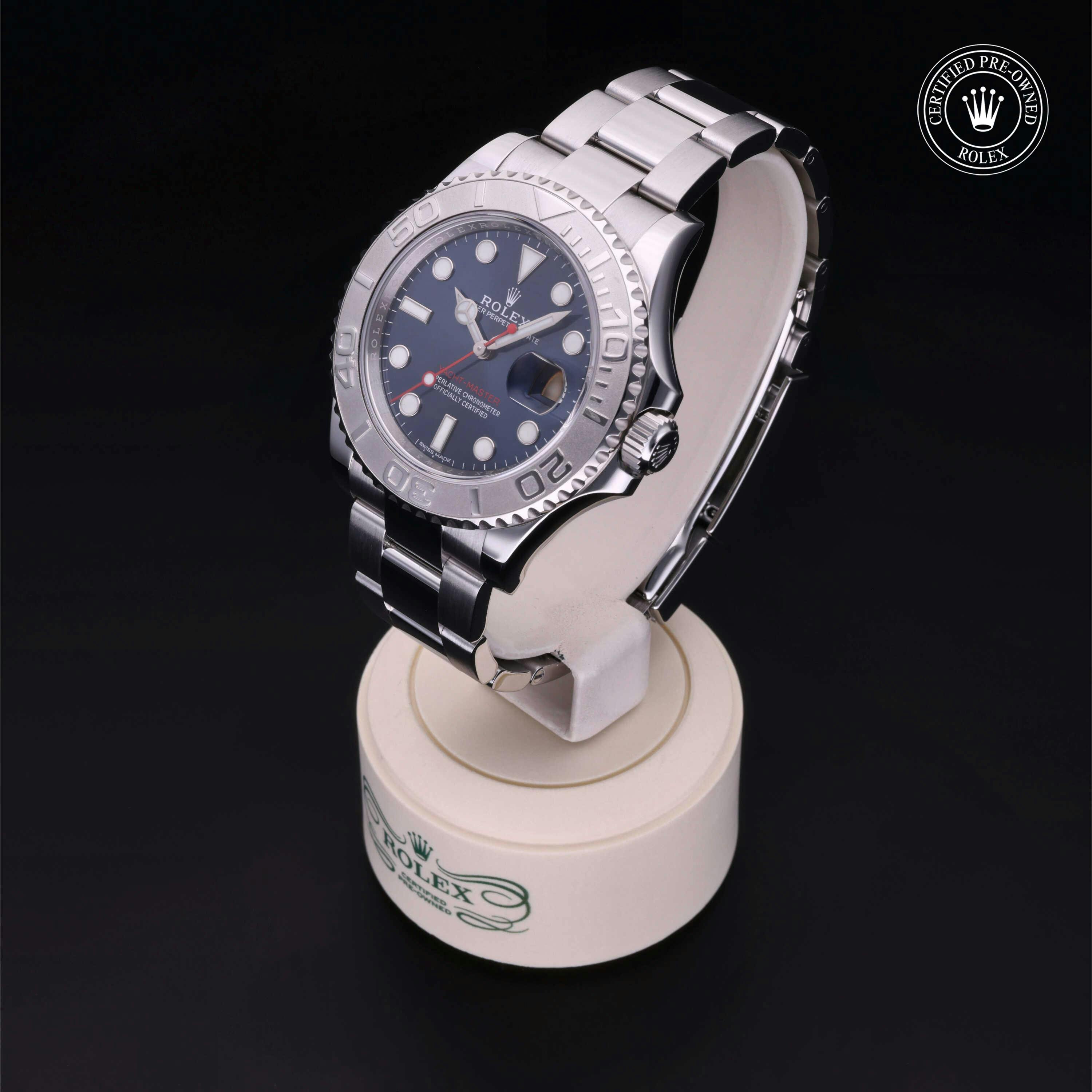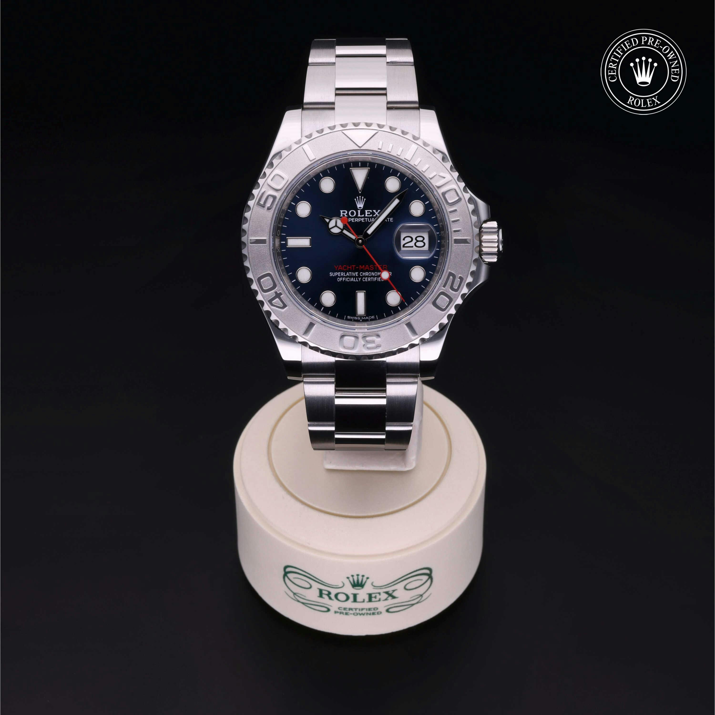 Rolex Certified Pre-Owned Yacht-Master (116622) self - winding automatic watch, features a 40mm stainless steel case and bidirectional rotating bezel with a platinum insert surrounding a blue dial on a stainless steel oyster bracelet. Functions include hours, minutes, seconds and date. This watch has received Rolex-authorized service and certification. It does not come with the original box or papers, but includes a custom Rolex Certified Pre-Owned hang tag, travel pouch and RCPO international warranty card.