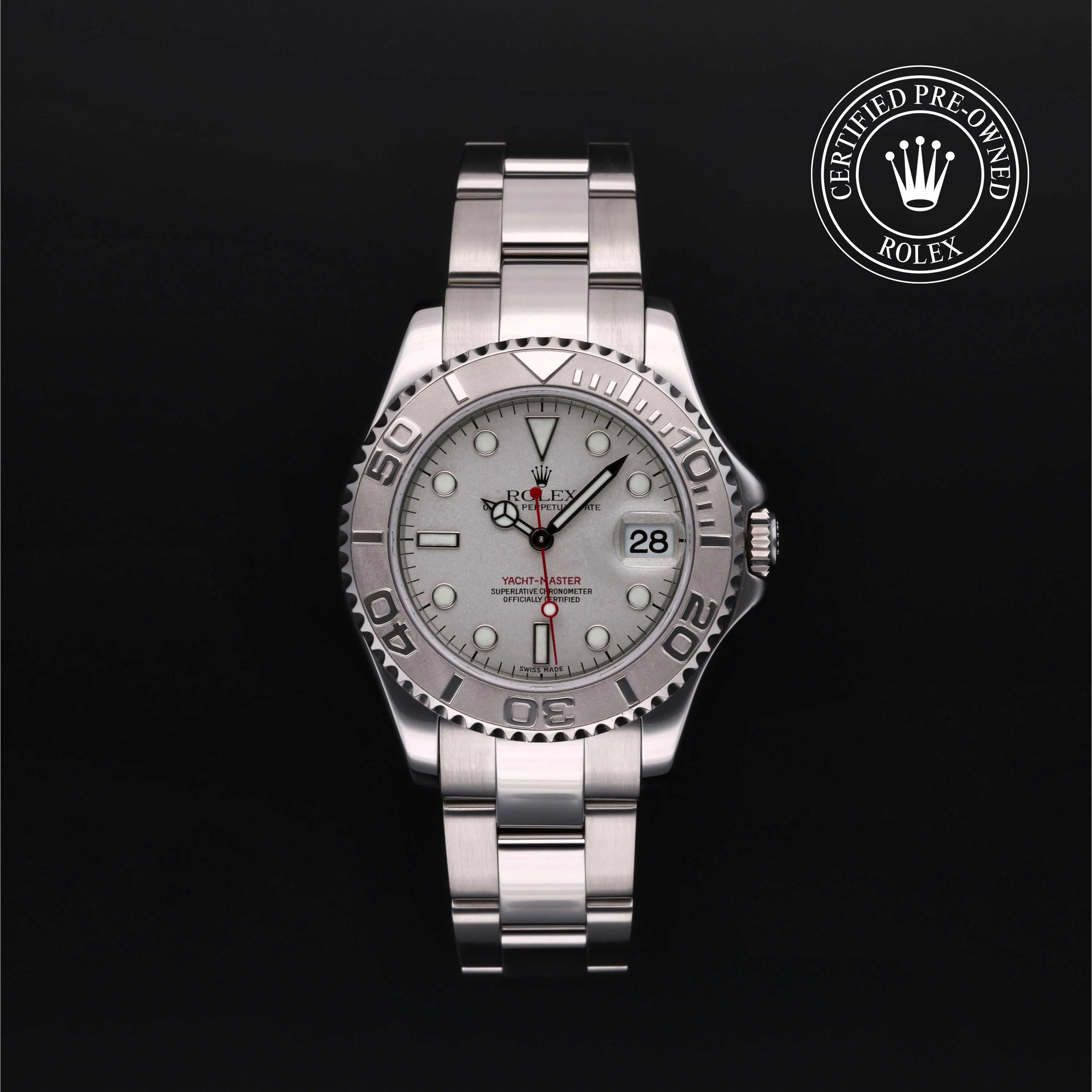 Rolex Certified Pre-Owned Yacht-Master (168622) self - winding automatic watch, features a 35mm stainless steel case with a platinum bidirectional rotating 60-minute scale bezel surrounding a platinum dial. The watch is secured on a stainless steel Oyster bracelet complete with a folding buckle. Functions include hours, minutes, seconds and date. This watch has received Rolex-authorized service and certification. It comes with the original papers, and includes a custom Rolex Certified Pre-Owned hang tag, travel pouch and RCPO international warranty card.