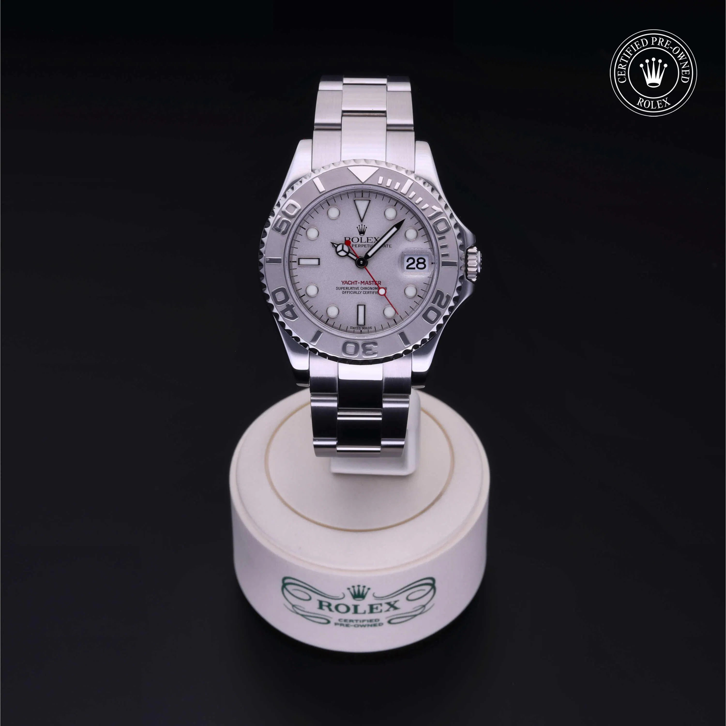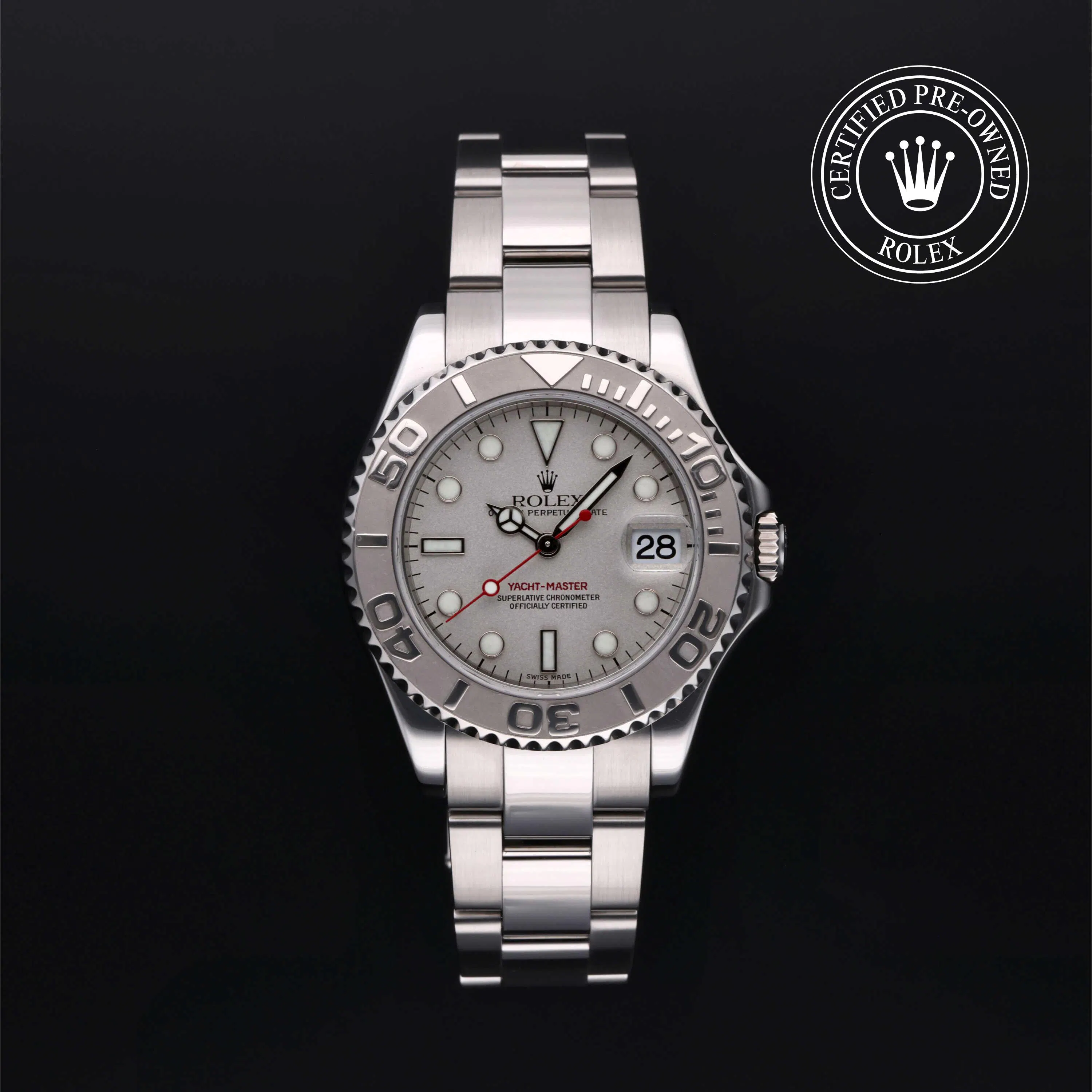 Rolex Certified Pre-Owned Yacht-Master (168622) self - winding automatic watch, features a 35mm stainless steel case with a platinum bidirectional rotating bezel fitted with a 60-minute scale insert, surrounding a platinum dial. The watch is secured on a stainless steel Oyster bracelet complete with a folding buckle. Functions include hours, minutes, seconds and date. This watch has received Rolex-authorized service and certification. It comes with the original papers, and includes a custom Rolex Certified Pre-Owned hang tag, travel pouch and RCPO international warranty card.