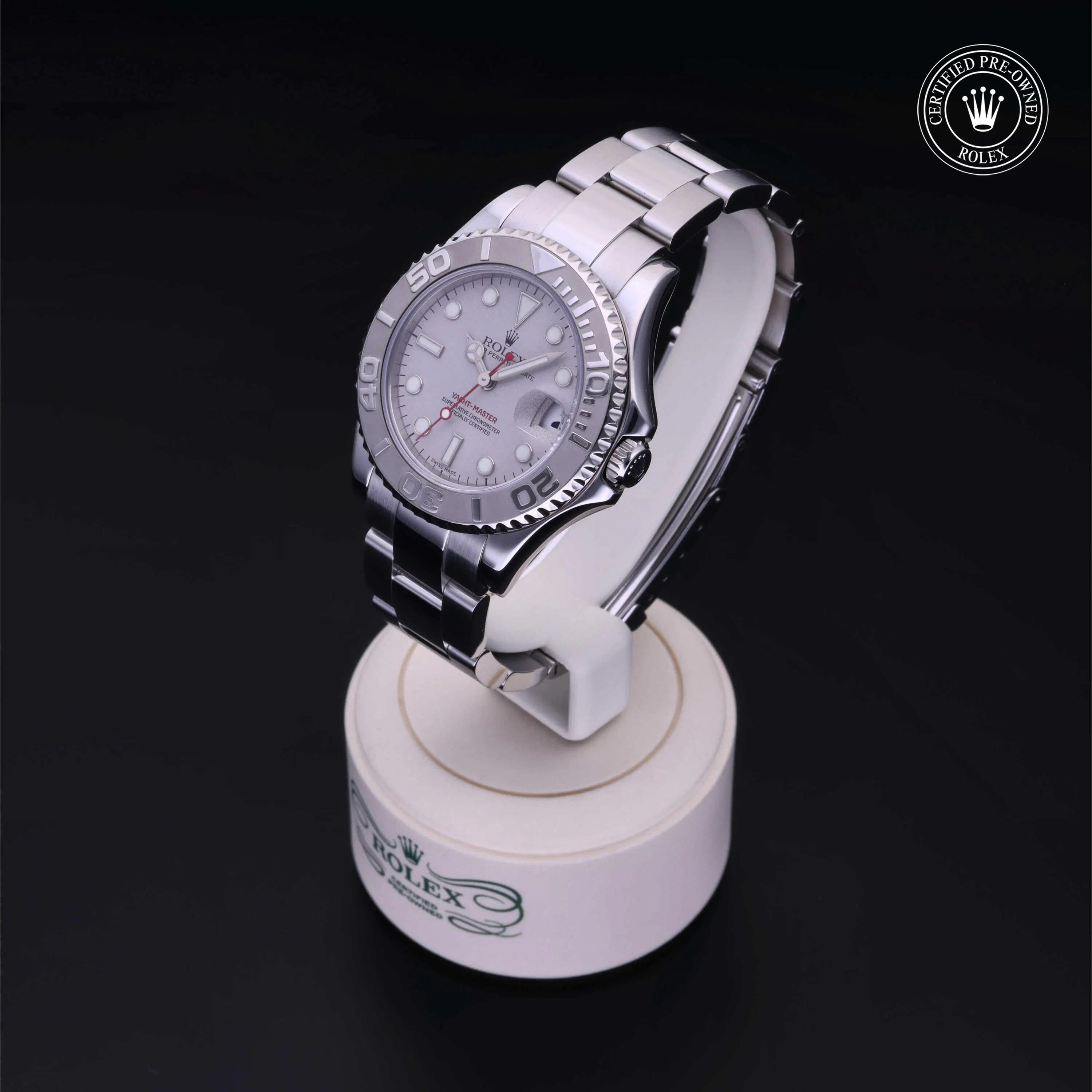 Rolex Certified Pre-Owned Yacht-Master (168622) self - winding automatic watch, features a 35mm stainless steel case with a platinum bidirectional rotating bezel fitted with a 60-minute scale insert, surrounding a platinum dial. The watch is secured on a stainless steel Oyster bracelet complete with a folding buckle. Functions include hours, minutes, seconds and date. This watch has received Rolex-authorized service and certification. It comes with the original papers, and includes a custom Rolex Certified Pre-Owned hang tag, travel pouch and RCPO international warranty card.