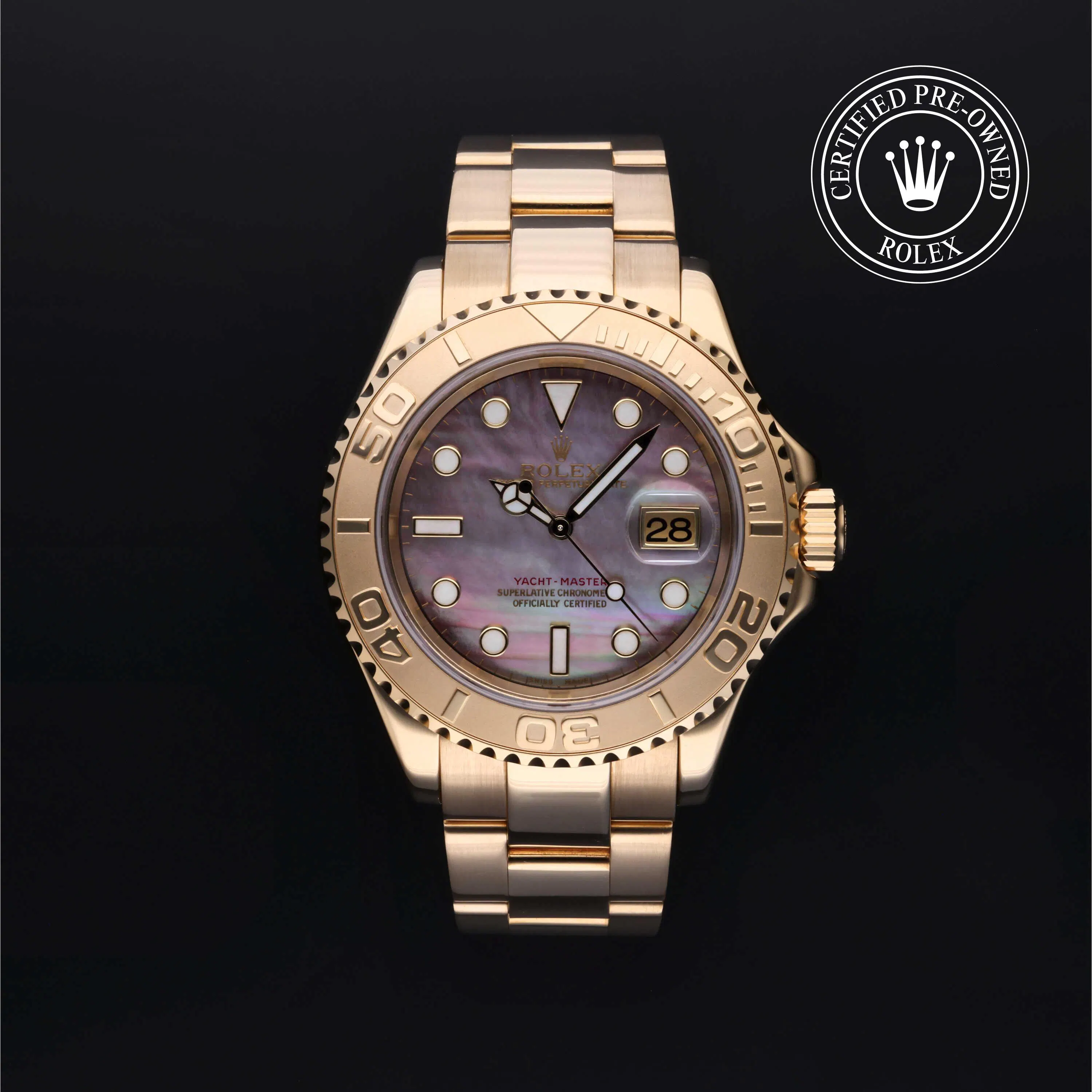 Rolex Certified Pre-Owned Yacht-Master (16628) self - winding automatic watch, features a 40mm 18k yellow gold case and rotating bezel surrounding a black, mother of pearl dial on an 18k yellow gold Oyster bracelet. Functions include hours, minutes, seconds and date. This watch has received Rolex-authorized service and certification. It comes with the original papers, and includes a custom Rolex Certified Pre-Owned hang tag, travel pouch and RCPO international warranty card.