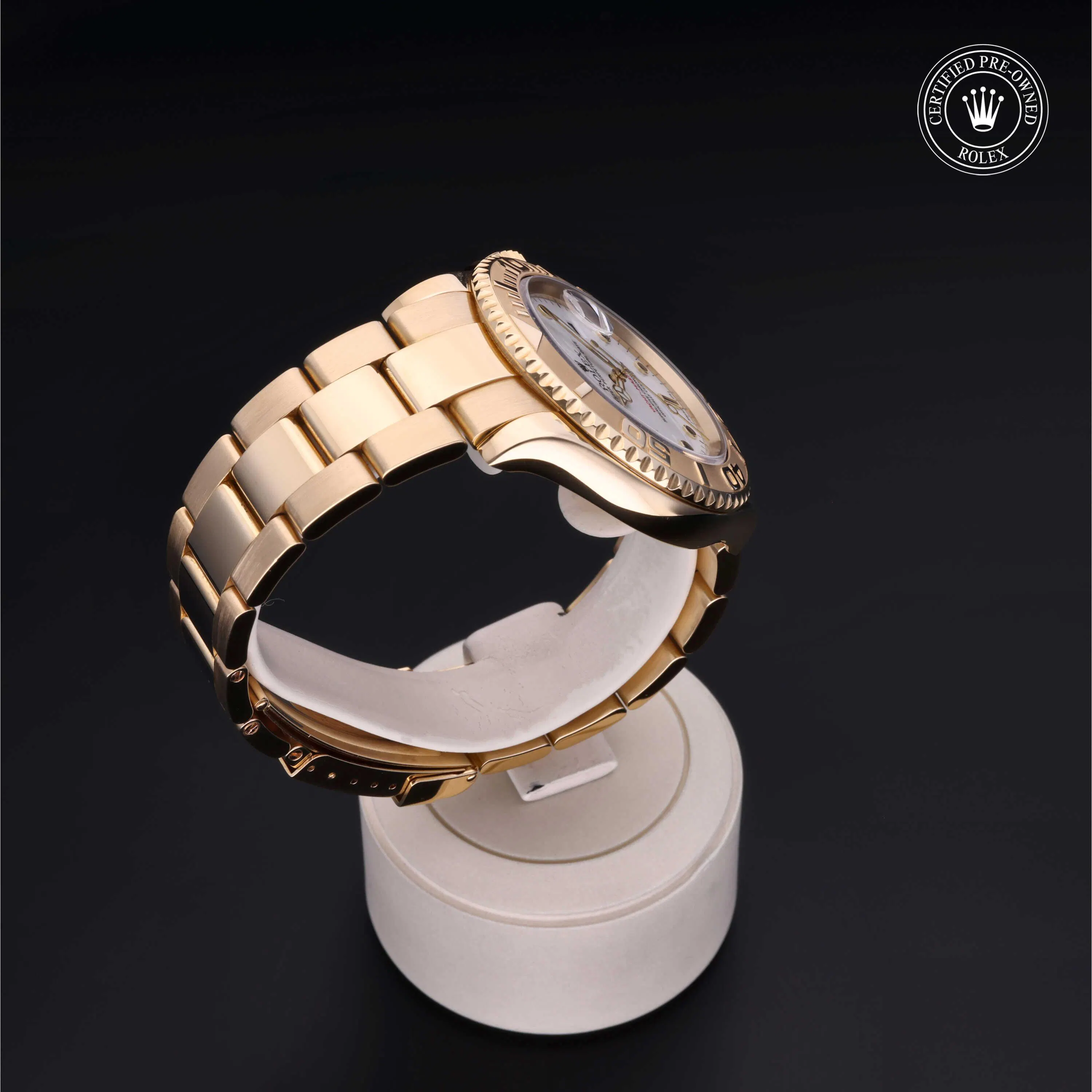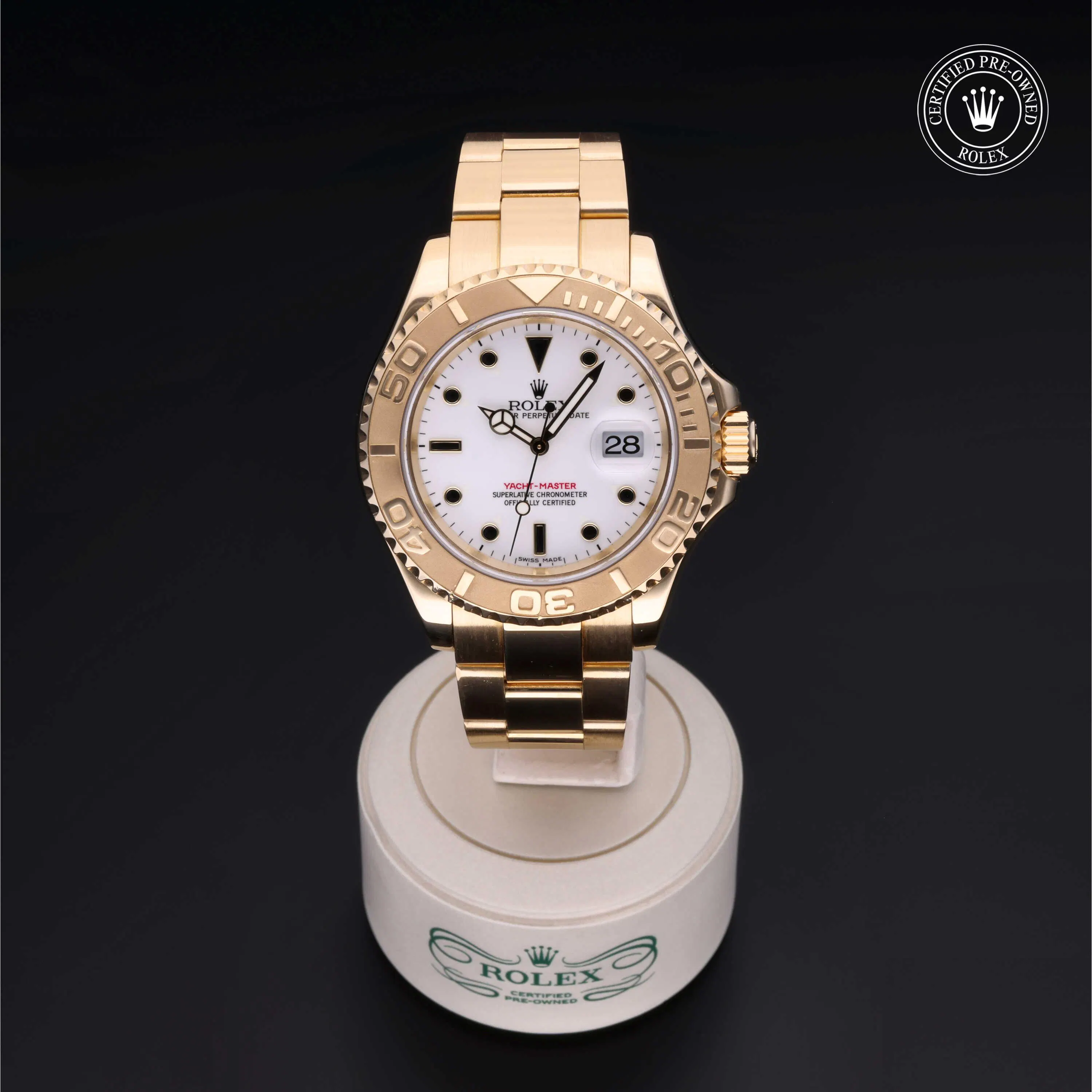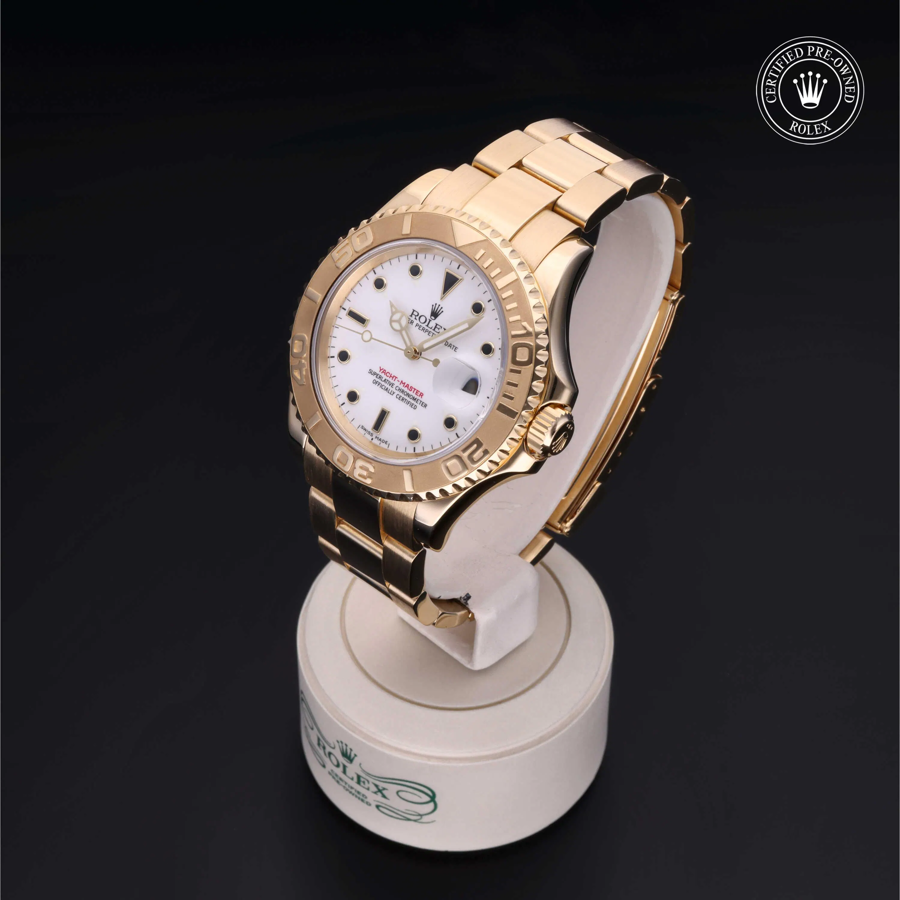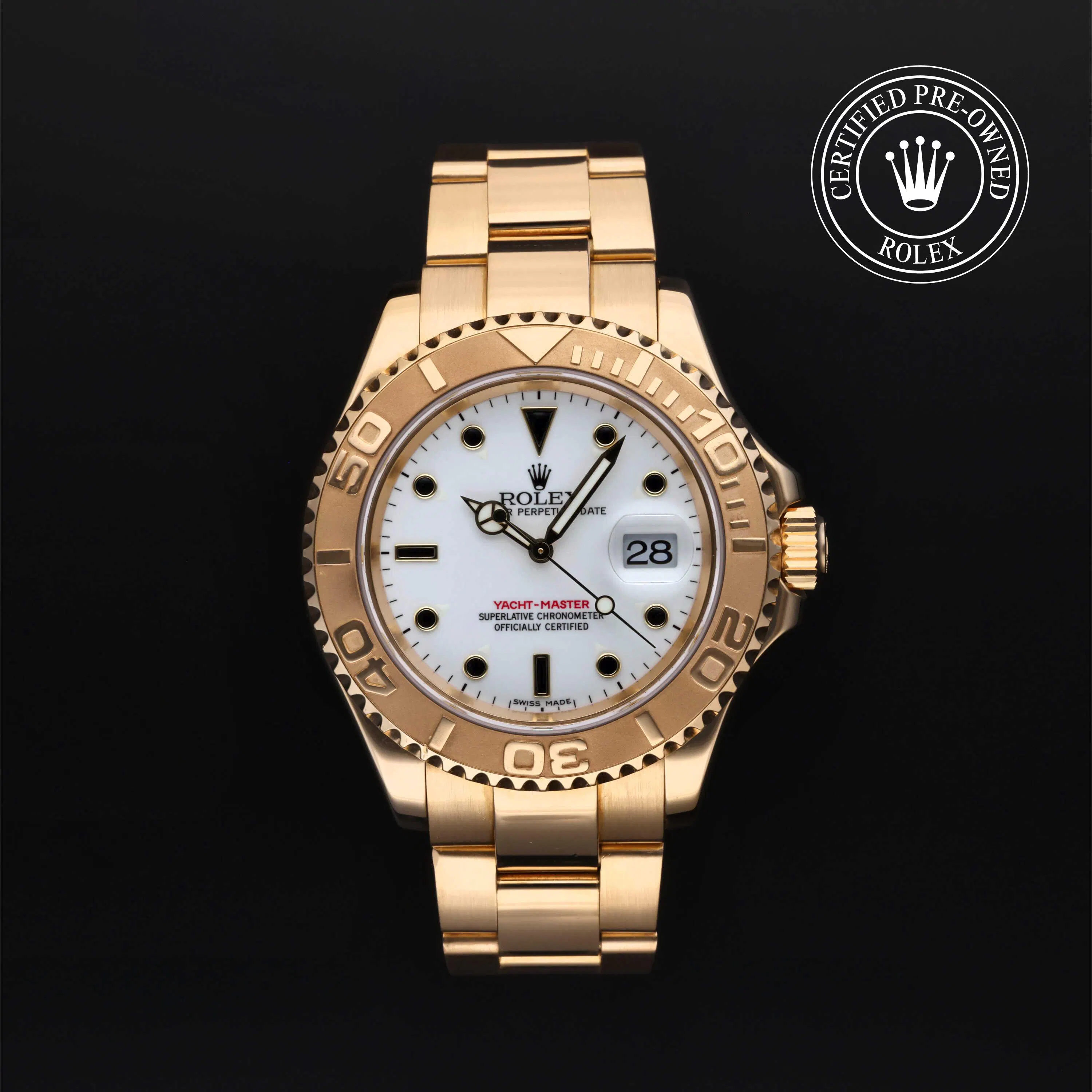 Rolex Certified Pre-Owned Yacht-Master (16628) self - winding automatic watch, features a 40mm 18k yellow gold case with a bidirectional rotating 60-minute scale bezel surrounding a white dial. The watch is secured on an 18k yellow gold Oyster bracelet complete with a folding buckle. Functions include hours, minutes, seconds and date. This watch has been serviced by an authorized service center and certified by Rolex. It comes with the original box and papers as well as a custom Rolex Certified Pre-Owned hang tag, travel pouch and international warranty card.