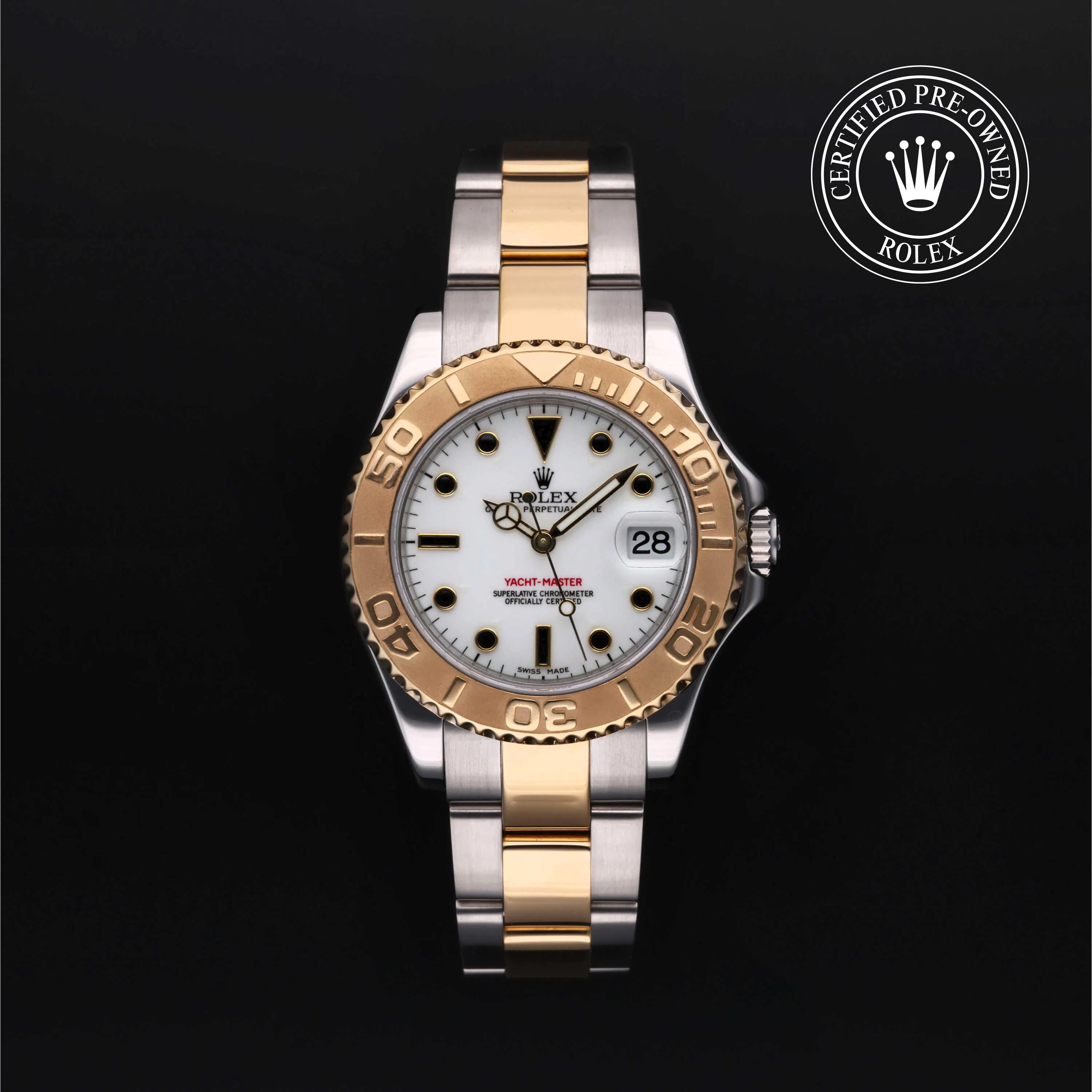 Rolex Certified Pre-Owned Yacht-Master (168623) self - winding automatic watch, features a 35mm stainless steel case with an 18k yellow gold rotating bezel surrounding a white dial on a stainless steel and 18k yellow gold oyster bracelet. Functions include hours, minutes, seconds and date. This watch has received Rolex-authorized service and certification. It does not come with the original box or papers, but includes a custom Rolex Certified Pre-Owned hang tag, travel pouch and RCPO international warranty card.