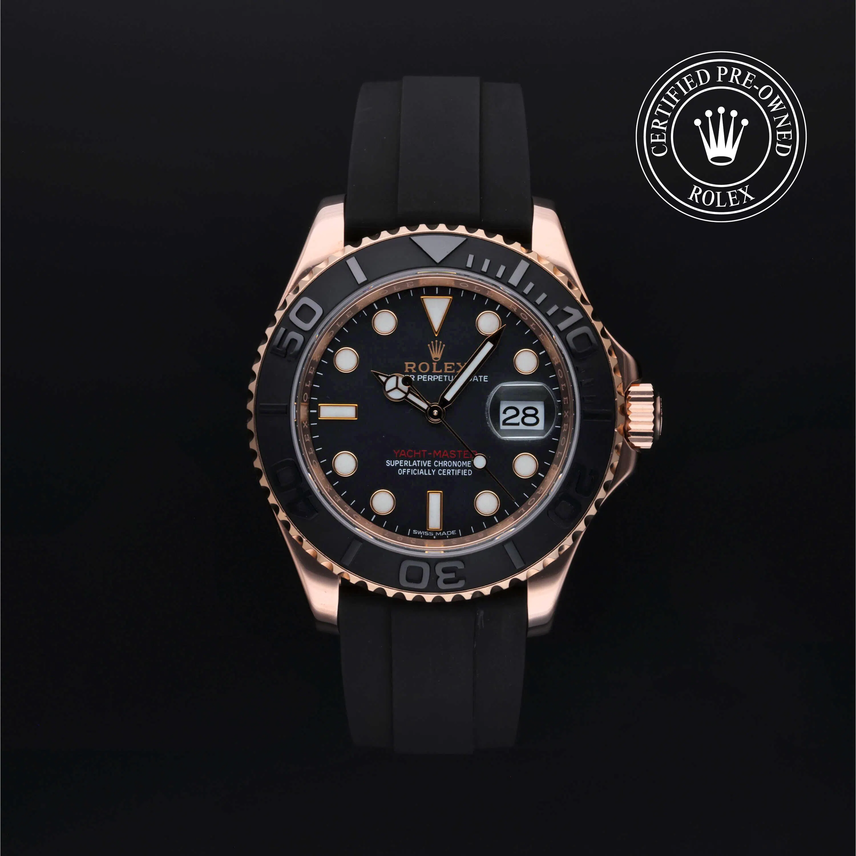 Rolex Certified Pre-Owned Yacht-Master (116655) self - winding automatic watch, features a 40mm 18k rose gold case and unidirectional rotating bezel with a matte black cerachrom insert surrounding a black dial on a black oysterflex strap with an 18k rose gold deployant buckle. Functions include hours, minutes, seconds and date. This watch has received Rolex-authorized service and certification. It does not come with the original box or papers, but includes a custom Rolex Certified Pre-Owned hang tag, travel pouch and RCPO international warranty card.