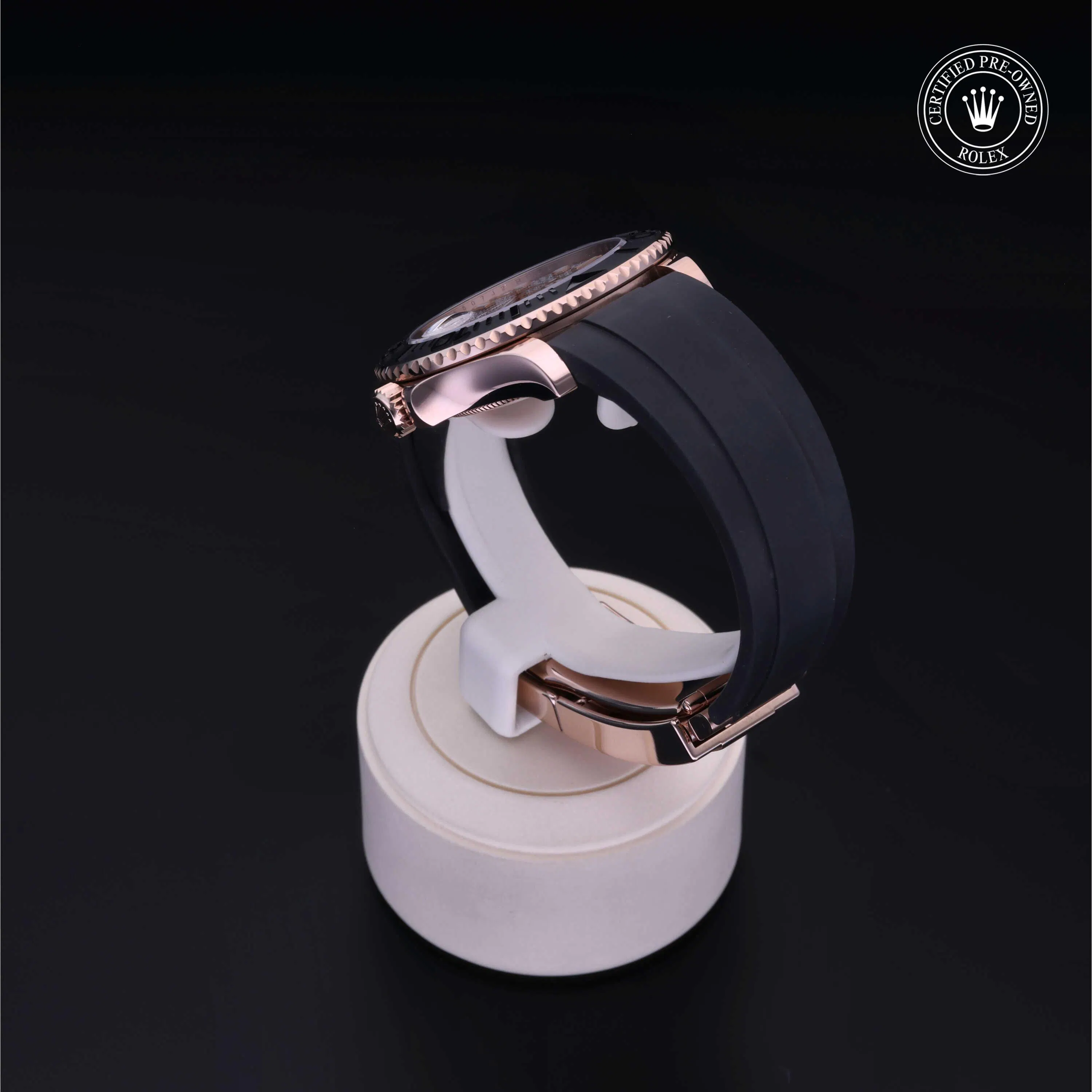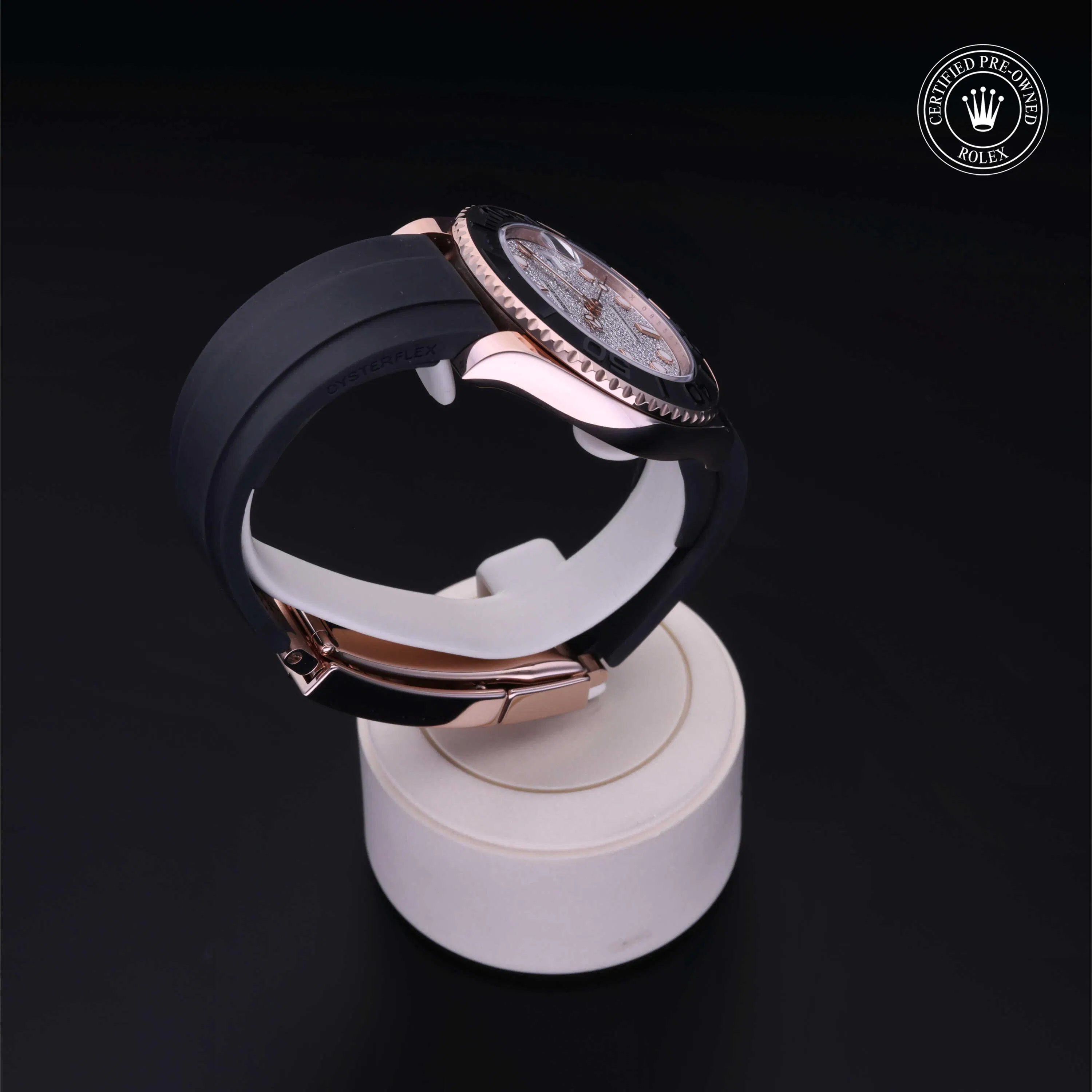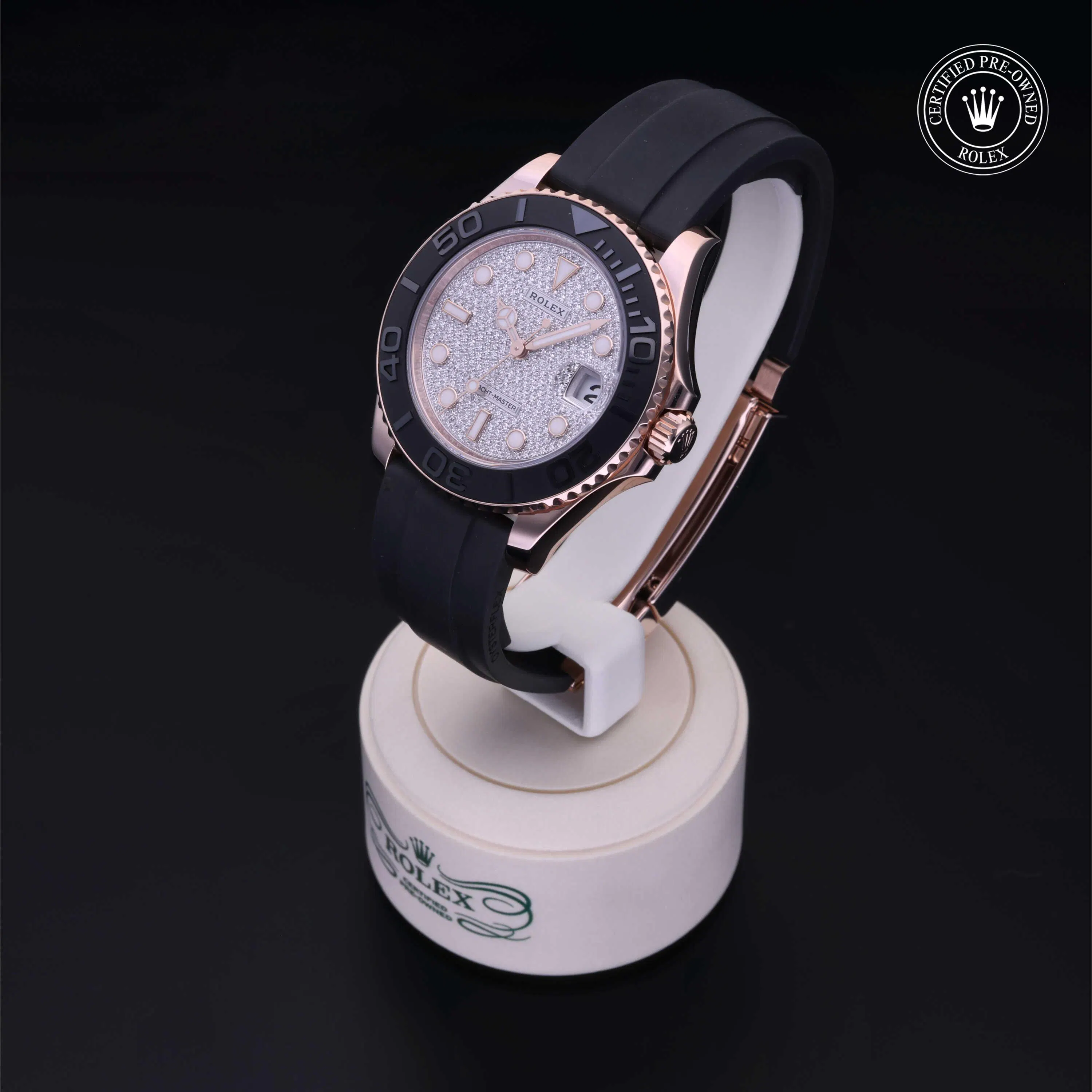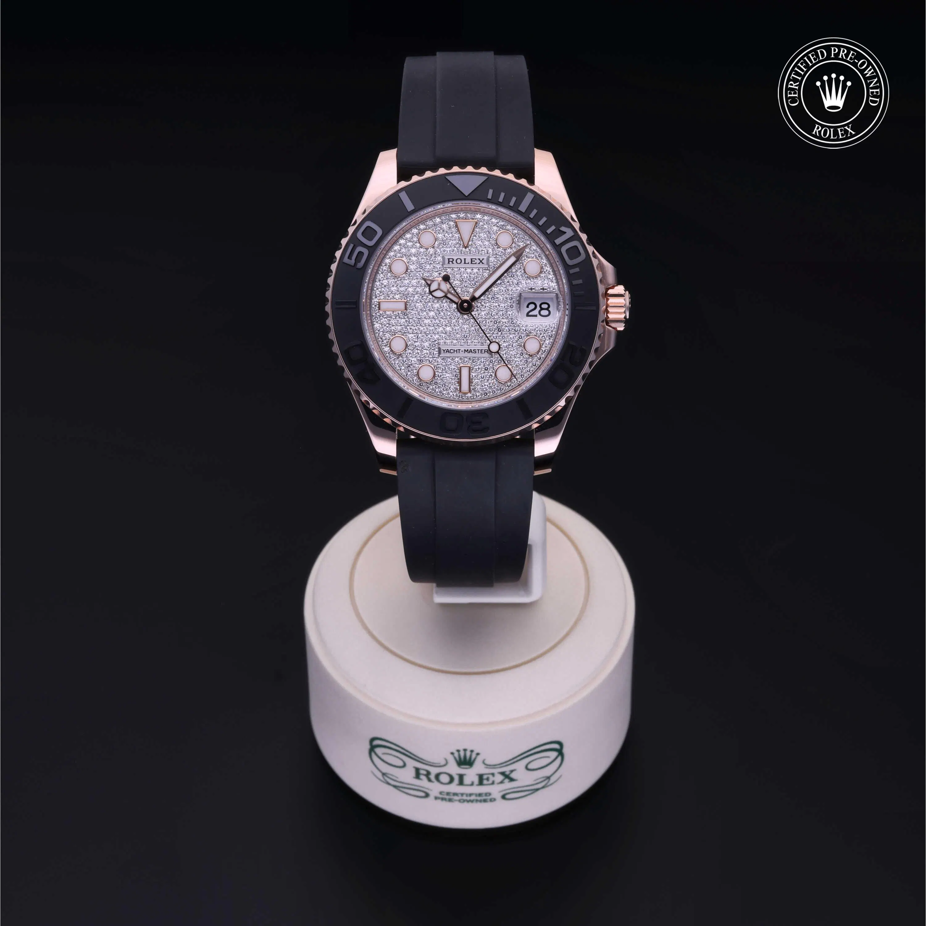 Rolex Certified Pre-Owned Yacht-Master (268655) self - winding automatic watch, features a 37mm 18k rose gold case and rotating bezel with a black cerachrom insert surrounding a full pave diamond set dial on a black oysterflex strap with an 18k rose gold deployant buckle. Functions include hours, minutes, seconds and date. This watch has received Rolex-authorized service and certification. It comes with the original papers, and includes a custom Rolex Certified Pre-Owned hang tag, travel pouch and RCPO international warranty card.