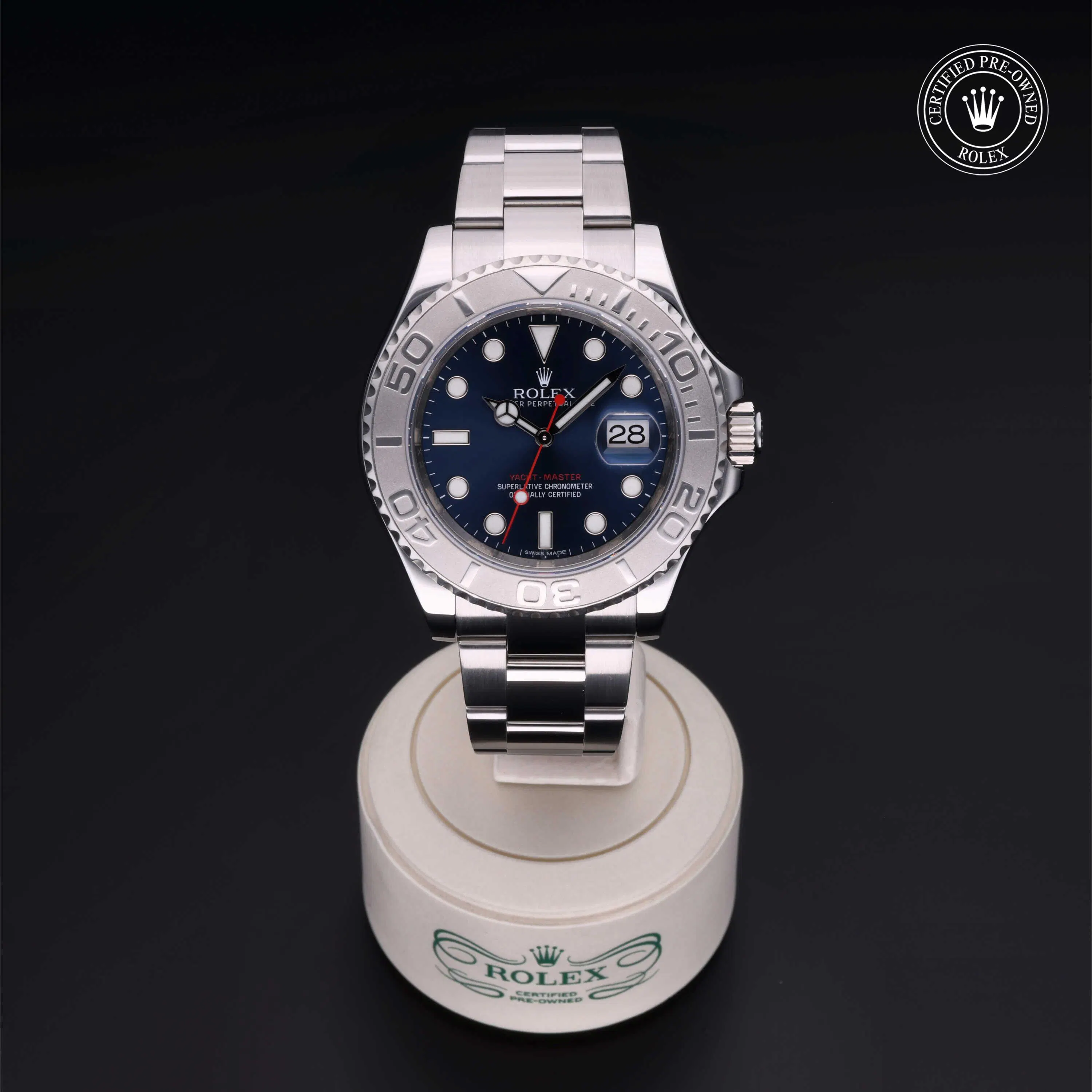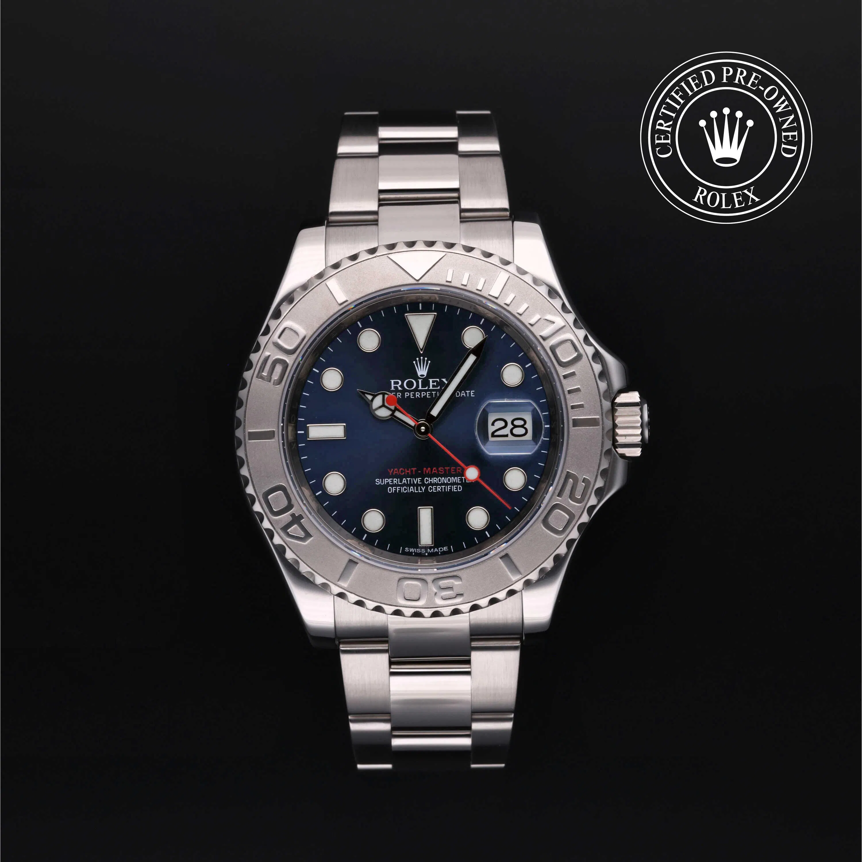Rolex Certified Pre-Owned Yacht-Master (116622) self - winding automatic watch, features a 40mm stainless steel case with a platinum bidirectional rotating 60-minute scale bezel surrounding a blue dial. The watch is secured on a stainless steel Oyster bracelet complete with a folding buckle. Functions include hours, minutes, seconds and date. This watch has been serviced by an authorized service center and certified by Rolex. It does not come with the original box or papers, but includes a custom Rolex Certified Pre-Owned hang tag, travel pouch and international warranty card.