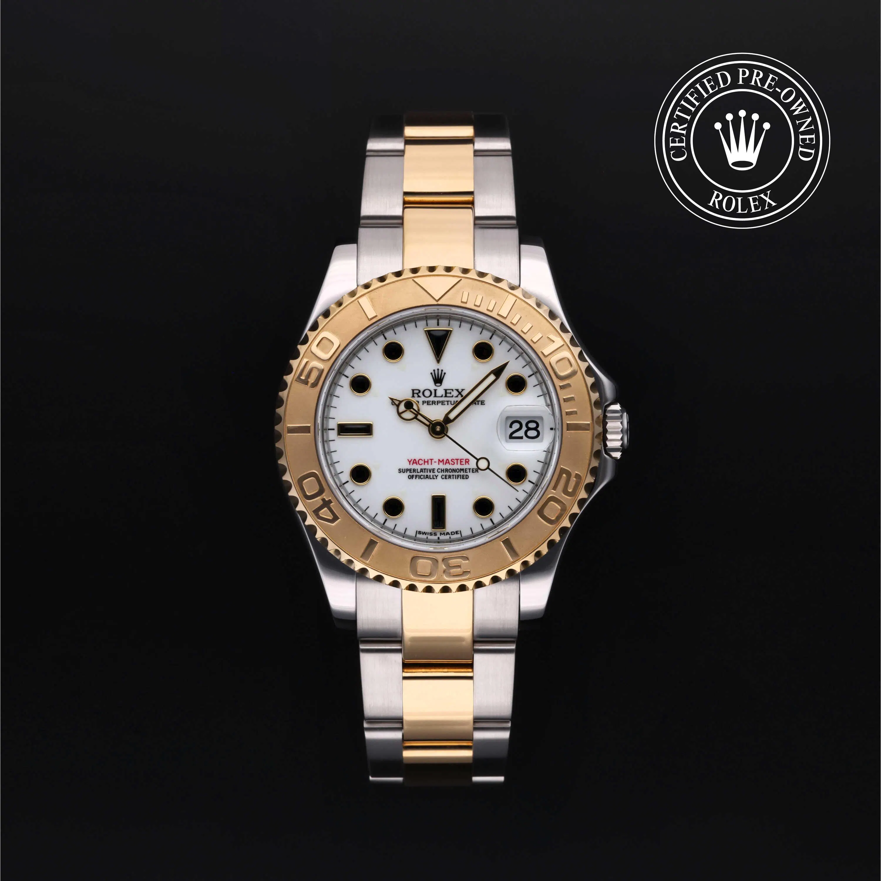 Rolex Certified Pre-Owned Yacht-Master (168623) self - winding automatic watch, features a 35mm stainless steel case with an 18k yellow gold rotating bezel surrounding a white dial on a stainless steel and 18k yellow gold Oyster bracelet. Functions include hours, minutes, seconds and date. This watch has received Rolex-authorized service and certification. It comes with the original papers, and includes a custom Rolex Certified Pre-Owned hang tag, travel pouch and RCPO international warranty card.