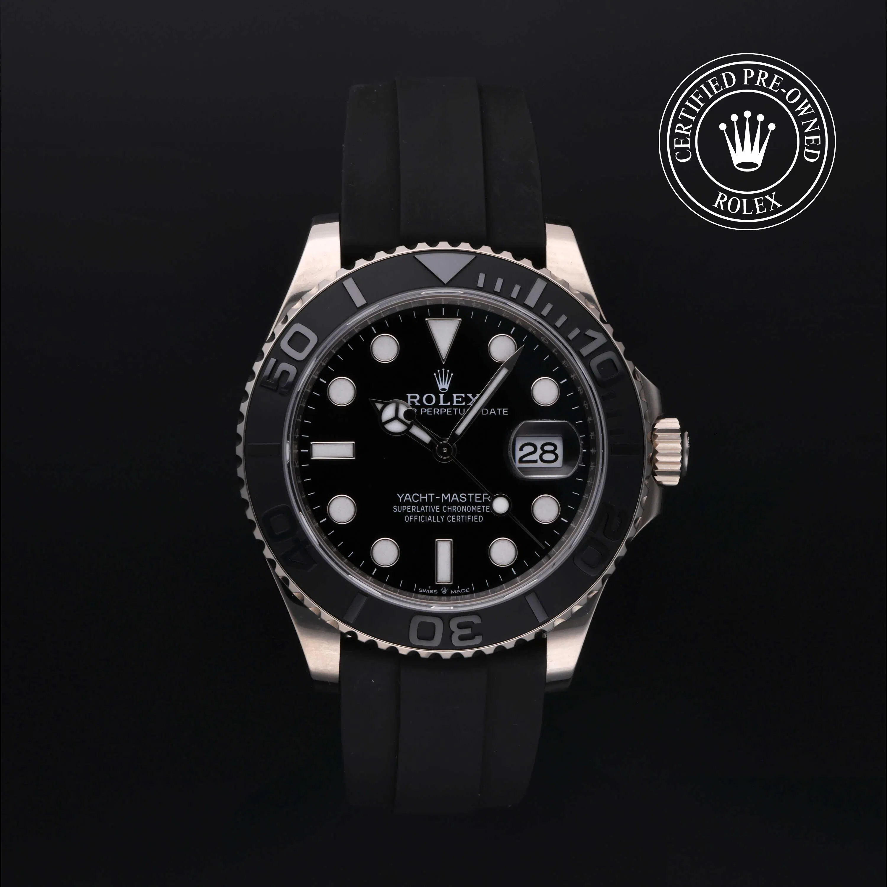 Rolex Certified Pre-Owned Yacht-Master (226659) self - winding automatic watch, features a 42mm 18k white gold case and rotating bezel with a matte black cerachrom insert surrounding a black dial on a black Oysterflex strap with an 18k white gold deployant buckle. Functions include hours, minutes, seconds and date. This watch has received Rolex-authorized service and certification. It does not come with the original box or papers, but includes a custom Rolex Certified Pre-Owned hang tag, travel pouch and RCPO international warranty card.