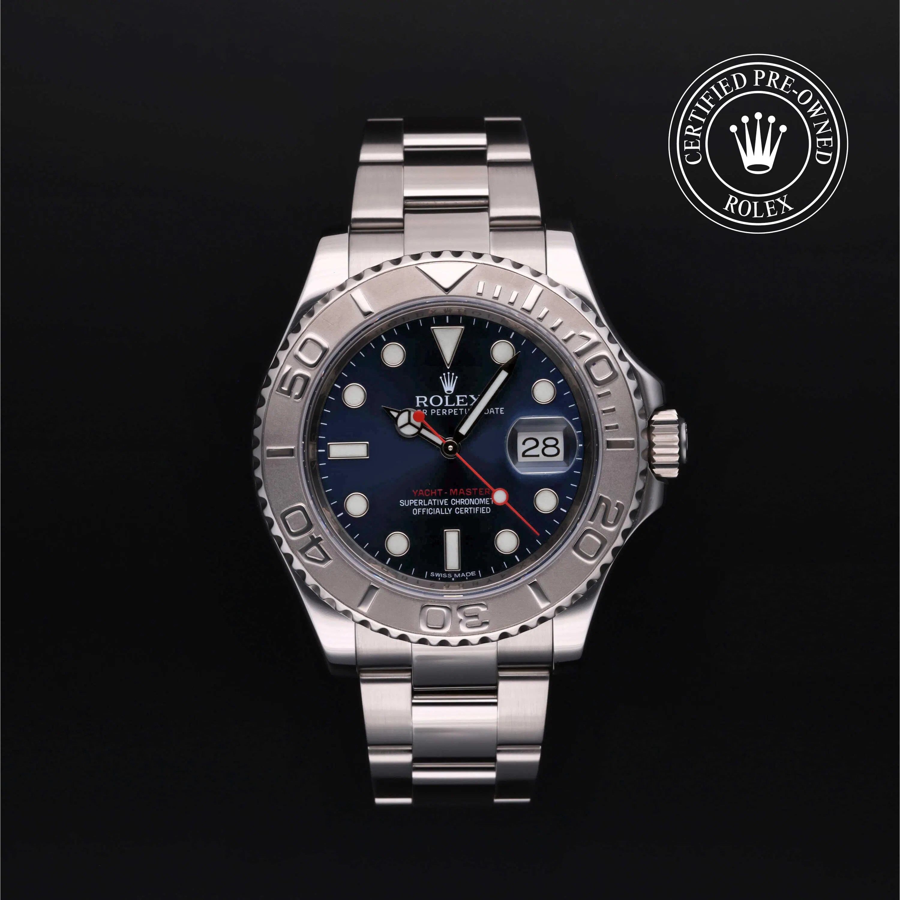 Rolex Certified Pre-Owned Yacht-Master (116622) self - winding automatic watch, features a 40mm stainless steel case with a platinum bidirectional rotating bezel surrounding a blue dial on a stainless steel Oyster bracelet. Functions include hours, minutes, seconds and date. This watch has received Rolex-authorized service and certification. It comes with the original box, and includes a custom Rolex Certified Pre-Owned hang tag, travel pouch and RCPO international warranty card.