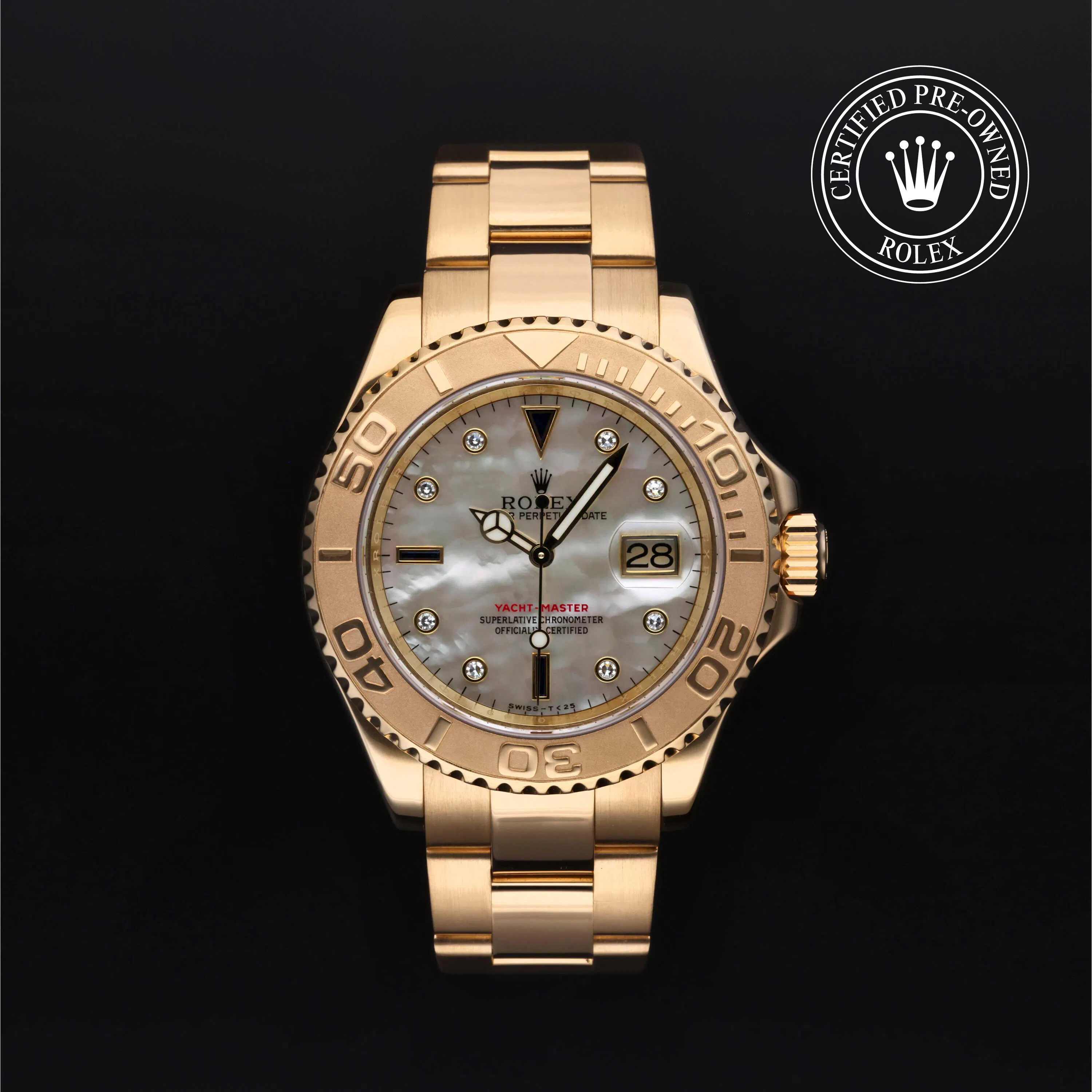 Crafted in full 18k yellow gold, this model showcases a white mother-of-pearl dial with ruby hour markers. As a used Rolex Yacht-Master with high collectibility, it combines elegance with maritime function.