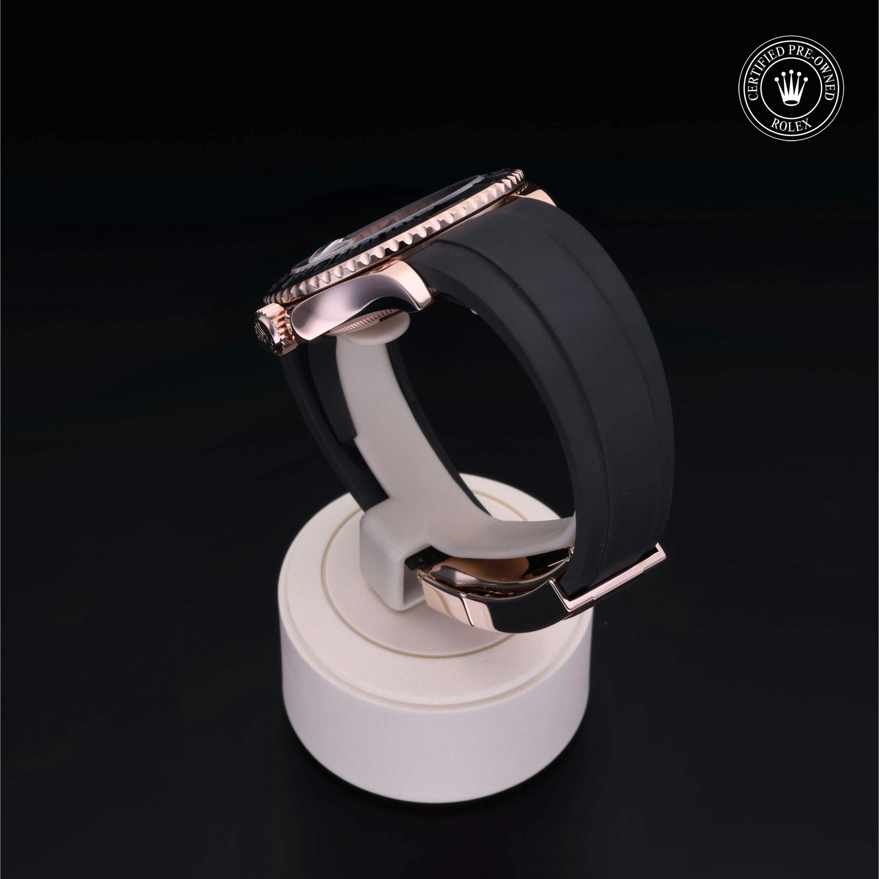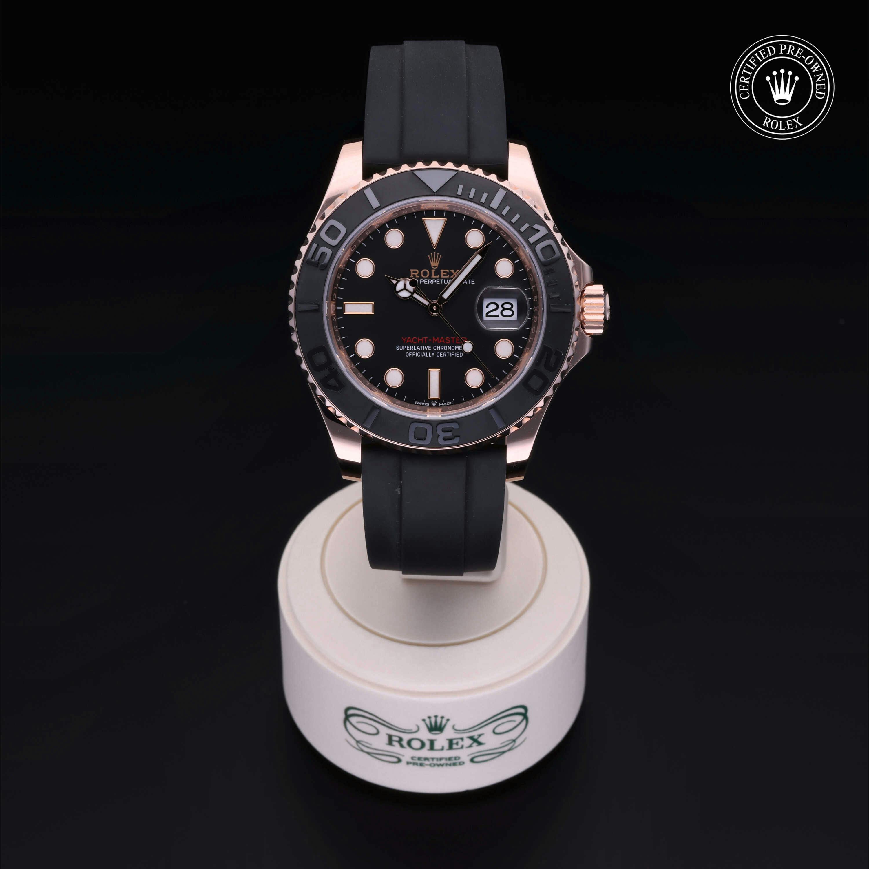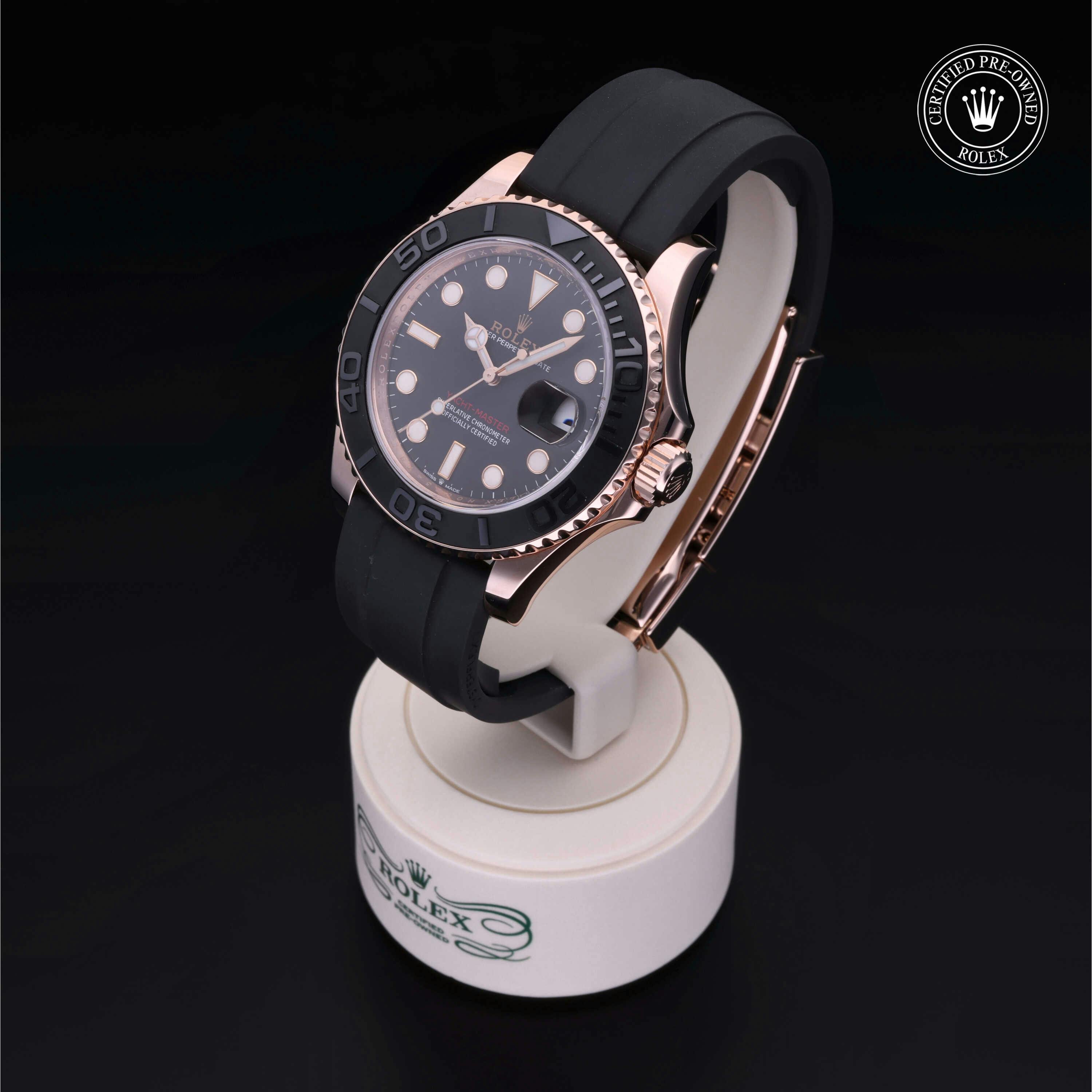 Pre-Owned Rolex Yacht-Master (126655) self - winding automatic watch, features a 40mm 18k rose gold case surrounding a black dial on a strap. Functions include hours, minutes, seconds, date This watch has been serviced and comes complete with the original box and papers. Time remaining on the Manufacturer's service warranty!