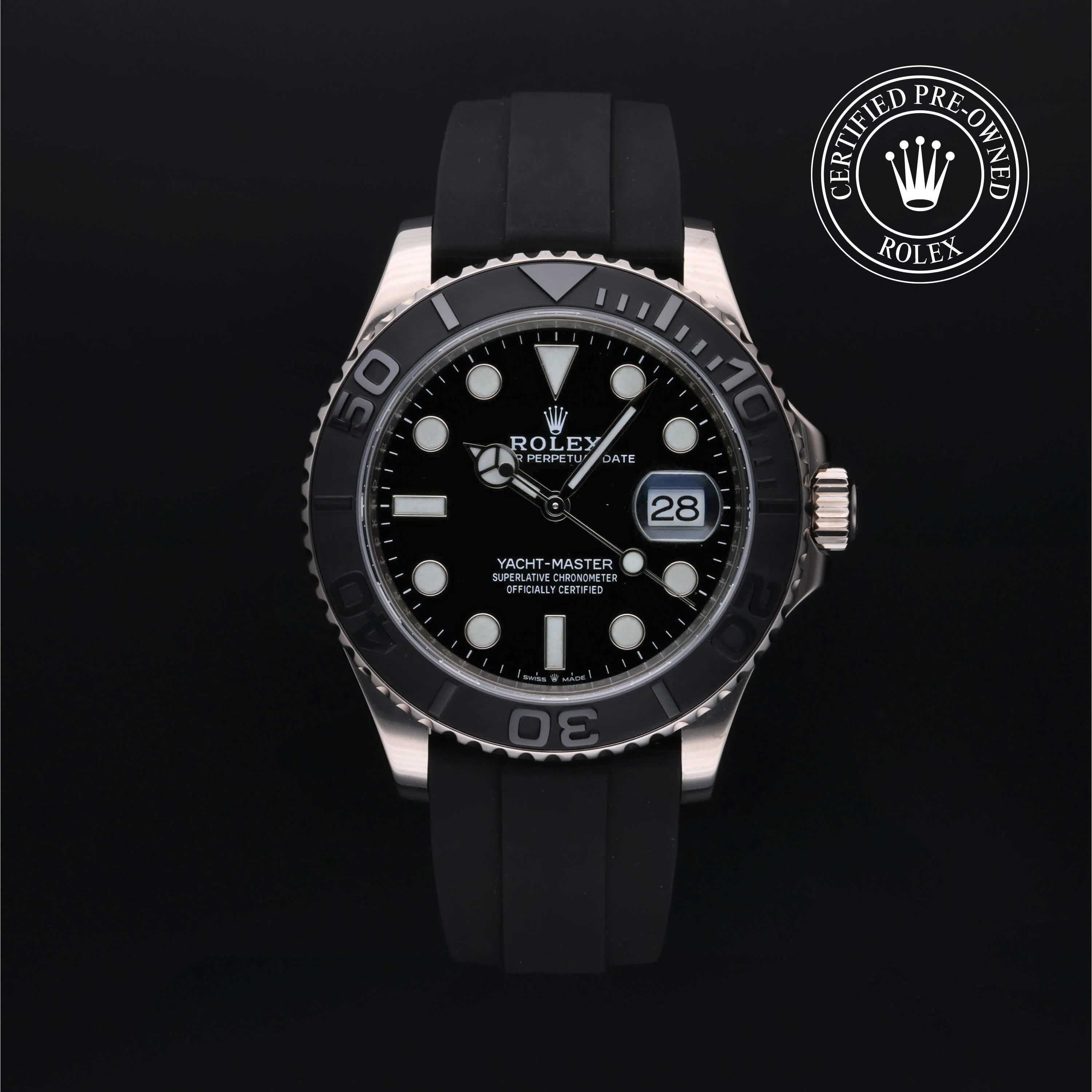 Rolex Certified Pre-Owned Yacht-Master (226659) self - winding automatic watch, features a 42mm 18k white gold case and bidirectional rotating bezel with a matte black ceramic insert surrounding a black dial on a black oysterflex strap with an 18k white gold deployant buckle. Functions include hours, minutes, seconds and date. This watch has received Rolex-authorized service and certification. It does not come with the original box or papers, but includes a custom Rolex Certified Pre-Owned hang tag, travel pouch and RCPO international warranty card.