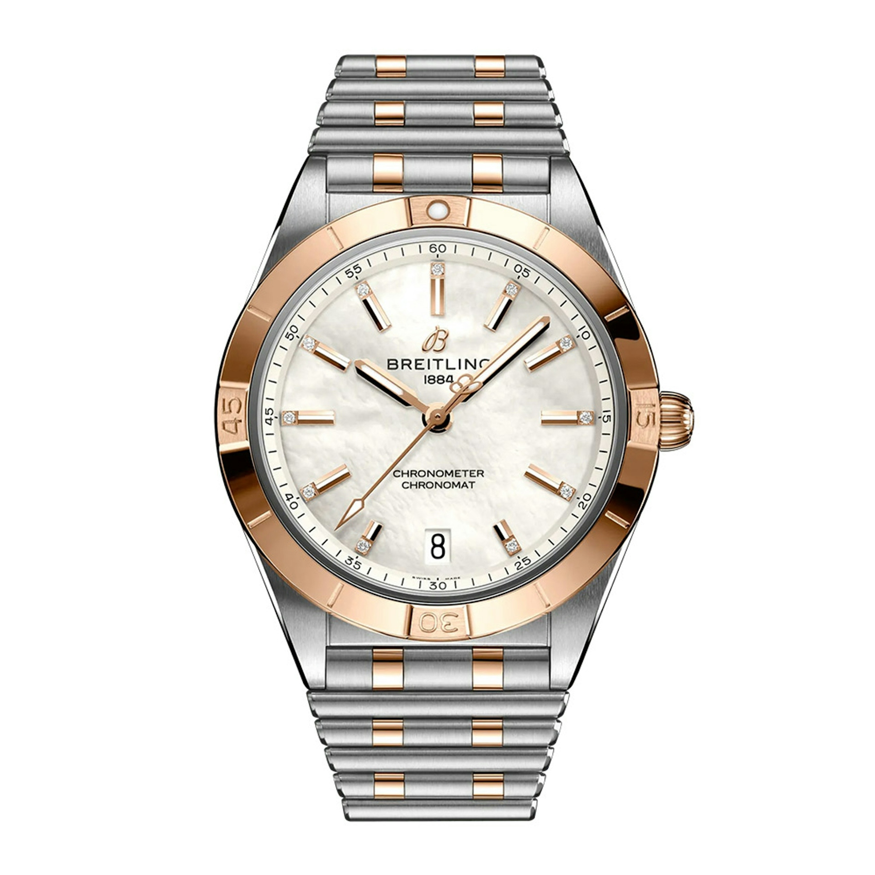 Breitling Chronomat Automatic 36 U10380101A2U1 Automatic watch features a 36mm stainless steel & 18k red gold case with a unidirectional ratcheted bezel surrounding a white mother-of-pearl dial on a stainless steel & 18k yellow gold bracelet with a folding clasp. This watch is powered by Breitling 10. Functions includehours and minutes & seconds. This watch is water resistant to 100m. The 1916 Company is an authorized dealer for Breitling and this watch includes the full manufacturer's warranty.