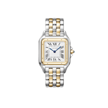 The Small Two-Tone Panthère pairs stainless steel and yellow gold for a look that's both versatile and refined. Its 22 mm case and signature bracelet construction offer lightweight comfort with bold visual contrast — a perfect choice for everyday elegance.