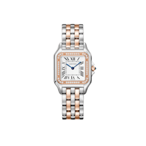 The Medium Stainless Steel Panthère measures 27 mm and features the same polished bracelet links and classic Cartier dial in a more substantial size. Balanced and bold, it offers a confident wrist presence while retaining the femininity and fluidity that define the Panthère collection.